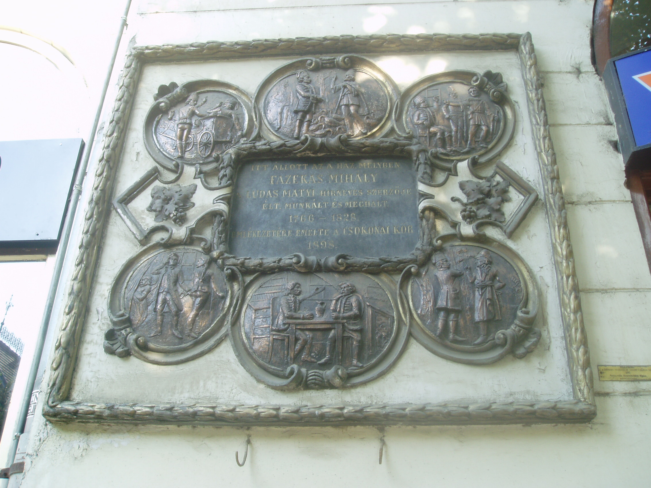 Nyilvános 1075 | 1802 | Debrecen, Piac utca 68. | Debrecen fő utcájának a vasútállomás felé eső részén Fazekas Mihály díszes emléktáblája olvasható: itt állott az a ház, amelyben Fazekas Mihály, a Lúdas Matyi hírneves szerzője élt, munkált és meghalt. A középső feliratos táblát hat ovális bronz dombormű veszi körül: öt a Lúdas Matyiból vett jeleneteket mutat be, a hatodik pedig Fazekast és jóbarátját, Csokonai Vitéz Mihályt ábrázolja borozgatás közben. Az emléktábla érdekessége, hogy alkotója Tóth Árpád költő édesapja, Tóth András szobrászművész. Fazekas Mihály 16 éves korában katonának állt, s tucatnyi harcteret küzdött végig a napóleoni háborúk idején, mígnem ráébredt, hogy neki nincs semmi keresnivalója osztrák hadseregben. 1796-ban főhadnagyi rangban nyugalomba vonult, s Debrecenben, az egykor ezen a helyen állott házban telepedett le: írt, olvasott, kertészkedett. Csokonai több ízben meglátogatta itt, s versben meghitt képet festett barátjáról:: Számlálgatja víg orcával az ezüst jácintokat, S az ibolyák aranyával a szagos gyémántokat. ............................. Majd a rendtartó méheknél Kedve telve ácsorog, S érzi, hogy az embereknél Az ország nem így forog. Már meglátott: gereblyéjét És kapáját elteszi S félig harmatos Linnéjét Pipája mellé veszi. Jer, barátom, lépegessünk Kiskertednek útjain, S dohogás nélkül nevessünk Mások bolondságain... Felh. irod.: Papp Antal: Debrecen. Bp. Panoráma, 1976 |
