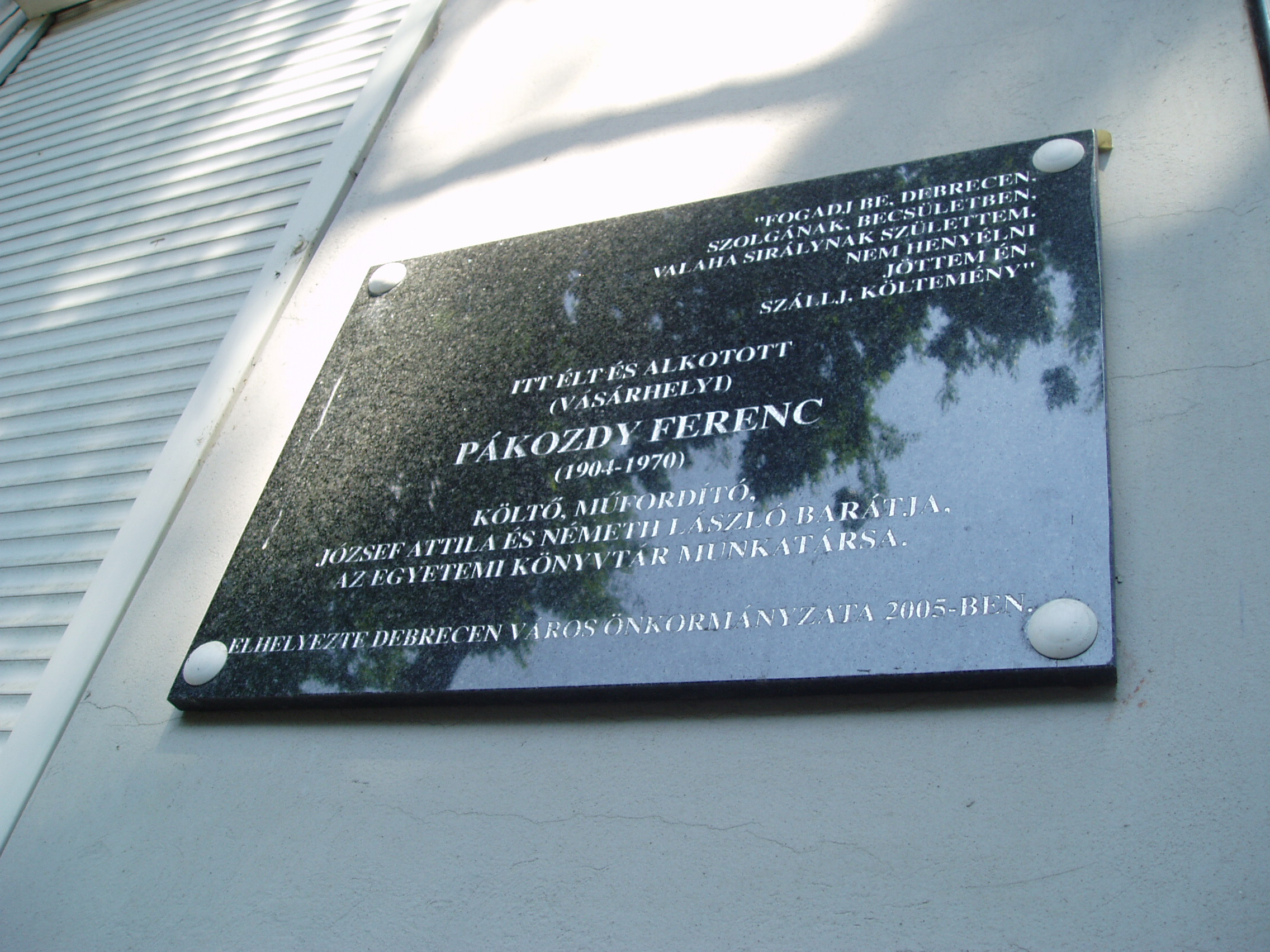 Nyilvános 1073 | 1662 | Debrecen, Darabos utca 61. | Mint az épületen elhelyezett fekete márványtáblán olvasható, ebben a házban élt és alkotott Pákozdy Ferenc (1904-1970) költő, műfordító, az Egyetemi Könyvtár munkatársa. Orvosnak készült, majd jogot hallgatott, jog- és államtudományi doktorátust szerzett. 1928–1944 között újságíró volt különböző lapoknál. 1945 után szülővárosában, Hódmezővásárhelyen dolgozott. 1952-től élt Debrecenben. A harmincas években József Attila pártfogója és értő kritikusa volt, költészete mellett a Külvárosi éj című verséről írott recenziójában állt ki (megjelent a hódmezővásárhelyi Hétfői Újságban 1933. jan. 2.án). A fénykép 2006 júniusában készült. Felh. irod.: Magyar életrajzi lexikon |
