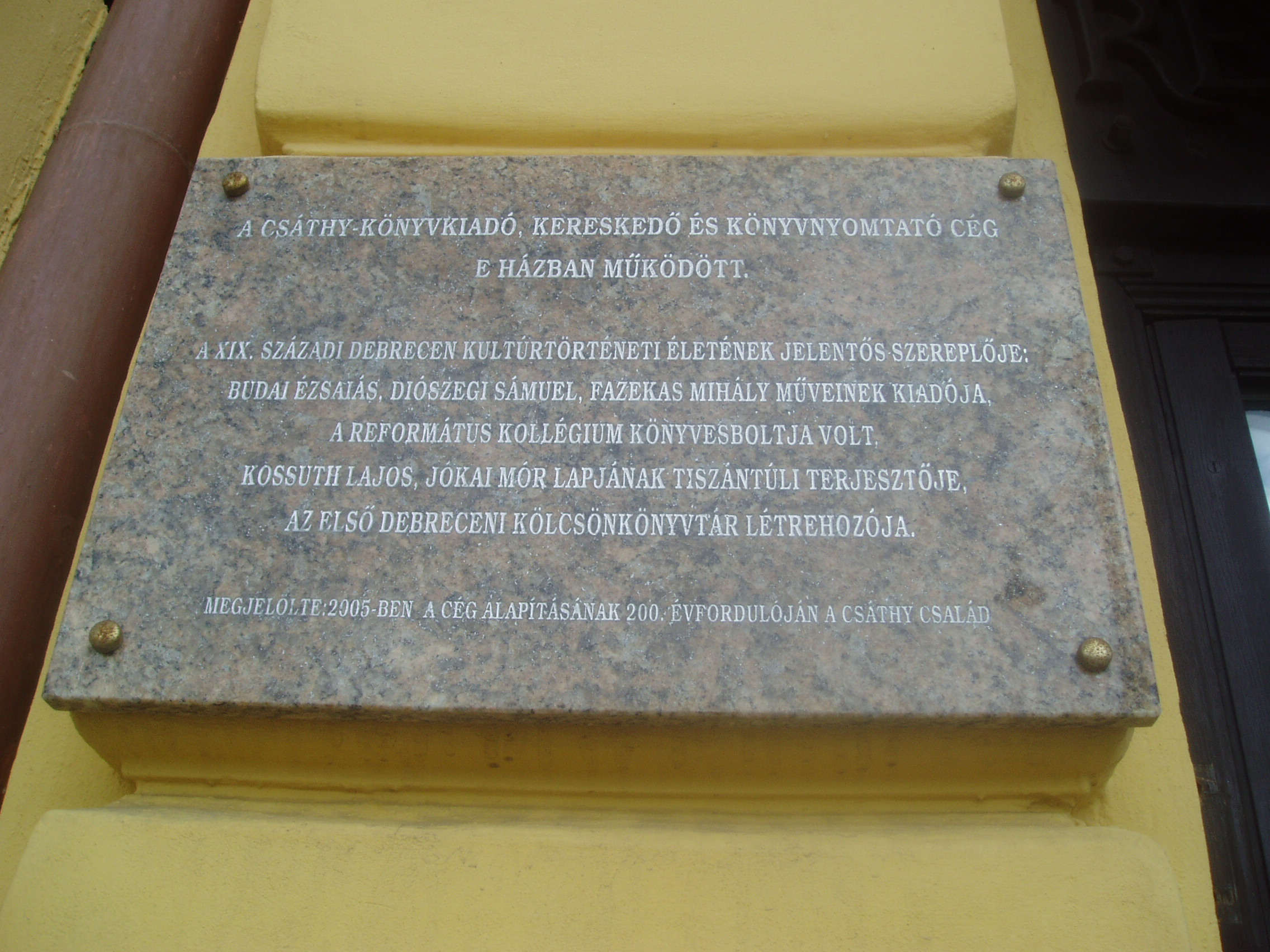 A városközpontban álló épületen emléktábla tudatja, hogy itt működött a Csáthy Könyvkiadó, a XIX. századi Debrecen kulturális életének jelentős szereplője.