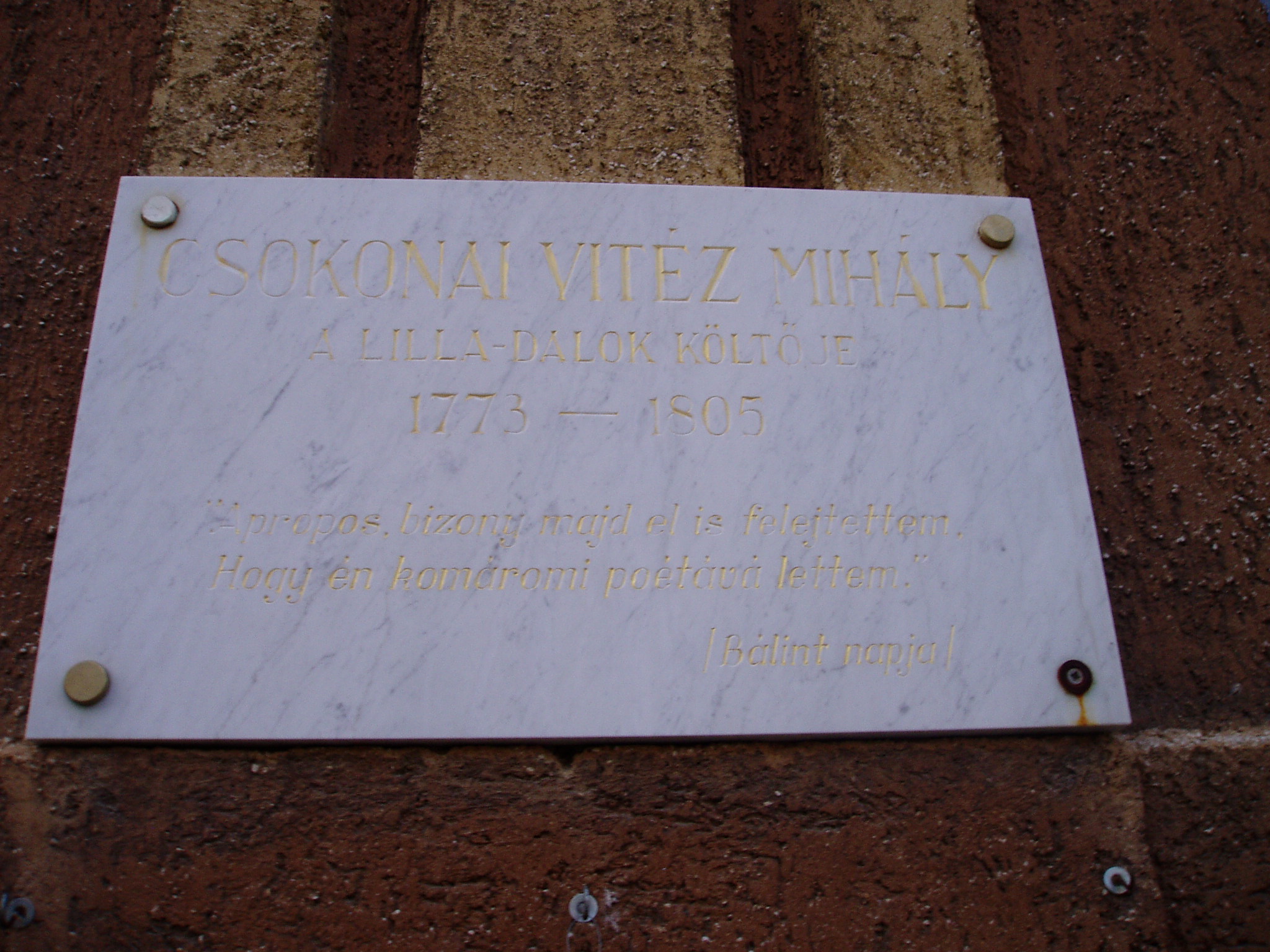 Nyilvános 1474 | 3759 | Komárom (Komárno), Jókai u. Református Kollégium, Csokonai Vitéz Mihály emléktáblája | A református templommal szemben, tágas udvar közepén áll a volt Református Kollégium történelmi épülete. Az egyemeletes, hatalmas tetőzetű, kis bádogtornyú épület 1796. december 28-án készült el. A "múzsáknak állított" iskolaépület ünnepélyes megnyitására 1797. január 2-án került sor. A komáromi kollégium - tudós tanárai révén - rövidesen olyan hírnévre tett szert, hogy nem csupán a Komárom megyei fiatalok tanultak itt, hanem számosan a szomszédos és távolabbi megyékből is. Itt kezdett iskolába járni 1831 őszén a kis Jókai Mór is. A kollégium másik irodalomtörténeti nevezetessége, hogy itt az udvaron látta meg először Csokonai Vitéz Mihály Vajda Juliannát 1797. április 26-án. Csokonai 1797 február közepén utazott Komáromba a megye első szolgabírója, Laky Bálint kérésére, aki biztatta, hogy ott a költő próbálja meg újraéleszteni a Mindenes Gyűjtemény c. folyóiratot. Akkoriban történt, hogy a Napóleon elleni háborúhoz hadba szállt a magyar nemesség is. A Komáromban gyülekezőkhöz Csokonai lelkesítő ódát írt "A nemes magyarságnak felülésére" címmel. Ezt a verset 1797. április 26-án, a Református Kollégium udvarán a város legszebb lánya, Vajda Julianna szavalta el. Ekkor személyesen még nem ismerkedtek meg, arra valamivel később, Bédi János és felesége, Fábián Julianna költőnő házánál került sor. Csokonai így írt "A fogadástétel" c. versében: Egy nyári este Lillát, A gyenge rózsaszájú, A tűzszemű leánykát Megláttam, és azonnal Látnom, szeretnem - egy vólt. A fénykép 2005. júliusában készült. Felh. irod.: Mácza Mihály: Komárom nevezetességei. Pozsony, Madách-Posonium, 2002 Bertók László: Így élt Csokonai Vitéz Mihály. Bp. Móra Kiadó, 1977 Csokonai emlékek. Szerk. Vargha Balázs. Bp. MTA Irodalomtudományi Intézet, 1960 |