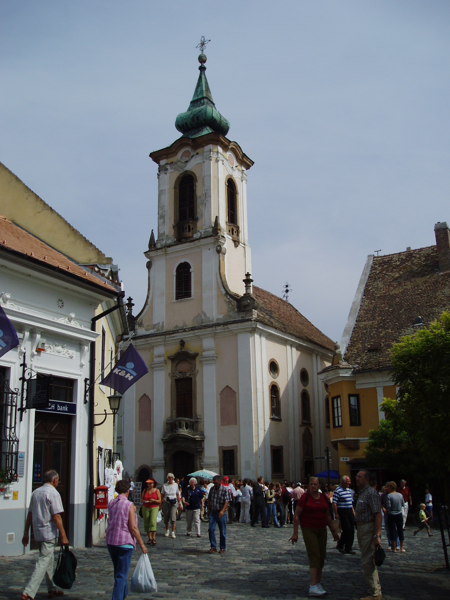 Nyilvános 1127 | 2221 | Szentendre, Fő tér: Blagovesztenszka-templom | A török elől menekülő görög kereskedők Szentendrén a Fő tér és a Duna közti területen telepedtek le. A XVII. században fatemplomot építettek, majd 1752-ben épült fel a jelenlegi épület. Minden bizonnyal Mayerhoffer András tervezte, mivel az épület hasonlóságokat mutat a pesti szerb templommal és a kalocsai Főszékesegyházzal, melyeket Mayerhoffer tervezett. A Fő tér keleti oldalán emelkedő, patinás, kelet-nyugat tengelyű épület stílusában barokk és rokokó elemek keverednek. A templom a kilenc szentendrei templom közül a legjellegzetesebb és legismertebb, a város egyik jelképe. Legnagyobb művészettörténeti értéke az arányos, harmonikus belső tér. A hajót három-szakaszos, fiókos dongaboltozat, a kórust csehsüvegboltozat fedi. A görögkeleti templomok jellegzetessége az ikonosztázion, a képfal, mely a hajót hivatott elválasztani a szentélytől, ahova csak a szertartást végzők léphetnek be. A Blagovesztenszka-templom értékes, rokokó ikonfalát Zsivkovics Mihály készítette az 1790-es években. A fénykép 2005 szeptemberében készült. Felh. irod.: www.templom.hu www.szentendre.hu Szentendre. Szerk. Sándyné Wolf Katalin. Bp. Panoráma, 1985 |