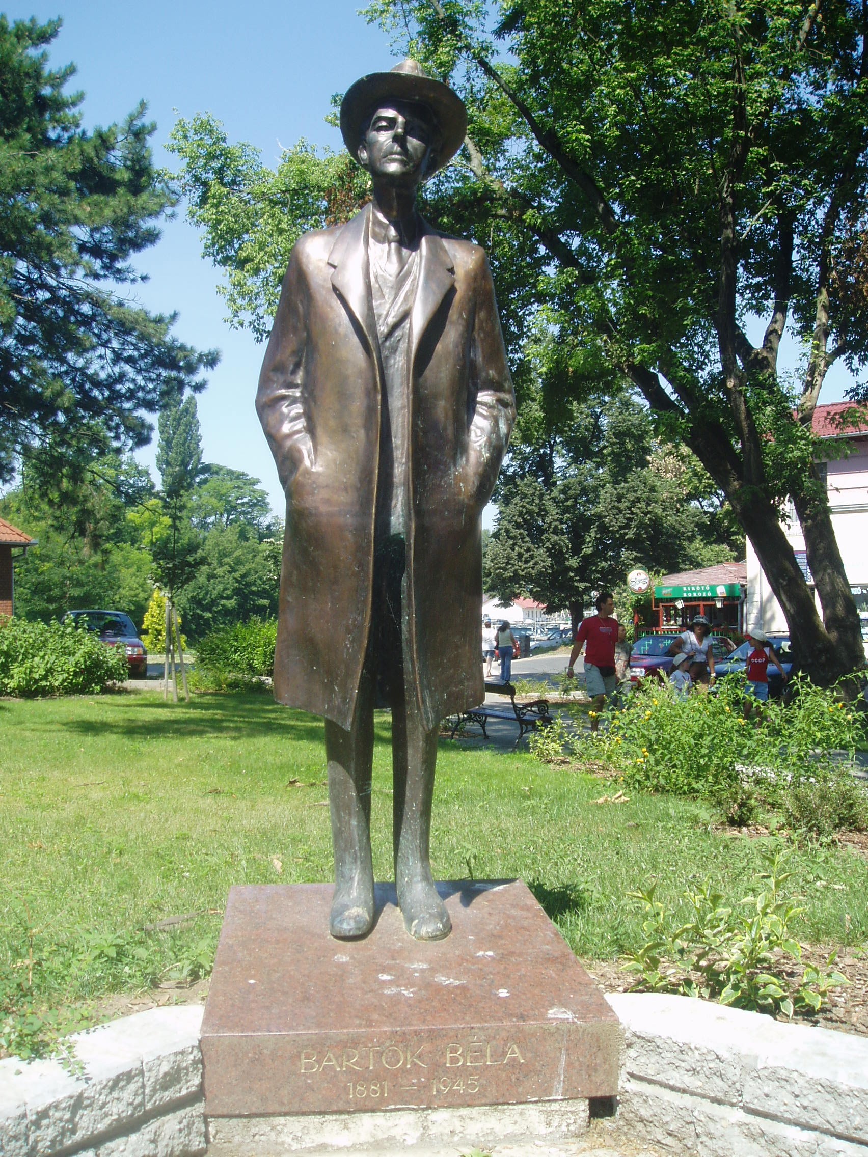 Nyilvános 1093 | 1785 | Siófok, Mártirok útja 5. | A Siófoki Művészeti Iskola (azelőtt Zeneiskola) épülete közelében, a Szent Miklós parkban áll Varga Imre siófoki születésű szobrászművész egészalakos Bartók Béla szobra. A fénykép 2006 júliusában készült. |