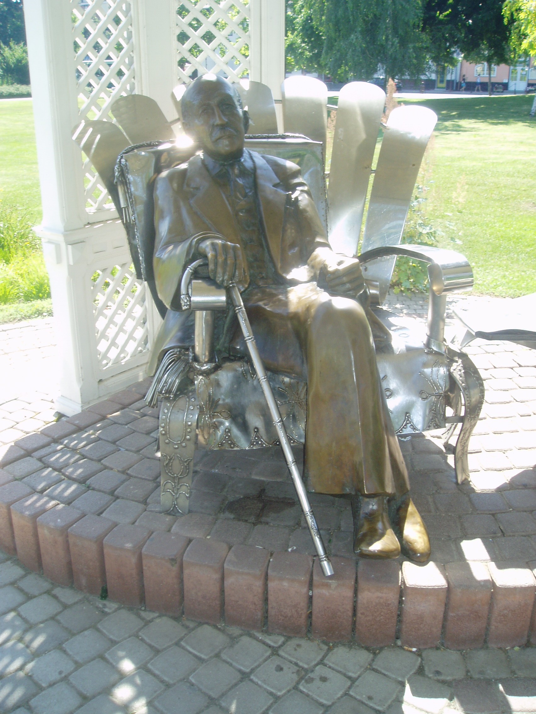 Nyilvános 1110 | 1902 | Siófok, Millennium park. Varga Imre: Kálmán Imre | Az 1920-ban épült, hajdani pompájában felújított állomásépület előtt 1994-ben készült el a 16 ezer négyzetméteres Millennium park. Gyönyörű pázsit, különleges cserjék, virágok, szobrok, tavacska, este díszkivilágítás ékesíti a területet. Itt állították fel - stílszerű környezetben, egy zenepavilonban - a város nagy szülötte (lásd: Siófok, Kálmán Imre sétány 5.), Kálmán Imre szobrát, mely karosszékben ülve, enteriőr–szerű környezetben ábrázolja a világhírű operettszerzőt. Az 1997-ben felavatott szobrot Varga Imre készítette, aki maga is siófoki születésű és számos alkotása tekinthető meg a városban (lásd: Siófok, Fő tér). Az ő alkotása a Művészeti iskola előtt álló Bartók–szobor is (lásd: Siófok, Mártirok útja 5.). A fénykép 2006 júliusában készült. http://www.siofok.hu/seta_a_varosban_hu.php |