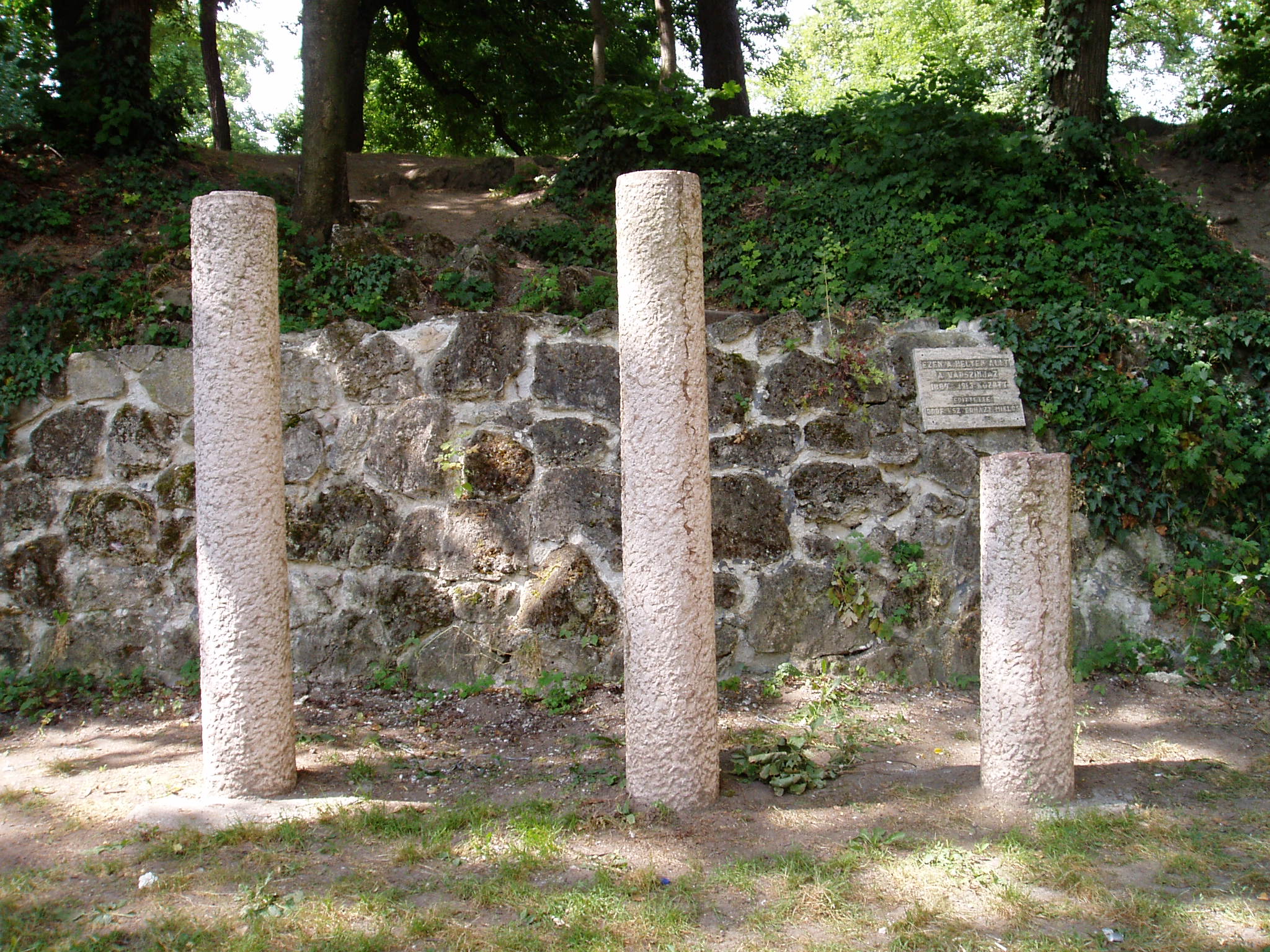 Nyilvános 1472 | 3168 | Tata, Kastély tér: a régi színház maradványai | A kastélyparkban, az Esterházy sétány nyugati oldalán, a támfal előtt három megmaradt oszlop és a falon emléktábla idézi az egykori Esterházy–kastélyszínházat. Esterházy Miklós József gróf (1839–1897) életét két nagy szenvedély kísérte: a lovassport és a művészetek iránti rajongás. Nagy vagyonából mindkét passziójára sokat költött. Tréningtelepet és versenypályát létesített, lóversenyeket rendezett. S hogy az összegyűlt főúri vendégeket kulturális élményekben is részesítse, 1888-ban létrehozta kastélyszínházát. A kis ékszerdoboz épületet a kor két neves színházépítője, Ferdinand Fellner és Hermann Helmer tervezte (az ő alkotásuk a budapesti Vígszínház is). A grófi Várszínház csak időszakosan, lóversenyszezonban játszott, méghozzá német nyelven. Műsorán kellemes korabeli vígjátékok, operettek, énekes játékok, olykor operarészletek szerepeltek. A gróf halála után megszűntek az előadások. A használaton kívüli épület állaga leromlott, s 1913-ban lebontották. Az itt felállított oszlopokon kívül az Öregvárban található Kuny Domokos Múzeumban néhány tárgyi emlék és kép idézi egykori életét. A fénykép 2005. júliusában készült. Felh. irod.: Polgárdy Géza: Tatatóváros és környéke kalauza. Az 1939-es kiadás reprintje. Tata, Móricz Zsigmond Városi Könyvtár, 1998 Staud Géza: Magyar kastélyszínházak 3. kötet. Bp. Színháztudományi Intézet - Országos színháztörténeti Múzeum, 1964 |