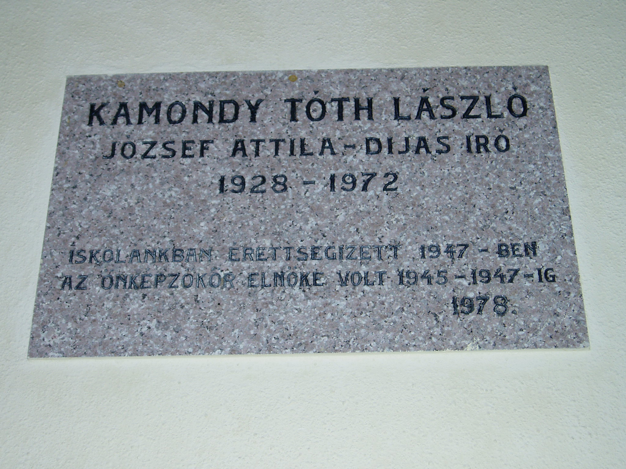 Nyilvános 1403 | 3251 | Tata, Tanoda tér 5. Eötvös József Gimnázium: Kamondy László emléktáblája | A tatai gimnáziumot 1765-ben gróf Esterházy Miklós alapította, s vezetésére a piarista tanítórendet kérte fel. Az iskola kezdetben a közeli majki kamalduli szerzetesek többször is átalakított gazdasági épületeiben működött. A jelenlegi iskolaépületet a XX. század elején emelték, 1912-ben kezdődött meg benne a tanítás. Az első emeleti folyosó falán neves egykori tanárok és diákok emléktábláit helyezték el. Kamondy László (1928-1972) József Attila-díjas író - eredeti nevén Tóth László - itt érettségizett 1947-ben. 1945 és 1947 között az iskolai önképzőkör elnöke volt. A fénykép 2005. júliusában készült. Felh. irod.: www.eotvos-tata.sulinet.hu Wehner Tibor: Tatai szobrok, emlékművek, emléktáblák. Tata, 1980 |