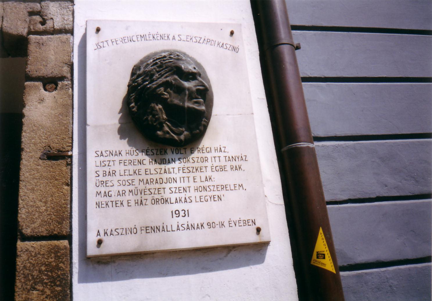 Nyilvános 1031 | 1701 | Szekszárd, Széchenyi utca 36-38. Augusz-ház | Az Augusz–család egykori kúriája, amelyben négy alkalommal vendégeskedett Liszt Ferenc, három eltérő korú épületrészből áll. Legrégebbi része a jelenleg kékesszürkére festett déli szárny. Id. Augusz Antal 1820 körül építtette, az ő fia volt Liszt barátja, a később bárói címet kapott Augusz Antal. Az épület három homokkő oszlopon nyugvó középső része az 1830-as évekből való. A trieszti Miramare–kastély által ihletett rózsaszínű, tornyos északi szárnnyal pedig az 1860-as években bővíttette otthonát az ekkor már bárói címmel felruházott Augusz Antal. Ezt az épületrészt a szekszárdi Stann Jakab tervezte. Ennek a szárnynak első emeletén voltak Liszt Ferenc kertre néző lakosztályának szobái. A helyi hagyomány szerint az idősebb Augusz idejében ebben házban szolgált az az egykori katona, akiről Garay Háry János alakját mintázta. Liszt Ferenc négy alkalommal töltött rövidebb–hosszabb időt Szekszárdon ebben a házban Augusz Antal vendégeként (1846, 1865, 1870, 1876). Később az épületben működött a szekszárdi kaszinó, s ennek keretében az ország első közgazdasági és társadalomtudományi szakkönyvtára. 1973 óta a Liszt Ferenc Zeneiskola otthona. Az épület középső szárnyának városközpont felé eső homlokzatán 1931-ben leplezték le Liszt Ferenc portrédomborművel díszített emléktábláját, Wigand Edit alkotását. A verset Bodnár István, a kaszinó igazgatója írta. A fénykép 2006 júliusában készült. Felh. irod.: www.szeki.hu/turista/kalauz/magyar/tu000012.htm www.csatolna.hu/hu/tolnamegye Vendel–Mohay Lajosné: Liszt–emlékek Szekszárdon. Szekszárd, 1986 |