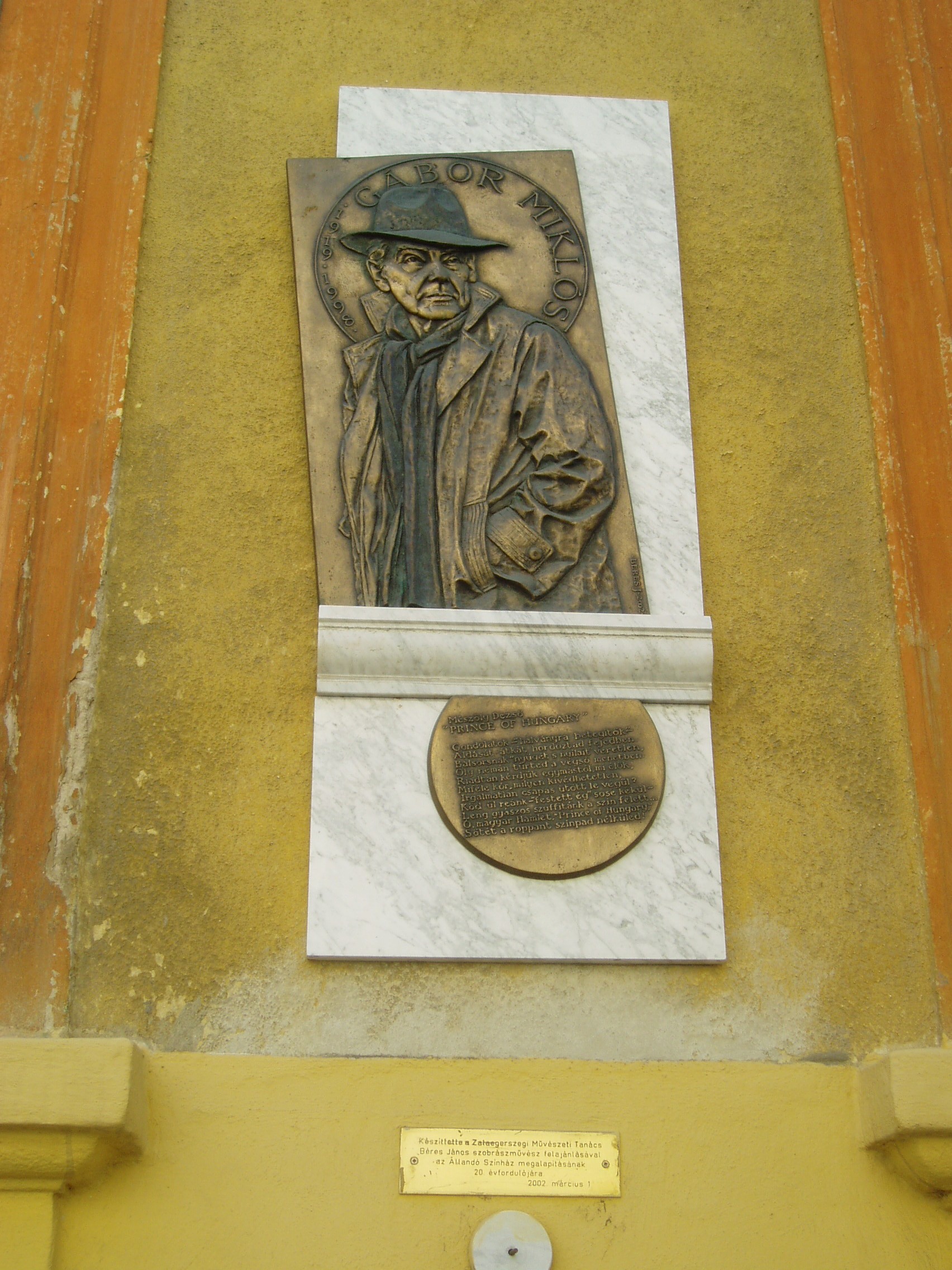 Nyilvános 1258 | 2551 | Zalaegerszeg, Ady utca 9. | Ebben a házban született 1919. április 7-én Gábor Miklós (1919-1998) színművész, rendező, író. Apja, Gábor Béla mozit üzemeltetett a városban Edison Filmszínház néven (az Arany Bárány szálloda háta mögötti épület 1945 után leégett). 1926-ban a család Székesfehérvárra költözött. Az ország egyik legnagyobb színészeként számon tartott művész 1983-ban visszatért szülővárosába: Ruszt József rendezésében az újonnan alapított zalaegerszegi színház állandó épületének megnyitó előadásán Lucifer szerepét játszotta Madách Imre: Az ember tragédiája című művében. A művész 1982-84 között a színház művészeti tanácsadója is volt. A szülőházán elhelyezett emléktábla domborműve legendássá vált modern, puhakalapos Luciferként örökítette meg. A felvétel 2006 júniusában készült. Felh. irod.: Zalai életrajzi lexikon. = http://zalai.dfmk.hu/zalaiak |