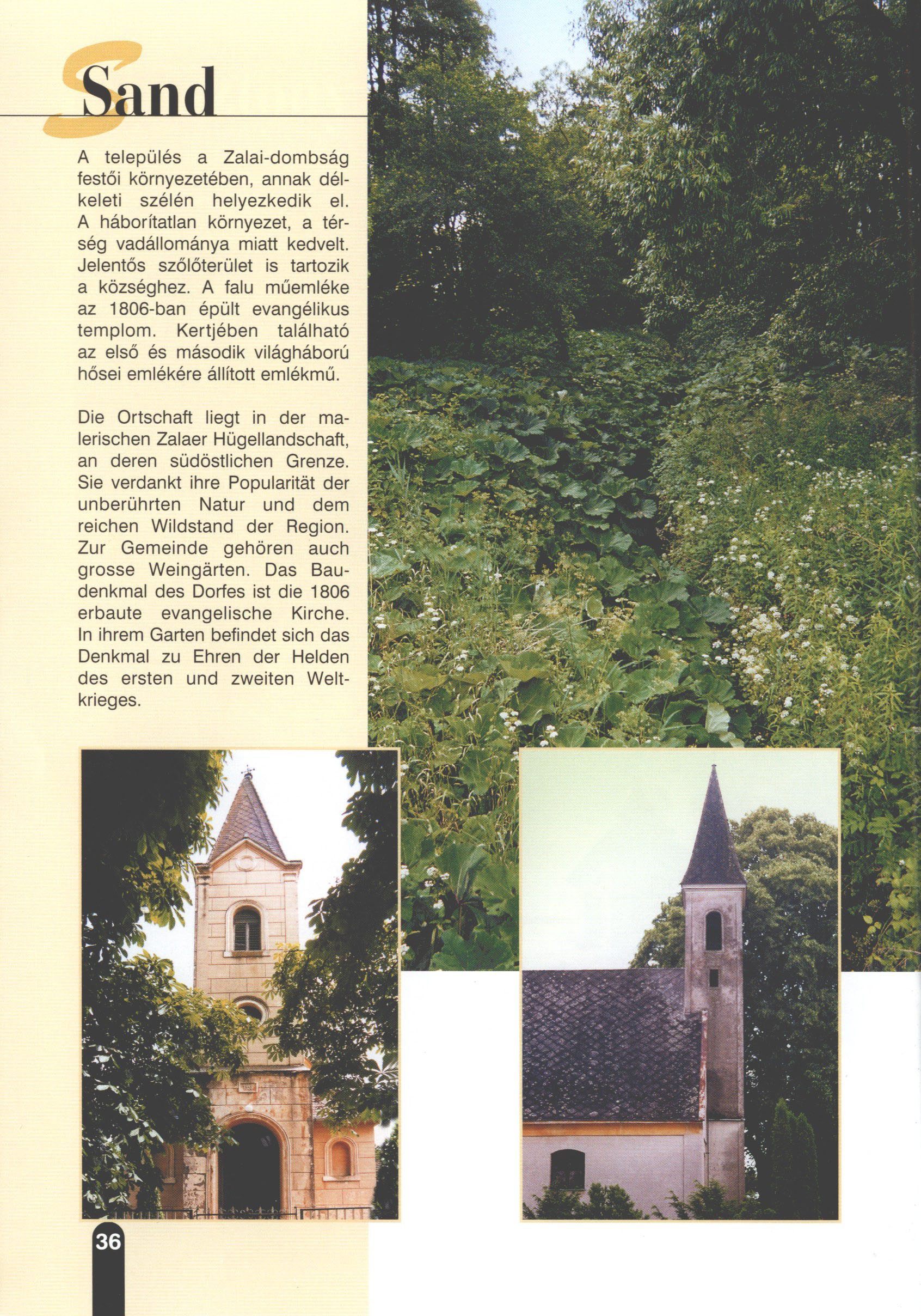 Nyilvános 2453 | 7517 | Sand | Die Ortschaft liegt in der malerischen Zaiaer Hügellandschaft, an deren südöstlichen Grenze. Sie verdankt ihre Popularität der unberührten Natur und dem reichen Wildstand der Region. Zur Gemeinde gehören auch grosse Weingärten. Das Baudenkmal des Dorfes ist die 1806 erbaute evangelische Kirche. In ihrem Garten befindet sich das Denkmal zu Ehren der Helden des ersten und zweiten Weltkrieges. Dieses Text stammt von: Titel: Hívogató a Régiók Kapujában - Útikönyv Látnivalók Nagykanizsán és Térségében (Einladend in dem Tor des Gebiets - Reisebuch - Sehenswürdigkeiten in Nagykanizsa und Umgebung) Herausgegeben von: Nagykanizsa és a Környező Települések Területfejlesztési Társulása (Verein für Gebietsentwicklung in Nagykanizsa und in ihrer Umgebung) 8800 Nagykanizsa, Petőfi Sándor út 5. Tel.: 06 93/536-453 • 06 93/536-454 Tel ./Fax: 06 93/326-323 E-mail: terstars@axelero.hu www.kanizsaterseg.celodin.hu |