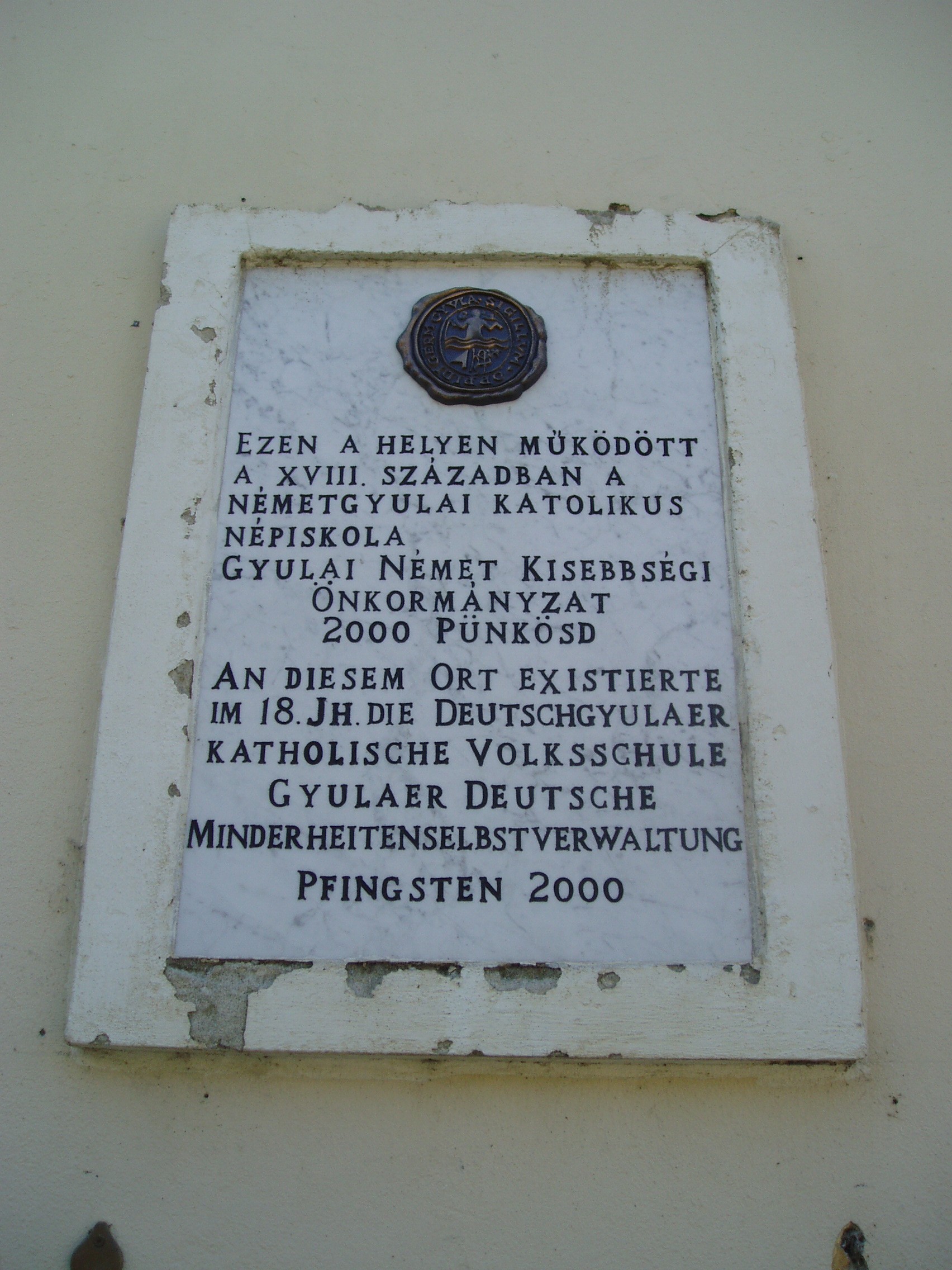 Nyilvános 1348 | 2958 | Gyula, Apor Vilmos tér 1. | Az egykori Németgyula központja az Apor Vilmos mártír püspökről, az egykori gyulai plébánosról elnevezett tér. Meghatározó eleme a közepén álló Szent József-templom, illetve néhány körülötte álló XVIII-XIX. századi épület. Ezek egyike, az egykori németgyulai városháza látható a képen. Régebbi szárnya 1820 körül épült klasszicista stílusban, s 1857-ig ebben működött a városháza. A bal oldali klasszicizáló szárnyat 1874-ben toldották hozzá. Gyula és Németgyula egyesítése óta iskola működik benne. A bejárat mellett emléktábla jelzi, hogy itt, a tanítói lakban született dr. Scherer Ferenc (1889-1987), Gyula városának monográfusa, mely mindmáig az egyik legjobb magyarországi városmonográfia. A másik, kétnyelvű emléktáblát a gyulai németek betelepítésének 270. évfordulója alkalmából helyezték el 1994-ben. A fénykép 2007 júliusában készült. Felh. irod.: Czeglédi Imre: Gyula útikalauz. 2. bőv. kiad. Gyula, 1995 |