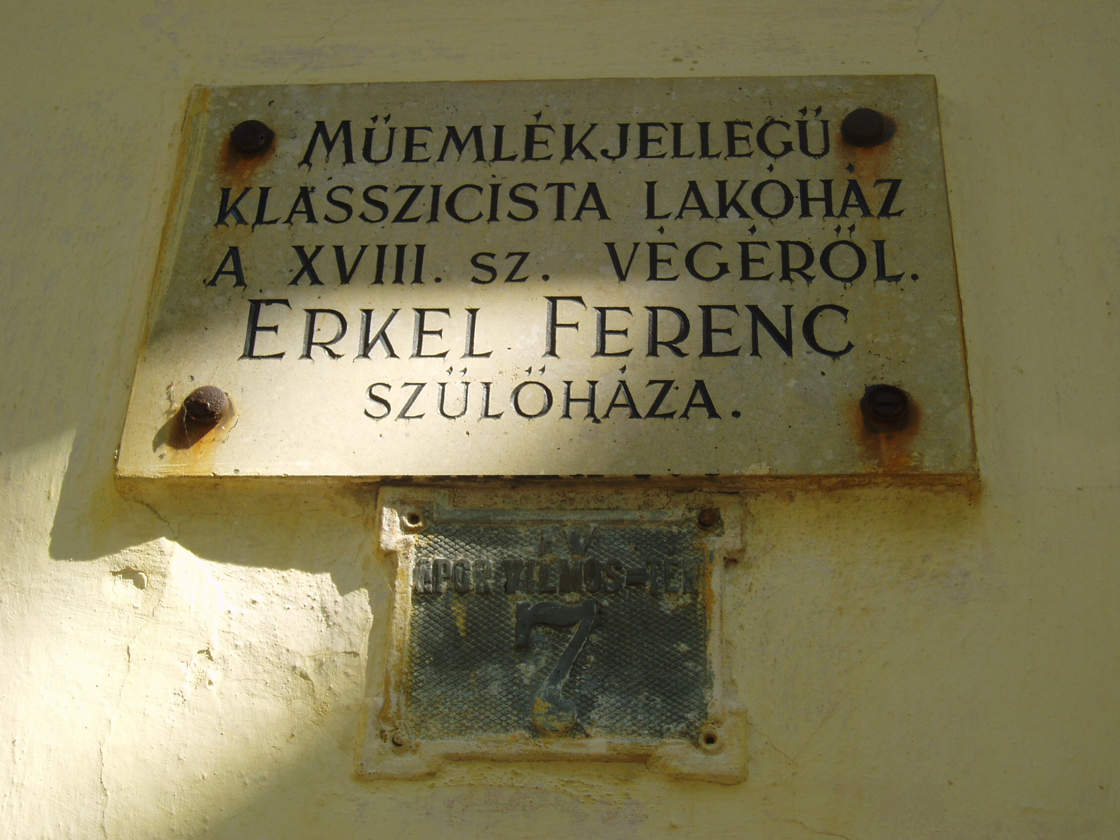 Nyilvános 1338 | 2849 | Gyula, Apor tér 7. Erkel Ferenc szülőháza | A földszintes, klasszicista jellegű németgyulai iskola és kántortanítói lakás 1795-ben épült. Az L alakú épület Apor térre néző szárnya volt az iskola, a Dürer utcára néző pedig a tanítói lakás, melynek ablakai közül kettő a térre néz. Ebben a házban született 1810. november 7-én Erkel Ferenc a németgyulai tanító fiaként, s testvéreivel együtt itt nevelkedett szeretetteljes családi légkörben. Első zenei tanítója remekül muzsikáló édesapja volt. Már néhány héttel Erkel halála után, 1893. július 5-én a házat emléktáblával jelölték meg, amelyet 1910-ben, születésének centenáriumán a most is látható díszesebbre cserélték. A korábbi tantermek helyén először 1960-ban rendeztek kiállítást, majd 1970-ben nyílt meg az Erkel Ferenc Emlékmúzeum. 1985-ben kibővítették, múzeumnak rendezték be az eredeti tanítói lakás helyiségeit is, köztük azt a sarokszobát, amelyben Erkel született. Az Emlékház gyűjteményében megtekinthetőek az Erkel család relikviái, s itteni életkörülményeikbe is bepillanthat a látogató. A fénykép 2007 júliusában készült. Felh. irod.: Czeglédi Imre: Gyula útikalauz. 2. bőv. kiad. Gyula, 1995 Czeglédi Imre: Erkel Ferenc Emlékház /Tájak, korok, múzeumok 238./ Németh Csaba: A gyulai Erkel Ferenc Múzeum Erkel–gyűjteménye. Gyula, 2007. /Gyulai katalógusok 12./ |
