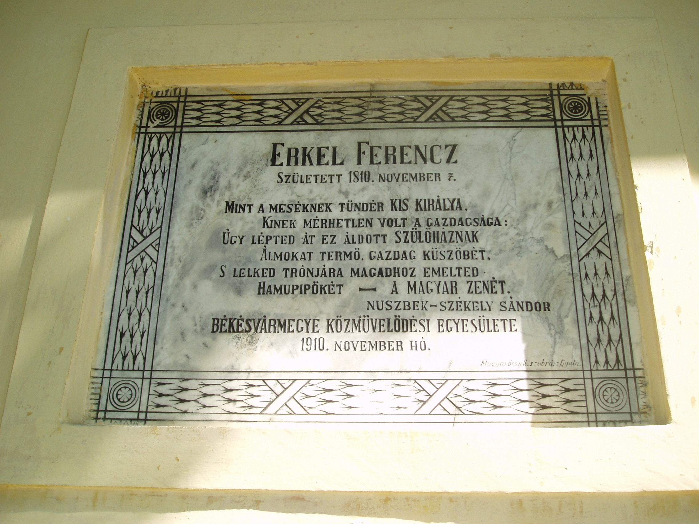 Nyilvános 1369 | 2936 | Gyula, Apor tér 7. Erkel Ferenc szülőháza | A földszintes, klasszicista jellegű németgyulai iskola és kántortanítói lakás 1795-ben épült. Az L alakú épület Apor térre néző szárnya volt az iskola, a Dürer utcára néző pedig a tanítói lakás, melynek ablakai közül kettő a térre néz. Ebben a házban született 1810. november 7-én Erkel Ferenc a németgyulai tanító fiaként, s testvéreivel együtt itt nevelkedett szeretetteljes családi légkörben. Első zenei tanítója remekül muzsikáló édesapja volt. Már néhány héttel Erkel halála után, 1893. július 5-én a házat emléktáblával jelölték meg, amelyet 1910-ben, születésének centenáriumán a képen is látható díszesebbre cserélték. A korábbi tantermek helyén először 1960-ban rendeztek kiállítást, majd 1970-ben nyílt meg az Erkel Ferenc Emlékmúzeum. 1985-ben kibővítették, múzeumnak rendezték be az eredeti tanítói lakás helyiségeit is, köztük azt a sarokszobát, amelyben Erkel született. Az Emlékház gyűjteményében megtekinthetőek az Erkel család relikviái, s itteni életkörülményeikbe is bepillanthat a látogató. A fénykép 2007 júliusában készült. Felh. irod.: Czeglédi Imre: Gyula útikalauz. 2. bőv. kiad. Gyula, 1995 Czeglédi Imre: Erkel Ferenc Emlékház /Tájak, korok, múzeumok 238./ Németh Csaba: A gyulai Erkel Ferenc Múzeum Erkel–gyűjteménye. Gyula, 2007. /Gyulai katalógusok 12./ |