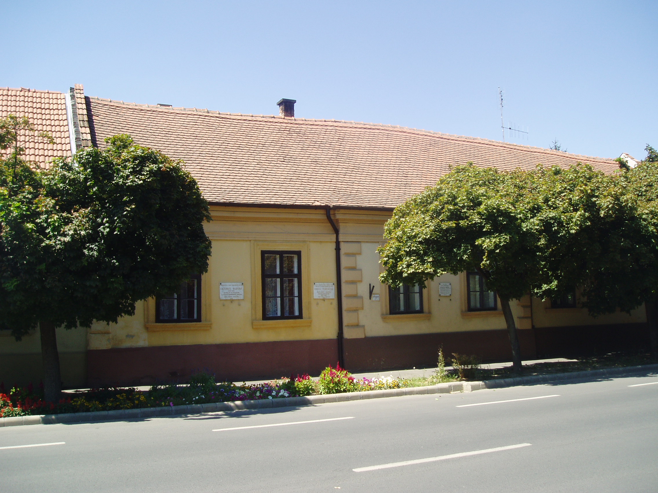 Nyilvános 997 | 1545 | Gyula, Kossuth utca 30. | Az Almásy-kastélyhoz vezető kőhíddal egyvonalban, az utca túlsó oldalán álló földszintes lakóház egykor Erkel Rezső (Rudolf) vármegyei főorvos, Erkel Ferenc öccse lakása volt, ahol a zeneköltő is gyakran megfordult (János testvérük a szomszédban, a mai 28. szám alatt lakott). Jókai Mór két ízben is megfordult a házban. Először Laborfalvy Rózával 1848. augusztus 29-én kötött házasságuk után voltak a ház vendégei (Erkel Rezső korábban a Nemzeti Színház orvosa volt, onnét ismerték egymást). 1849 júliusában, a szabadságharc vége felé Jókai, Pestről elmenekülve az Erkel család vendégszeretetére bízta feleségét, akivel együtt volt a kor kiváló operaénekesnője, Schodelné Klein Róza is, akik a ház két udvari szobájában húzták meg magukat. Ide tért vissza Jókai feleségéért a világosi fegyverletétel után. Erről szól "Egy napom Gyulán" című szívszorító írása: "Ez volt életem legszomorúbb napja. 1849. augusztus 13-án nyitottam be a gyulai Erkel ház ajtaján ezzel a szóval: nincsen hazánk”. Jókai innét utazott álöltözetben, hamis papírokkal Tardonára. 1860-tól haláláig ebben a házban élt Erkel Ferencné Ádler Adél, miután különvált férjétől. Gyulán hunyt el, sírja a Szentháromság-temetőben van. Az épületen Erkel Rudolf, Ádler Adél és Jókai Mór emlékét márványtáblákon örökítették meg. A fénykép 2007 júliusában készült. Felh. irod.: Czeglédi Imre: Gyula útikalauz. 2. jav., bőv. kiad. Gyula, 1995 |