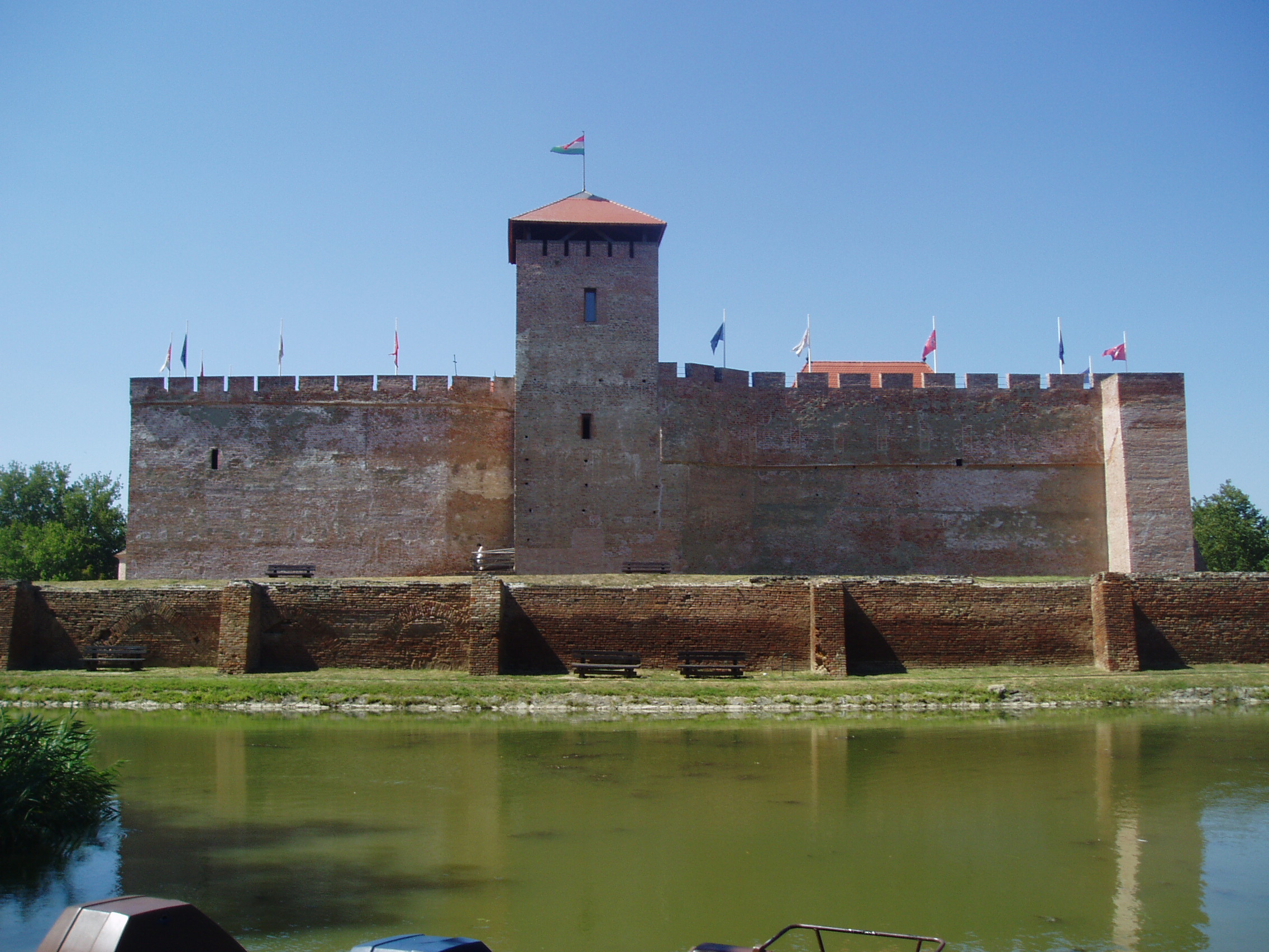 Nyilvános 1001 | 1474 | Gyula, Vár | Az Alföld egyetlen középkori téglavárát a Maróthy család építtette a XV. század első felében. Derékvárának saroktornyát 1482 után Corvin János emeltette (ma eszpresszó és borozó működik benne). Corvin János, mint a trónöröklésből kiszorított herceg 1482 és 1504 között volt a vár ura, s feleségével, Frangepán Beatrix-szel együtt gyakran tartózkodott itt. Corvin János 150-ben bekövetkezett halála után özvegye állandóan Gyulán lakott. 1508-ban itt halt meg leánya, Corvin Erzsébet, a Hunyadi család utolsó sarja. 1543-ban a vár történelmi esemény színhelye volt: itt tartott közös országgyűlést Fráter György elnökletével az Erdéllyel határos nyolc alföldi megye nemessége. 1552-től a vár a török elleni végvári rendszer láncszeme lett és ó-olasz bástyás palánkvárrá alakították át. 1566-ban került török kézre, miután erősítés hiányában, kilenc heti ostrom után Kerecsényi László kapitány kénytelen volt feladni. Bár a török szabad elvonulást ígért, a maradék védőket a janicsárok megtámadták és lemészárolták, Kerecsényi kapitányt pedig foglyul ejtették és Nándorfehérváron kivégezték. A vár 1695-ig volt török kézen. Akkori állapotát megörökítette leírásában Evlia Cselebi török világutazó. A Rákóczi-szabadságharc után az ún. huszárvárat lerombolták, csak a belső vár maradt meg. Az épület déli sarkán Tóth Béla: Végvári vitéz című lovas szobra áll. A vár két bejárata közül a délkeleti oldalon van az ún. Kerecsényi kapu. A boltíve alatti két helyiségben a helyi hagyomány szerint Damjanich János és Lahner György tábornok volt elszállásolva 1849 augusztusában. A várudvar 1964 óta a Gyulai Várszínház előadásainak színhelye. A belső termekben a közelmúltban nyílt meg a Vármúzeum. A vár előtt az egykori vizesárok kiszélesítésével csónakázótavat létesítettek, melynek közepén tószínpadot alakítottak ki. A fénykép 2007 júliusában készült. Felh. irod.: Czeglédi Imre: Gyula útikalauz. 2. jav., bőv. kiad. Gyula, 1995 www.vendegvaro.hu www.gyula.hu |