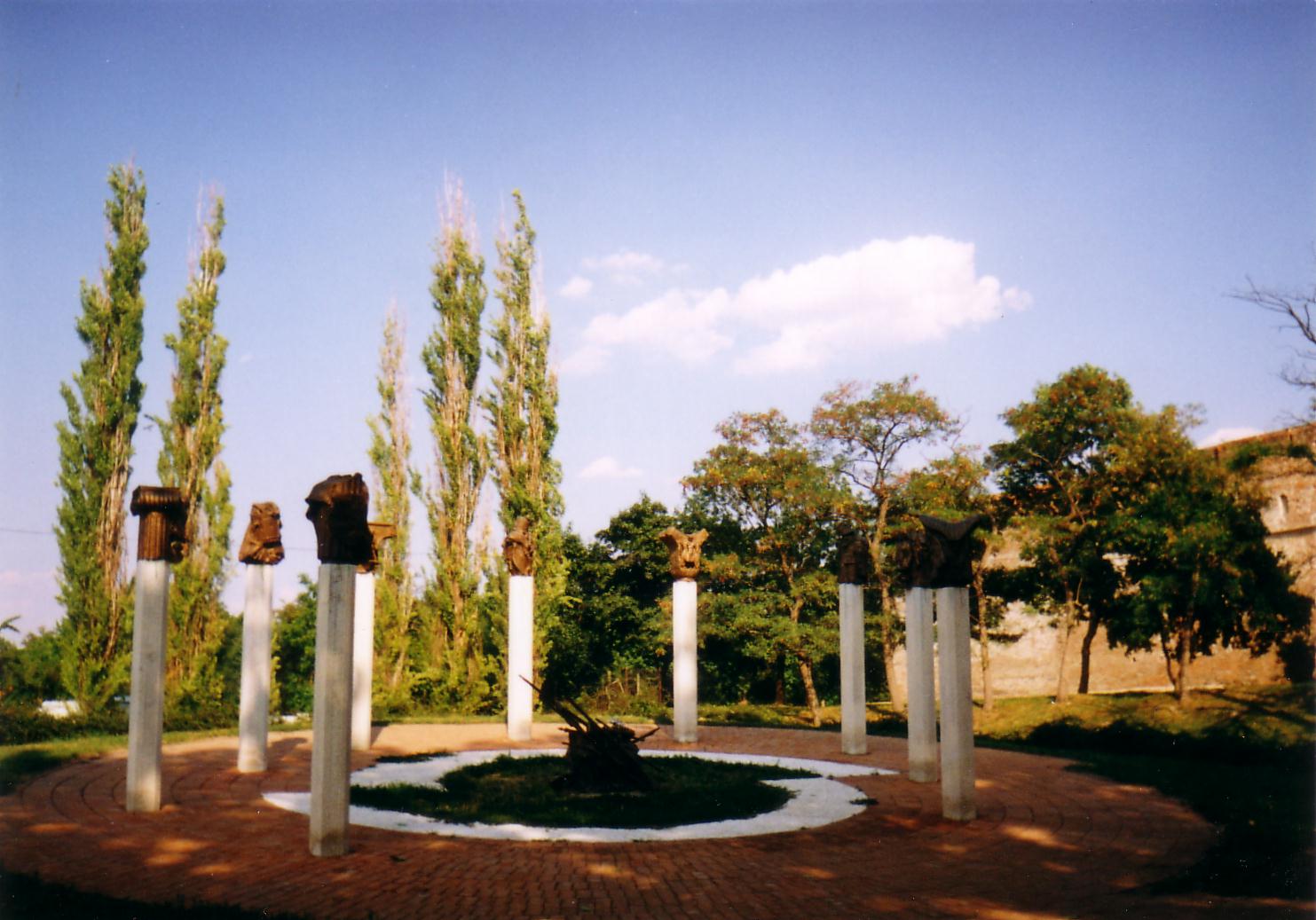 Nyilvános 944 | 1466 | Gyula, Várkert: Honvédtiszti emlékhely | A szabadságharc végén, 1849 augusztusában szomorú esemény színhelye lett Gyula. A világosi fegyverletételkor a magyar sereg tisztjei megtarthatták oldalfegyvereiket, s az oroszok Sarkadra, majd Gyulára kísérték őket. Az oroszok tüntetően jól bántak a magyar tisztekkel: eltávolították a grófi kastély elől az osztrák őröket, s együtt mentek a Korona vendéglőbe, ahol a cigánnyal a Rákóczi indulót és a Kossuth-nótát huzatták, senki nem gondolt arra, hogy a foglyok valaha is az osztrákok kezébe kerülnek. A mostani Groza park területén elhelyezett fogolytábort alig őrizték, többen polgári ruhát szerezve el is menekültek. A hagyomány szerint az araddi tizenhárom vértanú közül kilenc volt Gyulán: Aulich Lajos, Damjanich János, Kiss Ernő, Knezich Károly, Lahner György, Lázár Vilmos, Leiningen-Westenburg Károly, Nagy-Sándor József, Török Ignác. A tábornokokat magánházaknál szállásolták el, amelyeken ma emléktábláik olvashatók. Közülük csupán Lahner és Damjanich volt köteles a várkapu melletti cellában tölteni az éjszakát. Augusztus 21-én Rüdiger tábornok hozta Paszkievics parancsát, hogy a honvédtiszteket le kell fegyverezni és át kell adni az osztrákoknak. Augusztus 23-án a vár és a kastély közötti téren megkezdődött az 1300 honvédtiszt lefegyverzése. Másnap az oroszok átadták őket az osztrákoknak, akik 200 szekérrel szállították őket Aradra. E szomorú történelmi esemény 140. évfordulója alkalmából alakították ki 1989-ben a vár északi fala mögött az emlékhelyet, Máté István szobrász és Szemerei Márta építész alkotását. A posztamensen álló kilenc szobor az 1849. október 6-án kivégzett kilenc tábornokot szimbolizálja. (A képet 2000 júliusában készítettem. Amikor 2007 nyarán ismét ott jártam, vandál rongálások miatt meg sem lehetett közelíteni az emlékhelyet... K.K.) Felh. irod.: Czeglédi Imre: Gyula útikalauz. 2. jav., bőv. kiad. Gyula, 1995 |