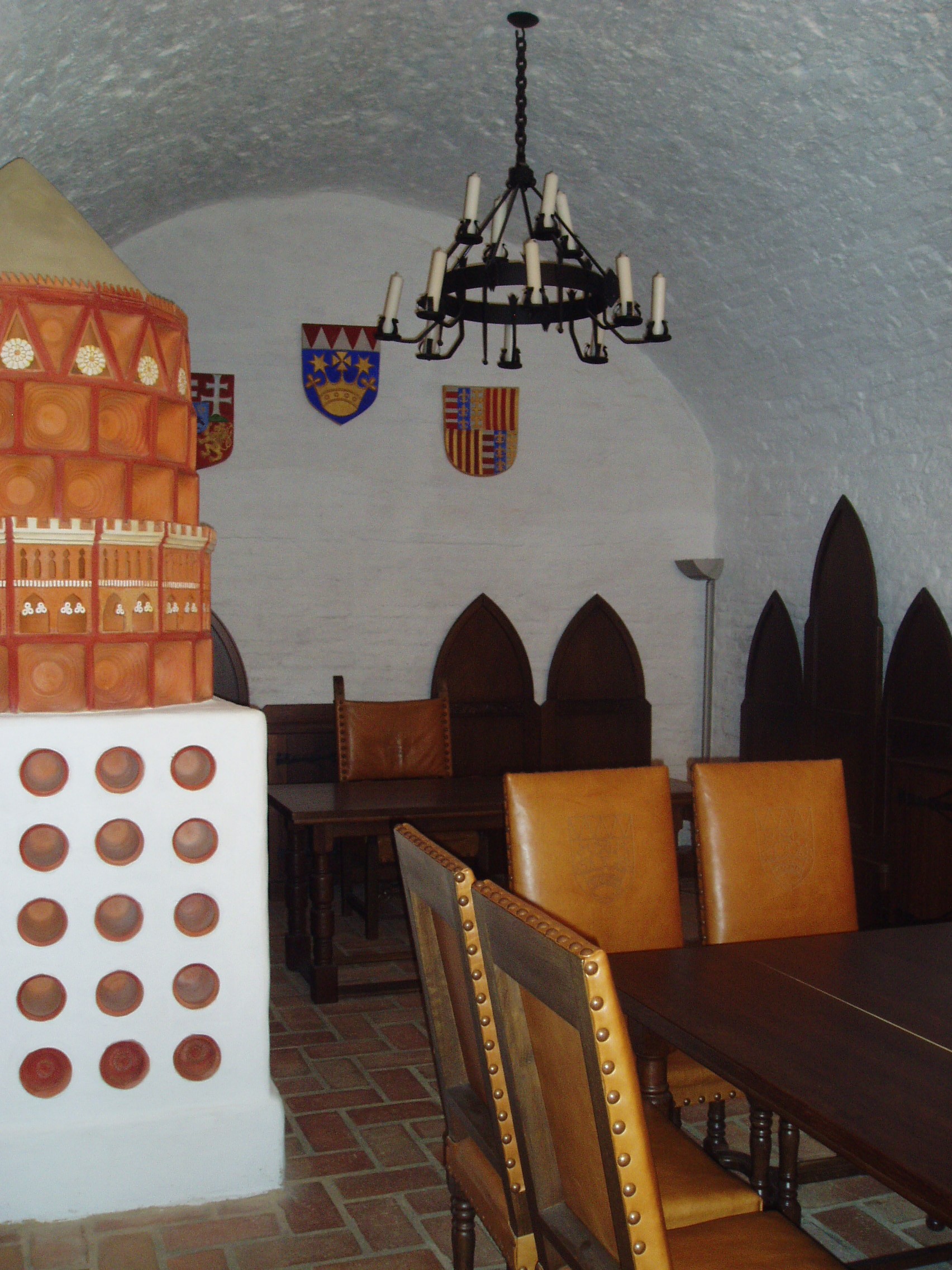 Nyilvános 1011 | 1548 | Gyula, Vár | A vár belső termeiben a közelmúltban nyílt meg a Vármúzeum. Berendezett termei és kápolnája igazi korabeli hangulatot nyújtanak a látogatóknak. A képen az emeleten található lovagterem részlete látható egy XVI. századi kályha rekonstrukciójával. A fénykép 2007 júliusában készült. |