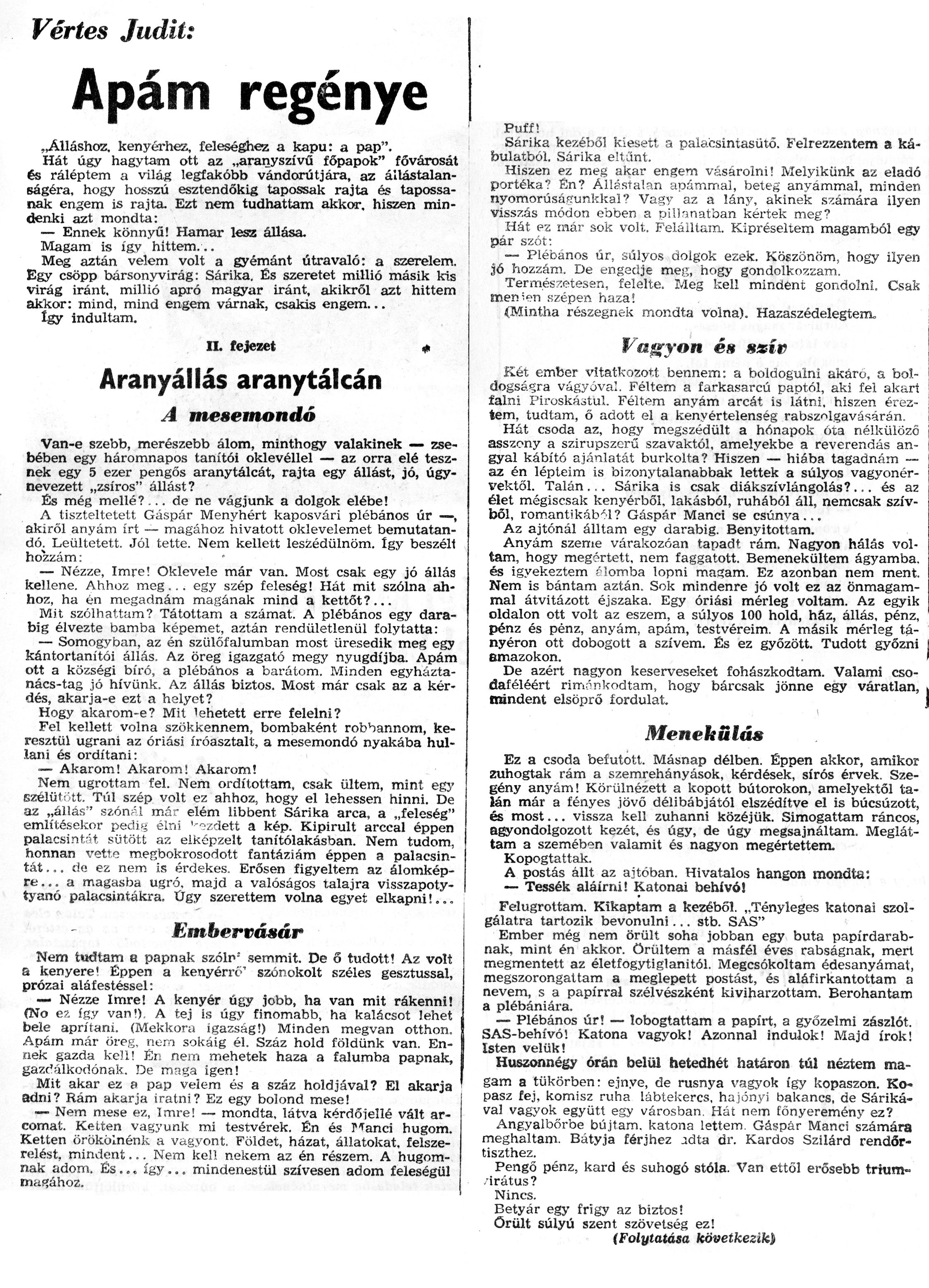 Nyilvános 1147 | 2199 | Zalai Hírlap 1971.01.10. 008sz 08old - Apám regénye 02 | A következő szöveg a cikkből keletkezett automata szövegfelismertető segítségével: Vértes Judit: Apám regénye „Álláshoz, kenyérhez, feleséghez a kapu: a pap". Hát úgy hagytam ott az „aranyszívű főpapok" fővárosát és ráléptem a világ legfakóbb vándorútjára, az állástalanságéra, hogy hosszú esztendőkig tapossak rajta és tapossanak engem is rajta. Ezt nem tudhattam akkor, hiszen mindenki azt mondta: — Ennek könnyű! Hamar lesz állása. Magam is így hittem... Meg aztán velem volt a gyémánt útravaló: a szerelem. Egy csöpp bársonyvirág: Sárika. És szeretet millió másik kis virág iránt, millió apró magyar iránt, akikről azt hittem akkor: mind, mind engem várnak, csakis engem... Így indultam. n. fejezet # Aranyállás aranytálcán T A mesemondó Van-e szebb, merészebb álom, minthogy valakinek — zsebében egy háromnapos tanítói oklevéllel — az orra elé tesznek egy 5 ezer pengős aranytálcát, rajta egy állást, jó, úgynevezett „zsíros" állást? És még mellé?-., de ne vágjunk a dolgok elébe! A tiszteltetett Gáspár Menyhért kaposvári plébános úr —, akiről anyám írt — magához hivatott oklevelemet bemutatan-dó; Leültetett. Jól tette. Nem kellett leszédülnöm. így beszélt hozzám: — Nézze, Imre! Oklevele már van. Most csak egy jó állás kellene. Ahhoz meg... egy szép feleség! Hát mit szólna ahhoz, ha én megadnám magának mind a kettőt?... Mit szólhattam? Tátottam a számat. A plébános egy darabig élvezte bamba képemet, aztán rendületlenül folytatta: — Somogyban, az én szülőfalumban most üresedik meg egy kántortanítói állás. Az öreg igazgató megy nyugdíjba. Apám ott a községi bíró, a plébános a barátom. Minden egyháztanács-tag jó hívünk. Az állás biztos. Most már csak az a kérdés, akarja-e ezt a helyet? Hogy akarom-e? Mit \'ehetett erre felelni? Fel kellett volna szökkennem, bombaként robbannom, keresztül ugrani az óriási íróasztalt, a mesemondó nyakába hullani és ordítani: ■— Akarom! Akarom! Akarom! Nem ugrottam fel. Nem ordítottam, csak ültem, mint egy szélüt\'tt. Túl szép volt ez ahhoz, hogy el lehessen hinni. De az „állás" szómU már elém libbent Sárika arca, a „feleség" említésekor pedu» élni \'-°zdett a kép. Kipirult arccal éppen palacsintát sütött az elképzelt tanítólakásban. Nem tudom, honnan \\retto megbokrosodott fantáziám éppen a palacsintát ... da ez nem is érdekes. Erősen figyeltem az álomképre... a magasba ugró, majd a valóságos talajra visszapoty-tyanó palacsintákra. Ügy szerettem volna egyet elkapni!... Embervásár Nem tudtam a papnak szóin\' semmit. De 6 tudott! Az volt a kenyere\' Éppen a kenyérré\' szónokolt széles gesztussal, prózai aláfestéssel: — Nézze Imre! A kenyér úgy jobb, ha van mit rákenni! (No ez így van!), A tej is úgy finomabb, ha kalácsot lehet bele aprítani. (Mekkora igazság!) Minden megvan otthon. Apám már öreg, nem sokáig él. Száz hold földünk van. Ennek gazda kell! Én nem mehetek haza a falumba papnak, gazdálkodónak. De maga igen! Mit akar ez a pap velem és a száz holdjával? El akarja adni? Rám akarja íratni? Ez egy bolond mese! — Nem mese ez, Imre! — mondta, látva kérdőjellé vált arcomat. Kelten vagyunk mi testvérek. Én és Manci húgom. Ketten örökölnénk a vagyont. Földet, házat, állatokat, felszerelést, mindent... Nem kel! nekem az én részem. A húgomnak adom. És ... így... mindenestül szívesen adom feleségül niaf?ához. Puff! Sárika kezéből kiesett a palacsintasütő. Felrezzentem a ká-foulatból. Sárika eltűnt. Hiszen ez meg akar engem vásárolni! Melyikünk az eladó portéka? Én? Állástalan apámmal, beteg anyámmal, minden nyomorúsáfrunkkal ? Vagy az a lány, akinek számára ilyen visszás módon ebben a pillanatban kértek meg? Hát ez már sok volt. Felálltam. Kipréseltem magamból egy pár szót: — Plébános űr, súlyos dolgok ezek. Köszönöm, hogy ilyen jő hozzám. De engedje meg, hogy gondolkozzam. Természetesen, felelte. Meg kell mindent gondolni. Csak menien szépen haza! {Mintha részegnek mondta volna). Hazaszédelegtera, Vagyon és ssív : \'■ \' Két ember vitatkozott bennem: a boldogulni akáro, a boldogságra vágyóvá\'.. Féltem a farkasarcú paptól, aki fel akart falni Piroskástul. Féltem anyám arcát is látni, hiszen éreztem, tudtam, ő adott el a kenyértelenség rabszolgavásárán. Hát csoda az, hogy megszédült a hónapok óta nélkülöző asszony a szirupszerű szavaktól, amelyekbe a reverendás angyal kábító ajánlatát burkolta? Hiszen — hiába tagadnám — az én lépteim is bizonytalanabbak lettek a súlyos vagyonér-vektől. Talán.,. Sárika is csak diákszívlángolás?... és az élet mégiscsak kenyérből, lakásból, ruhából áll, nemcsak szívből, romantikából? Gáspár Manci se csúnva ... Az ajtónál álltam egy darabig. Benyitottam. Anyám szeme várakozóan tapadt rám. Nagyon hálás voltam, hogy megértett, nem faggatott. Bemenekültem ágyamba. és igyekeztem f Somba lopni masam. Ez azonban nem ment. Nem is bántam aztán. Sok mindenre jó volt ez az önmagámmal átvitázott éjszaka. Egy óriási mérleg voltam. Az egyik oldalon ott volt az eszem, a súlyos 100 hold, ház, állás, pénz, pénz és pénz, anyám, apám, testvéreim. A másik mérleg tányéron ott dobogott a szívem. És ez győzött. Tudott győzni amazokon. De azért nagyon keserveseket fohászkodtam. Valami csodaféléért rimőnkodtam, hogy bárcsak jönne egy váratlan, mindent elsöprő fordulat. i Menekülő* Ez a csoda befutott. Másnap délben. Éppen akkor, amikor zuhogtak rám a szemrehányások, kérdések, sírós érvek. Szegény anyám! Körülnézett a kopott bútorokon, amelyektől talán már a fényes jövő délib