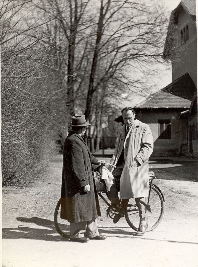 Nyilvános 1529 | 3124 | Vértes Imre tanár úr jellegzetes elgondolkozó pózában látható a Mozikertben, a félig háttal álló kalapos ember – a tanítvány, a képet beküldő dr. Cserfalvi Tamás édesapja – Cserfalvi József. A kép 1954-55-környékén készülhetett. | |