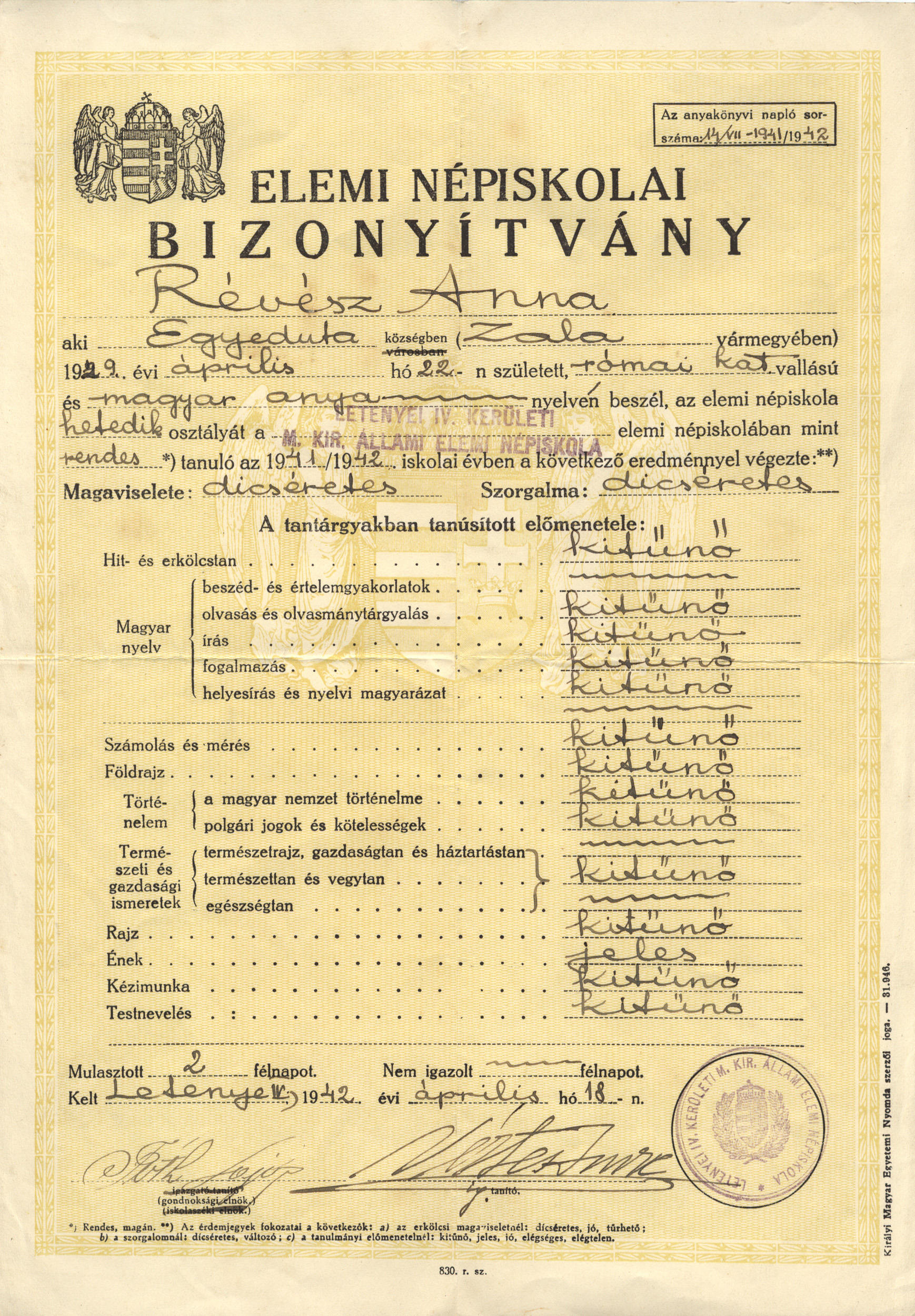 Elemi népiskolai bizonyítvány - Révész Anna