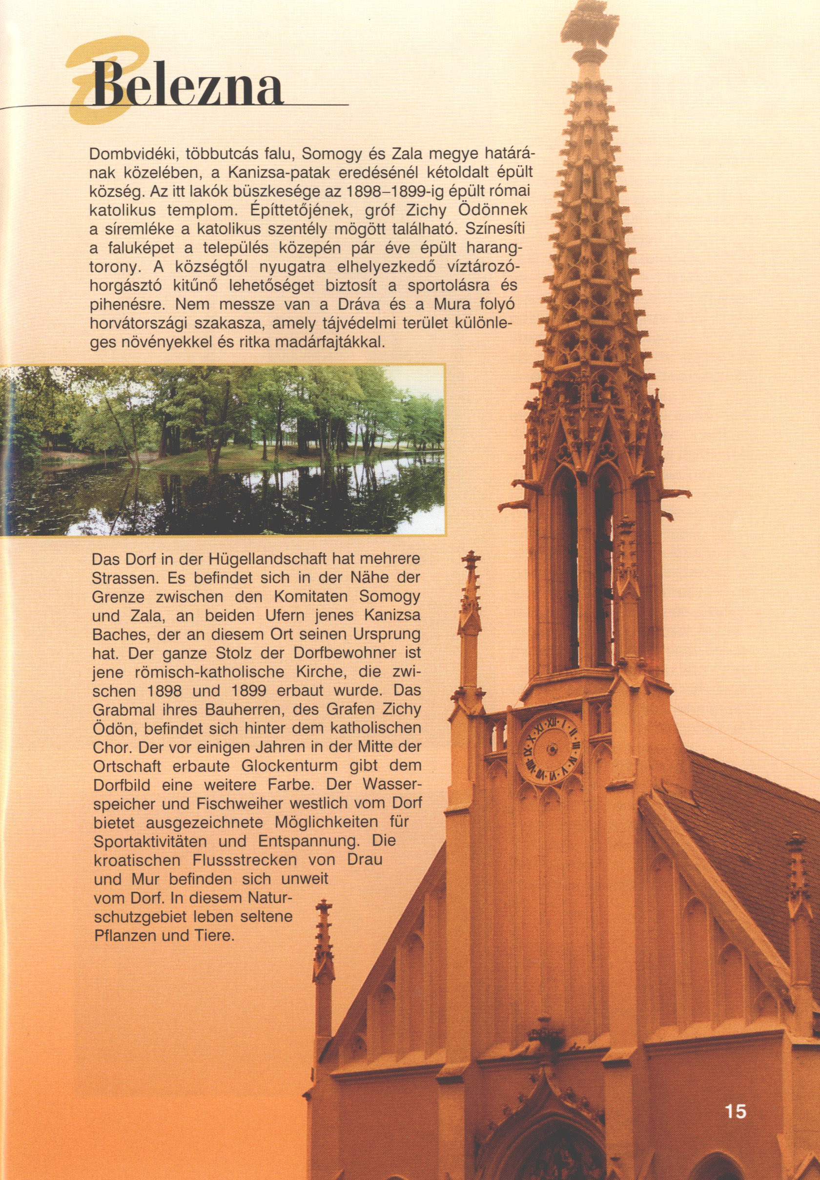 Nyilvános 2321 | 7590 | Belezna | Das Dorf in der Hügellandschaft hat mehrere Strassen. Es befindet sich in der Nähe der Grenze zwischen den Komitaten Somogy und Zala, an beiden Ufern jenes Kanizsa Baches, der an diesem Ort seinen Ursprung hat. Der ganze Stolz der Dorfbewohner ist jene römisch-katholische Kirche, die zwischen 1898 und 1899 erbaut wurde. Das Grabmal ihres Bauherren, des Grafen Zichy Ödön, befindet sich hinter dem katholischen Chor. Der vor einigen Jahren in der Mitte der Ortschaft erbaute Glockenturm gibt dem Dorfbild eine weitere Farbe. Der Wasserspeicher und Fischweiher westlich vom Dorf bietet ausgezeichnete Möglichkeiten für Sportaktivitäten und Entspannung. Die kroatischen Flussstrecken von Drau und Mur befinden sich unweit vom Dorf. In diesem Naturschutzgebiet leben seltene Pflanzen und Tiere. Dieses Text stammt von: Titel: Hívogató a Régiók Kapujában - Útikönyv Látnivalók Nagykanizsán és Térségében (Einladend in dem Tor des Gebiets - Reisebuch - Sehenswürdigkeiten in Nagykanizsa und Umgebung) Herausgegeben von: Nagykanizsa és a Környező Települések Területfejlesztési Társulása (Verein für Gebietsentwicklung in Nagykanizsa und in ihrer Umgebung) 8800 Nagykanizsa, Petőfi Sándor út 5. Tel.: 06 93/536-453 • 06 93/536-454 Tel ./Fax: 06 93/326-323 E-mail: terstars@axelero.hu www.kanizsaterseg.celodin.hu |