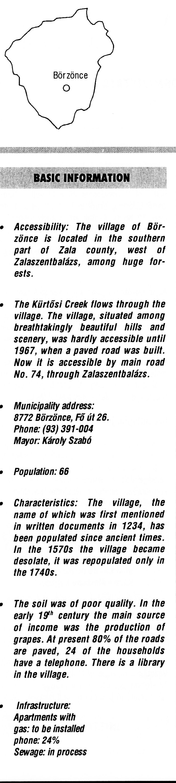 Nyilvános 2201 | 6004 | Börzönce | BASIC INFORMATION Accessibility: The village of Börzönce is located in the southern part of Zala county, west of Zalaszentbalázs, among huge forests. The Kürtősi Creek flows through the village. The village, situated among breathtakingly beautiful hills and scenery, was hardly accessible until 1967, when a paved road was built. Now it is accessible by main road No. 74, through Zalaszentbalázs. Municipality address: 8772 Börzönce, Fő út 26. Phone: (93) 391-004 Mayor: Károly Szabó Population: 66 Characteristics: The village, the name of which was first mentioned in written documents in 1234, has been populated since ancient times. In the 1570s the village became desolate, it was repopulated only in the 1740s. The soil was of poor quality. In the early 19th century the main source of income was the production of grapes. At present 80% of the roads are paved, 24 of the households have a telephone. There is a library in the village. Infrastructure: Apartments with gas: to be installed phone: 24% Sewage: in process This text came from the following book: Title: Handbook of Zala county (Zala megye kézikönyve) Series: County handbooks of Hungary (Magyarország megyei kézikönyvei) Chief editor: Hóbor József Publisher: (Hatvan), CEBA-Hungary Ltd, 1998 ETO: 908.439.121(035) ; 050.8(439.121) ISBN: 963-9089-18-2 Pages: 488-1040 p. Remark: Closed on: 1998. márc. 31. |
