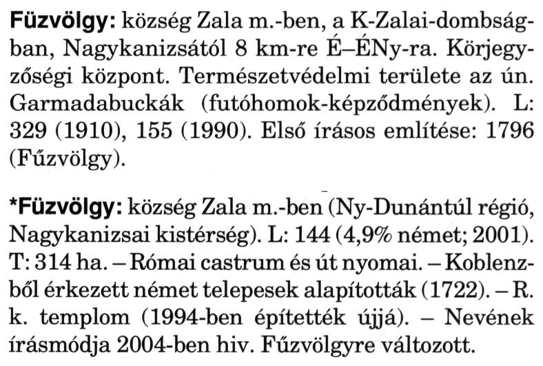 Nyilvános 2174 | 5995 | A szócikkek felismertetett szövege: | (A csillag után a kiegészítő kötetből származó szöveg következik) Füzvölgy: község Zala m.-ben, a K-Zalai-dombság-ban, Nagykanizsától 8 km-re É-ÉNy-ra. Körjegyzőségi központ. Természetvédelmi területe az ún. Garmadabuckák (futóhomok-képződmények). L: 329 (1910), 155 (1990). Első írásos említése: 1796 (Fűzvölgy). *Füzvölgy: község Zala m.-ben (Ny-Dunántúl régió, Nagykanizsai kistérség). L: 144 (4,9% német; 2001). T: 314 ha. - Római castrum és út nyomai. - Koblenz-ből érkezett német telepesek alapították (1722). - R. k. templom (1994-ben építették újjá). - Nevének írásmódja 2004-ben hiv. Fűzvölgyre változott. A szócikkek a következő lexikonból származnak: Cím: Magyar nagylexikon Közreműködő: Élesztős László (1949) (szerk.) ; Barabás Éva (1943) (szerk.) ; Berényi Gábor (1946) (szerk.) ; Bárány Lászlóné (szerk.) ; Adelmann-né Kertész Judit (1945) (közrem.) ; Froemel Károlyné Jáky Éva (1936) (közrem.) ; Akadémiai Kiadó és Nyomda Vállala Szerz. közl.: [... Élesztős László főszerk.] ; [szerk. Barabás Éva et al.] ; [bibliogr. Adelmanné Kertész Judit] ; [kész. az Akadémiai Kiadó Magyar Nagylexikon Szerkesztőségében] Kiadás: Budapest : Akad. K., 1993- Kötetei: 1. köt., A - Anc 2. köt., And - Bag 3. köt., Bah - Bij 4. köt., Bik - Bz 5. köt., C - Csem 6. köt., Csen - Ec 7. köt., Ed - Fe 8. köt., Ff - Gyep 9. köt., Gyer - Iq 10. köt., Ir - Kip 11. köt., Kir - Lem 12. köt., Len - Mep 13. köt., Mer - Nyk 14. köt., Nyl - Pom 15. köt., Pon - Sek 16. köt., Sel - Szö 17. köt., Szp - Ung 18. köt., Unh - Z 19. köt., Kiegészítő kötet, A - Z ETO jelzet: 030=945.11 Szakjelzet: 030 Cutter: M 14 ISBN: 963-05-6611-7 [!ISBN 963-05-6615-X] Nyelv: magyar Megjegyzés: Az 5. kötettől kiad. a Magyar Nagylexikon Kiadó ; A 6. kötettől főszerk. Berényi Gábor ; A 6. kötettől szakszerk. Bárány Lászlóné et al. ; A 6. kötettől bibliogr. Froemel Károlyné ; Bibliogr. a szócikkek végén |