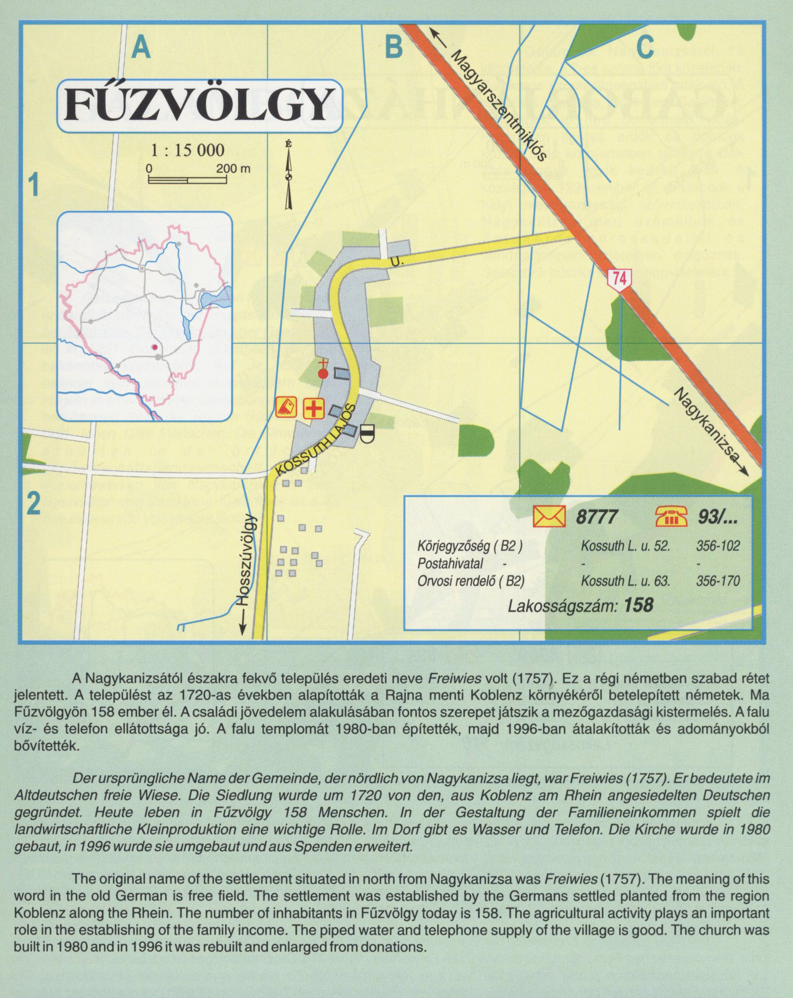 Nyilvános 2244 | 9160 | Fűzvölgy | A Nagykanizsától északra fekvő település eredeti neve Freiwies \\io\\\\ (1757). Ez a régi németben szabad rétet jelentett. A települést az 1720-as években alapították a Rajna menti Koblenz környékéről betelepített németek. Ma Fűzvölgyön 158 ember él. A családi jövedelem alakulásában fontos szerepet játszik a mezőgazdasági kistermelés. A falu víz- és telefon ellátottsága jó. A falu templomát 1980-ban építették, majd 1996-ban átalakították és adományokból bővítették. Der ursprüngliche Name der Gemeinde, der nördlich von Nagykanizsa liegt, war Freiwies (1757). Erbedeutete im Altdeutschen freie Wiese. Die Siedlung wurde um 1720 von den, aus Koblenz am Rhein angesiedelten Deutschen gegründet. Heute leben in Fűzvölgy 158 Menschen. In der Gestaltung der Familieneinkommen spielt die landwirtschaftliche Kleinproduktion eine wichtige Rolle. Im Dorf gibt es Wasser und Telefon. Die Kirche wurde in 1980 gebaut, in 1996 wurde sie umgebaut und aus Spenden erweitert. The original name of the settlement situated in north from Nagykanizsa was Freiwies (1757). The meaning of this word in the old German is free field. The settlement was established by the Germans settled planted from the region Koblenz along the Rhein. The number of inhabitants in Fűzvölgy today is 158. The agricultural activity plays an important role in the establishing of the family income. The piped water and telephone supply of the village is good. The church was built in 1980 and in 1996 it was rebuilt and enlarged from donations A részlet a következő kiadványból származik/Die Teile stammen vom volgenden Buch/This text came from the following book: Cím/Titel/Title: Zala megye településeinek atlasza - 257 település részletes térképe/Atlas der Komitat Zala - 257 Detailte Siedlungskarten/Zala county\'s Atlas - 257 settlement maps. Közreműködő/contributor: Lackner László (1943) (fotó) Kiadás/Ausgabe/Publisher: Gyula : HISZI-MAP, 1997 Sorozat/Serie/Series: Indulástól - megérkezésig... ETO: 912(439.121-2) ; 908.439.121 Cutter: Z 19 ISBN: 963-610-025-4 Oldalszám/Seiten/Pages: 323, 81 p. Megjegyzés/Note: Lezárva/Abgeschlossen am/Closed am: 1997. máj. 30. |