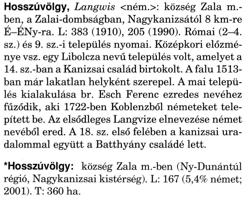Nyilvános 2067 | 5765 | A szócikkek felismertetett szövege: | (A csillag után a kiegészítő kötetből származó szöveg következik) Hosszúvölgy, Langwis <ném.>: község Zala m.-ben, a Zalai-dombságban, Nagykanizsától 8 km-re É-ÉNy-ra. L: 383 (1910), 205 (1990). Római (2-4. sz.) és 9. sz.-i település nyomai. Középkori előzménye vsz. egy Libolcza nevű település volt, amelyet a 14. sz.-ban a Kanizsai család birtokolt. A falu 1513-ban már lakatlan helyként szerepel. A mai település kialakulása br. Esch Ferenc ezredes nevéhez fűződik, aki 1722-ben Koblenzből németeket telepített be. Az elsődleges Langvize elnevezése német nevéből ered. A 18. sz. első felében a kanizsai uradalommal együtt a Batthyány családé lett. *Hosszúvölgy: község Zala m.-ben (Ny-Dunántúl régió, Nagykanizsai kistérség). L: 167 (5,4% német; 2001). T: 360 ha. A szócikkek a következő lexikonból származnak: Cím: Magyar nagylexikon Közreműködő: Élesztős László (1949) (szerk.) ; Barabás Éva (1943) (szerk.) ; Berényi Gábor (1946) (szerk.) ; Bárány Lászlóné (szerk.) ; Adelmann-né Kertész Judit (1945) (közrem.) ; Froemel Károlyné Jáky Éva (1936) (közrem.) ; Akadémiai Kiadó és Nyomda Vállala Szerz. közl.: [... Élesztős László főszerk.] ; [szerk. Barabás Éva et al.] ; [bibliogr. Adelmanné Kertész Judit] ; [kész. az Akadémiai Kiadó Magyar Nagylexikon Szerkesztőségében] Kiadás: Budapest : Akad. K., 1993- Kötetei: 1. köt., A - Anc 2. köt., And - Bag 3. köt., Bah - Bij 4. köt., Bik - Bz 5. köt., C - Csem 6. köt., Csen - Ec 7. köt., Ed - Fe 8. köt., Ff - Gyep 9. köt., Gyer - Iq 10. köt., Ir - Kip 11. köt., Kir - Lem 12. köt., Len - Mep 13. köt., Mer - Nyk 14. köt., Nyl - Pom 15. köt., Pon - Sek 16. köt., Sel - Szö 17. köt., Szp - Ung 18. köt., Unh - Z 19. köt., Kiegészítő kötet, A - Z ETO jelzet: 030=945.11 Szakjelzet: 030 Cutter: M 14 ISBN: 963-05-6611-7 [!ISBN 963-05-6615-X] Nyelv: magyar Megjegyzés: Az 5. kötettől kiad. a Magyar Nagylexikon Kiadó ; A 6. kötettől főszerk. Berényi Gábor ; A 6. kötettől szakszerk. Bárány Lászlóné et al. ; A 6. kötettől bibliogr. Froemel Károlyné ; Bibliogr. a szócikkek végén |