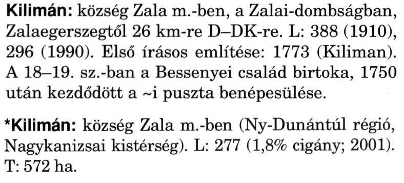 Nyilvános 2181 | 5960 | A szócikkek felismertetett szövege: | (A csillag után a kiegészítő kötetből származó szöveg következik) Kilimán: község Zala m.-ben, a Zalai-dombságban, Zalaegerszegtől 26 km-re D-DK-re. L: 388 (1910), 296 (1990). Első írásos említése: 1773 (Kiliman). A 18–19. sz.-ban a Bessenyei család birtoka, 1750 után kezdődött a ~i puszta benépesülése. *Kilimán: község Zala m.-ben (Ny-Dunántúl régió, Nagykanizsai kistérség). L: 277 (1,8% cigány; 2001). T: 572 ha. A szócikkek a következő lexikonból származnak: Cím: Magyar nagylexikon Közreműködő: Élesztős László (1949) (szerk.) ; Barabás Éva (1943) (szerk.) ; Berényi Gábor (1946) (szerk.) ; Bárány Lászlóné (szerk.) ; Adelmann-né Kertész Judit (1945) (közrem.) ; Froemel Károlyné Jáky Éva (1936) (közrem.) ; Akadémiai Kiadó és Nyomda Vállala Szerz. közl.: [... Élesztős László főszerk.] ; [szerk. Barabás Éva et al.] ; [bibliogr. Adelmanné Kertész Judit] ; [kész. az Akadémiai Kiadó Magyar Nagylexikon Szerkesztőségében] Kiadás: Budapest : Akad. K., 1993- Kötetei: 1. köt., A - Anc 2. köt., And - Bag 3. köt., Bah - Bij 4. köt., Bik - Bz 5. köt., C - Csem 6. köt., Csen - Ec 7. köt., Ed - Fe 8. köt., Ff - Gyep 9. köt., Gyer - Iq 10. köt., Ir - Kip 11. köt., Kir - Lem 12. köt., Len - Mep 13. köt., Mer - Nyk 14. köt., Nyl - Pom 15. köt., Pon - Sek 16. köt., Sel - Szö 17. köt., Szp - Ung 18. köt., Unh - Z 19. köt., Kiegészítő kötet, A - Z ETO jelzet: 030=945.11 Szakjelzet: 030 Cutter: M 14 ISBN: 963-05-6611-7 [!ISBN 963-05-6615-X] Nyelv: magyar Megjegyzés: Az 5. kötettől kiad. a Magyar Nagylexikon Kiadó ; A 6. kötettől főszerk. Berényi Gábor ; A 6. kötettől szakszerk. Bárány Lászlóné et al. ; A 6. kötettől bibliogr. Froemel Károlyné ; Bibliogr. a szócikkek végén |