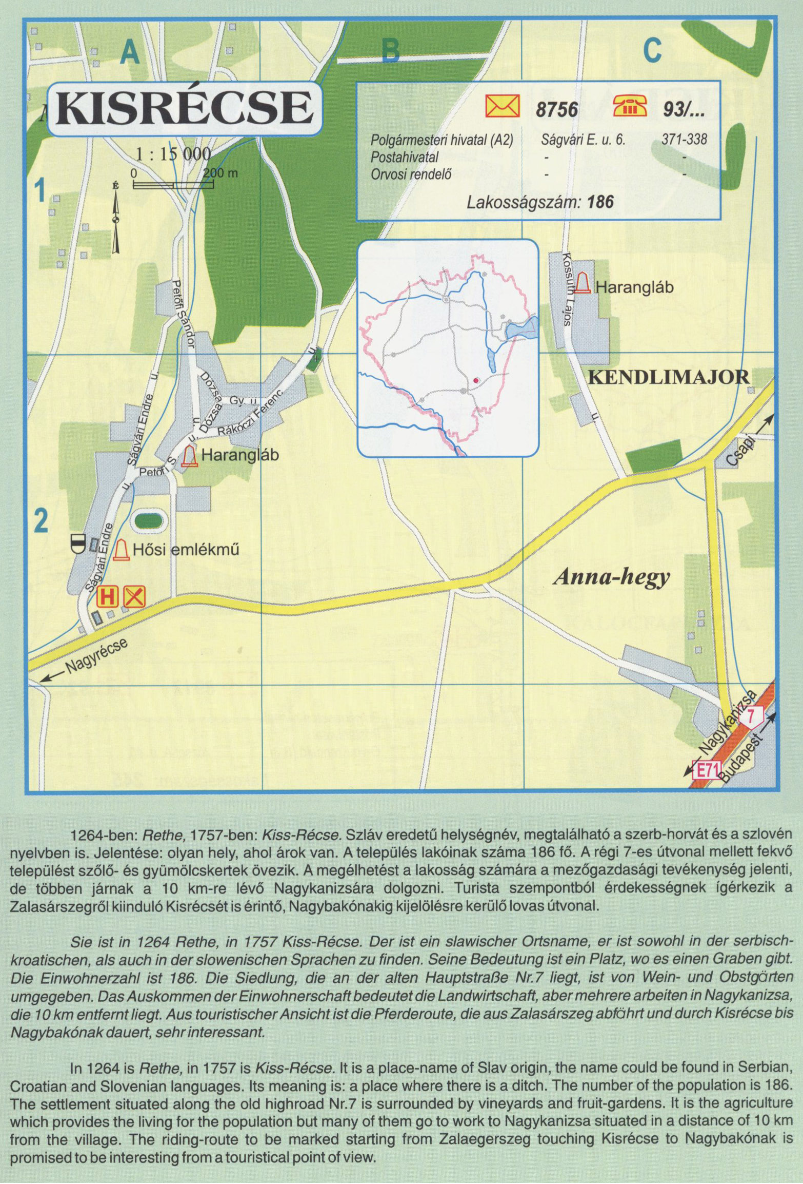 Nyilvános 2304 | 9191 | KISRÉCSE | 1264-ben: Rethe, 1757-ben: Kiss-Récse. Szláv eredetű helységnév, megtalálható a szerb-horvát és a szlovén nyelvben is. Jelentése: olyan hely, ahol árok van. A település lakóinak száma 186 fő. A régi 7-es útvonal mellett fekvő települést szőlő- és gyümölcskertek övezik. A megélhetést a lakosság számára a mezőgazdasági tevékenység jelenti, de többen járnak a 10 km-re lévő Nagykanizsára dolgozni. Turista szempontból érdekességnek ígérkezik a Zalasárszegről kiinduló Kisrécsét is érintő, Nagybakónakig kijelölésre kerülő lovas útvonal. Sie ist in 1264 Rethe, in 1757 Kiss-Récse. Der ist ein slawischer Ortsname, er ist sowohl in der serbisch-kroatischen, als auch in der slowenischen Sprachen zu finden. Seine Bedeutung ist ein Platz, wo es einen Graben gibt. Die Einwohnerzahl ist 186. Die Siedlung, die an der alten Hauptstraße Nr.7 liegt, ist von Wein- und Obstgärten umgegeben. Das Auskommen der Einwohnerschaft bedeutet die Landwirtschaft, aber mehrere arbeiten in Nagykanizsa, die 10 km entfernt liegt. Aus touristischer Ansicht ist die Pferderoute, die aus Zalasárszeg abfahrt und durch Kisrécse bis Nagybakónak dauert, sehr interessant. In 1264 is Rethe, in 1757 is Kiss-Récse. It is a place-name of Slav origin, the name could be found in Serbian, Croatian and Slovenian languages. Its meaning is: a place where there is a ditch. The number of the population is 186. The settlement situated along the old highroad Nr.7 is surrounded by vineyards and fruit-gardens. It is the agriculture which provides the living for the population but many of them go to work to Nagykanizsa situated in a distance of 10 km from the village. The riding-route to be marked starting from Zalaegerszeg touching Kisrécse to Nagybakónak is promised to be interesting from a touristical point of view. A részlet a következő kiadványból származik/Die Teile stammen vom volgenden Buch/This text came from the following book: Cím/Titel/Title: Zala megye településeinek atlasza - 257 település részletes térképe/Atlas der Komitat Zala - 257 Detailte Siedlungskarten/Zala county\'s Atlas - 257 settlement maps. Közreműködő/contributor: Lackner László (1943) (fotó) Kiadás/Ausgabe/Publisher: Gyula : HISZI-MAP, 1997 Sorozat/Serie/Series: Indulástól - megérkezésig... ETO: 912(439.121-2) ; 908.439.121 Cutter: Z 19 ISBN: 963-610-025-4 Oldalszám/Seiten/Pages: 323, 81 p. Megjegyzés/Note: Lezárva/Abgeschlossen am/Closed am: 1997. máj. 30. |