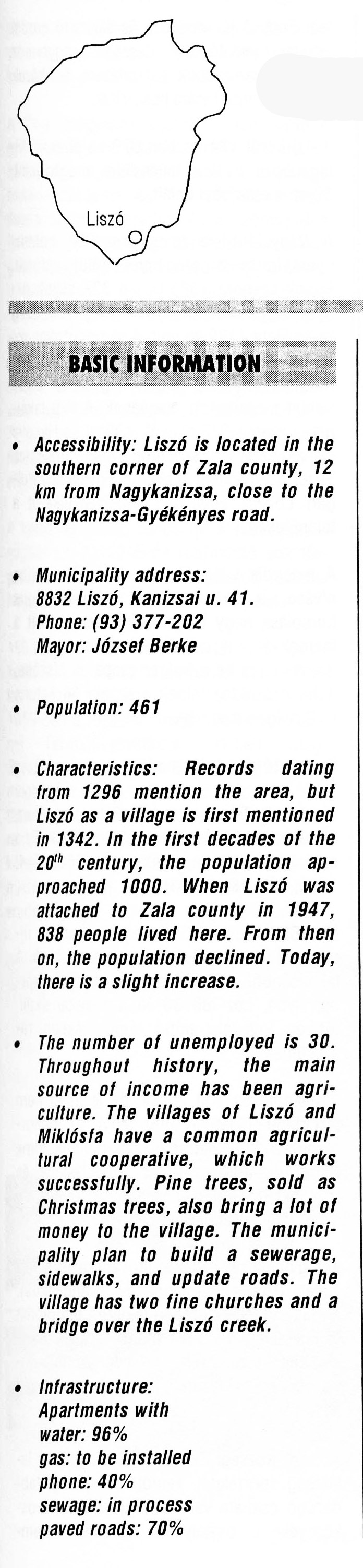 Nyilvános 2338 | 6635 | Liszó | BASIC INFORMATION Accessibility: Liszó is located in the southern corner of Zala county, 12 km from Nagykanizsa, close to the Nagykanizsa-Gyékényes road. Municipality address: 8832 Liszó, Kanizsai u. 41. Phone: (93) 377-202 Mayor: József Berke Population: 461 Characteristics: Records dating from 1296 mention the area, but Liszó as a village is first mentioned in 1342. In the first decades of the 20th century, the population approached 1000. When Liszó was attached to Zala county in 1947, 838 people lived here. From then on, the population declined. Today, there is a slight increase. The number of unemployed is 30. Throughout history, the main source of income has been agriculture. The villages of Liszó and Miklósfa have a common agricultural cooperative, which works successfully. Pine trees, sold as Christmas trees, also bring a lot of money to the village. The municipality plan to build a sewerage, sidewalks, and update roads. The village has two fine churches and a bridge over the Liszó creek. Infrastructure: Apartments with water: 96% gas: to be installed phone: 40% sewage: in process paved roads: 70% This text came from the following book: Title: Handbook of Zala county (Zala megye kézikönyve) Series: County handbooks of Hungary (Magyarország megyei kézikönyvei) Chief editor: Hóbor József Publisher: (Hatvan), CEBA-Hungary Ltd, 1998 ETO: 908.439.121(035) ; 050.8(439.121) ISBN: 963-9089-18-2 Pages: 488-1040 p. Remark: Closed on: 1998. márc. 31. |