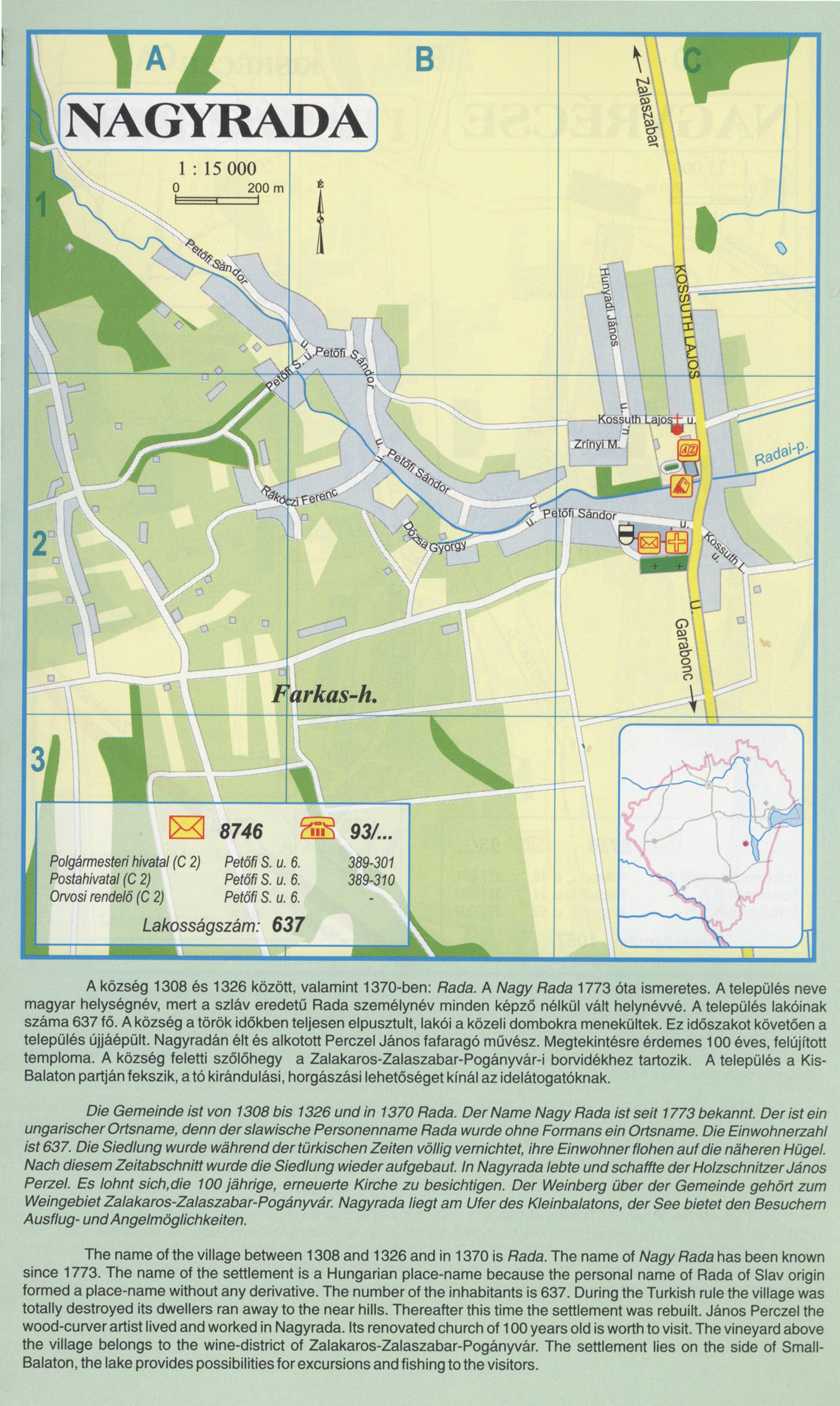 Nyilvános 2270 | 8401 | NAGYRADA | A község 1308 és 1326 között, valamint 1370-ben: Rada. A Nagy Rada 1773 óta ismeretes. A település neve magyar helységnév, mert a szláv eredetű Rada személynév minden képző nélkül vált helynévvé. A település lakóinak száma 637 fő. A község a török időkben teljesen elpusztult, lakói a közeli dombokra menekültek. Ez időszakot követően a település újjáépült. Nagyradán élt és alkotott Perczel János fafaragó művész. Megtekintésre érdemes 100 éves, felújított temploma. A község feletti szőlőhegy a Zalakaros-Zalaszabar-Pogányvár-i borvidékhez tartozik. A település a Kis-Balaton partján fekszik, a tó kirándulási, horgászási lehetőséget kínál az idelátogatóknak. Die Gemeinde ist von 1308 bis 1326 und in 1370 Rada. Der Name Nagy Rada ist seit 1773 bekannt. Der ist ein ungarischer Ortsname, denn der slawische Personenname Rada wurde ohne Formans ein Ortsname. Die Einwohnerzahl ist 637. Die Siedlung wurde während der türkischen Zeiten völlig vernichtet, ihre Einwohner flohen auf die näheren Hügel. Nach diesem Zeitabschnitt wurde die Siedlung wieder aufgebaut. In Nagyrada lebte und schaffte der Holzschnitzer János Perzel. Es lohnt sich,die 100 jährige, erneuerte Kirche zu besichtigen. Der Weinberg über der Gemeinde gehört zum Weingebiet Zalakaros-Zalaszabar-Pogányvár. Nagyrada liegt am Ufer des Kleinbalatons, der See bietet den Besuchern Ausflug-und Angelmöglichkeiten. The name of the village between 1308 and 1326 and in 1370 is Rada. The name of Nagy Rada has been known since 1773. The name of the settlement is a Hungarian place-name because the personal name of Rada of Slav origin formed a place-name without any derivative. The number of the inhabitants is 637. During the Turkish rule the village was totally destroyed its dwellers ran away to the near hills. Thereafter this time the settlement was rebuilt. János Perczel the wood-curver artist lived and worked in Nagyrada. Its renovated church of 100 years old is worth to visit. The vineyard above the village belongs to the wine-district of Zalakaros-Zalaszabar-Pogányvár. The settlement lies on the side of Small-Balaton, the lake provides possibilities for excursions and fishing to the visitors. A részlet a következő kiadványból származik/Die Teile stammen vom volgenden Buch/This text came from the following book: Cím/Titel/Title: Zala megye településeinek atlasza - 257 település részletes térképe/Atlas der Komitat Zala - 257 Detailte Siedlungskarten/Zala county\'s Atlas - 257 settlement maps. Közreműködő/contributor: Lackner László (1943) (fotó) Kiadás/Ausgabe/Publisher: Gyula : HISZI-MAP, 1997 Sorozat/Serie/Series: Indulástól - megérkezésig... ETO: 912(439.121-2) ; 908.439.121 Cutter: Z 19 ISBN: 963-610-025-4 Oldalszám/Seiten/Pages: 323, 81 p. Megjegyzés/Note: Lezárva/Abgeschlossen am/Closed am: 1997. máj. 30. |