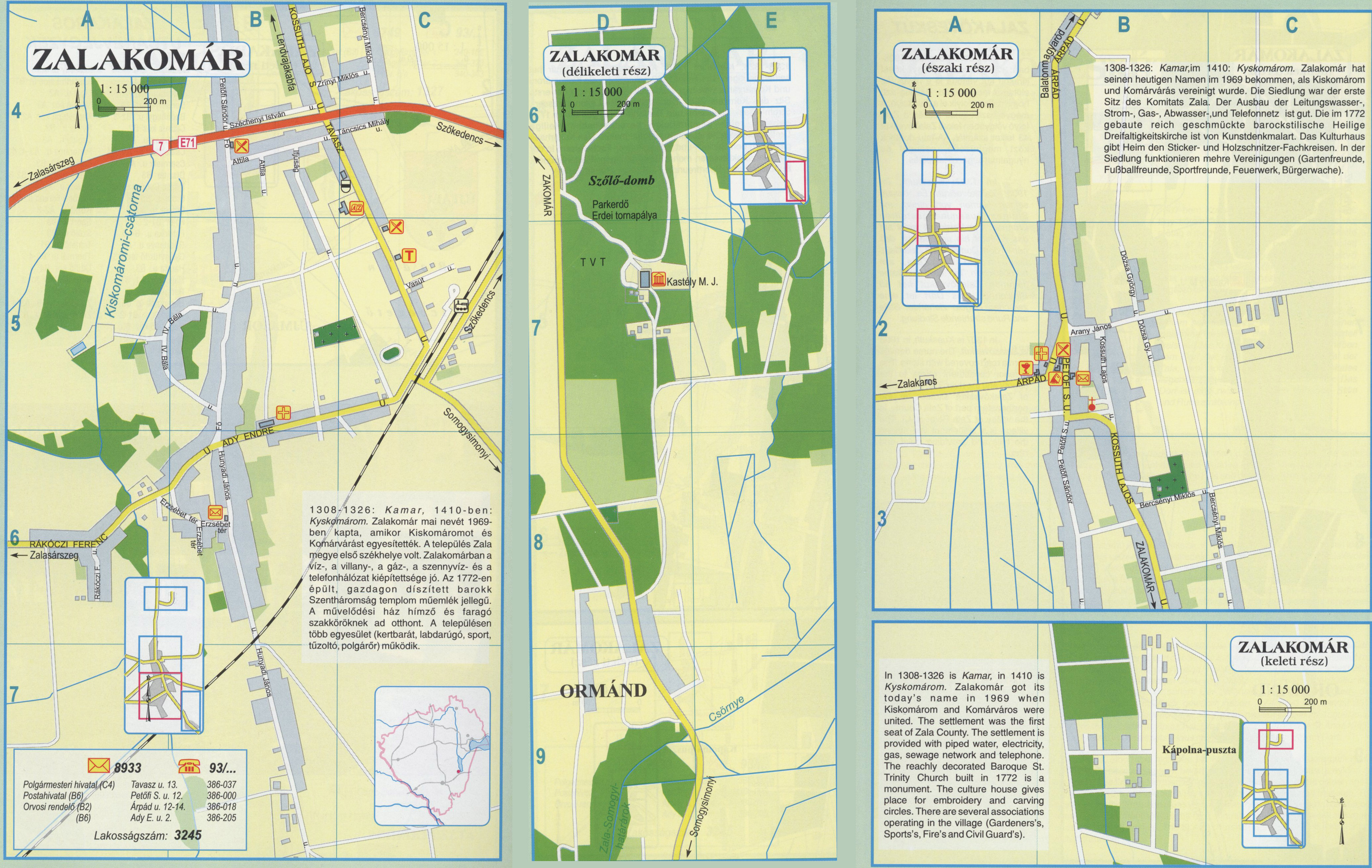 Nyilvános 1914 | 6515 | Rövid leírás | Teljes leírás (2.41 KB) | Zalakomár 1308-1326: Kamar, 1410-ben: Kyskomárom. Zalakomár mai nevét 1969-ben kapta, amikor Kiskomáromot és Komárvárást egyesítették. A település Zala megye első székhelye volt. Zalakomárban a víz-, a villany-, a gáz-, a szennyvíz- és a telefonhálózat kiépítettsége jó. Az 1772-en épült, gazdagon díszített barokk Szentháromság templom műemlék jellegű. A művelődési ház hímző és faragó szakköröknek ad otthont. A településen több egyesület (kertbarát, labdarúgó, sport, tűzoltó, polgárőr) működik. 1308-1326: Kamar,im 1410: Kyskomárom. Zalakomár hat seinen heutigen Namen im 1969 bekommen, als Kiskomárom und Komárvárás vereinigt wurde. Die Siedlung war der erste Sitz des Komitats Zala. Der Ausbau der Leitungswasser-, Strom-, Gas-, Abwasser-,und Telefonnetz ist gut. Die im 1772 gebaute reich geschmückte barockstilische Heilige Dreifaltigkeitskirche ist von Kunstdenkmalart. Das Kulturhaus gibt Heim den Sticker- und Holzschnitzer-Fachkreisen. In der Siedlung funktionieren mehre Vereinigungen (Gartenfreunde, Fußballfreunde, Sportfreunde, Feuerwerk, Bürgerwache). In 1308-1326 is Kamar, in 1410 is Kyskomárom. Zalakomár got its today\'s name in 1969 when Kiskomárom and Komán/áros were united. The settlement was the first seat of Zala County. The settlement is provided with piped water, electricity, gas, sewage network and telephone. The reachly decorated Baroque St. Trinity Church built in 1772 is a monument. The culture house gives place for embroidery and carving circles. There are several associations operating in the village (Gardeners\'s, Sports\'s, Fire\'s and Civil Guard\'s). A részlet a következő kiadványból származik/Die Teile stammen vom volgenden Buch/This text came from the following book: Cím/Titel/Title: Zala megye településeinek atlasza - 257 település részletes térképe/Atlas der Komitat Zala - 257 Detailte Siedlungskarten/Zala county\'s Atlas - 257 settlement maps. Közreműködő/contributor: Lackner László (1943) (fotó) Kiadás/Ausgabe/Publisher: Gyula : HISZI-MAP, 1997 Sorozat/Serie/Series: Indulástól - megérkezésig... ETO: 912(439.121-2) ; 908.439.121 Cutter: Z 19 ISBN: 963-610-025-4 Oldalszám/Seiten/Pages: 323, 81 p. Megjegyzés/Note: Lezárva/Abgeschlossen am/Closed am: 1997. máj. 30. |