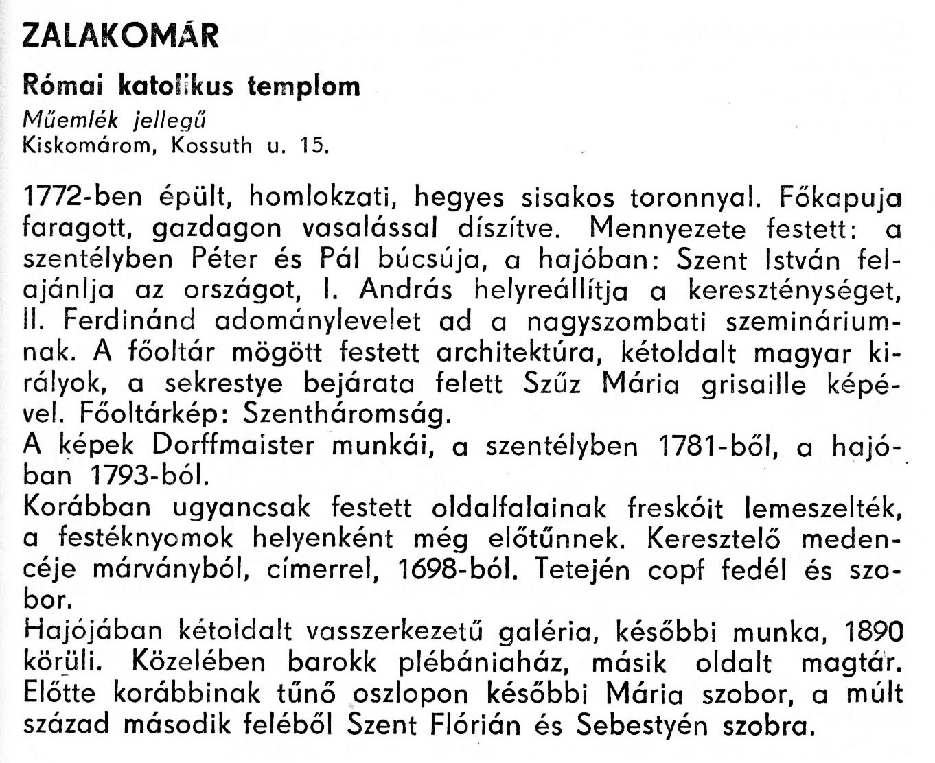 Nyilvános 1808 | 4876 | Rövid leírás | Teljes leírás (1.75 KB) | Zalakomár - Zala megye műemlékei 1977 097old A részlet szövege: ZALAKOMÁR Római katolikus templom Műemlék jellegű Kiskomárom, Kossuth u. 15. 1772-ben épült, homlokzati, hegyes sisakos toronnyal. Főkapuja faragott, gazdagon vasalással díszítve. Mennyezete festett: a szentélyben Péter és Pál búcsúja, a hajóban: Szent István felajánlja az országot, I. András helyreállítja a kereszténységet, II. Ferdinánd adománylevelet ad a nagyszombati szemináriumnak. A főoltár mögött festett architektúra, kétoldalt magyar királyok, a sekrestye bejárata felett Szűz Mária grisaille képével. Főoltárkép: Szentháromság. A képek Dorffmaister munkái, a szentélyben 1781-ből, a hajóban 1793-ból. Korábban ugyancsak festett oldalfalainak freskóit lemeszelték, a festéknyomok helyenként még előtűnnek. Keresztelő medencéje márványból, címerrel, 1698-ból. Tetején copf fedél és szobor. Hajójában kétoldalt vasszerkezetű galéria, későbbi munka, 1890 körüli. Közelében barokk plébániaház, másik oldalt magtár. Előtte korábbinak tűnő oszlopon későbbi Mária szobor, a múlt század második feléből Szent Flórián és Sebestyén szobra. A részlet a következő könyvből származik: Cím: Zala megye műemlékei Szerző: Németh József (1928) Közreműködő: Lantos Miklós (fotó) Szerz. közl.: Németh József ; [fotók... Lantos Miklós] Kiadás: Zalaegerszeg : Zalai Ny., 1977 ETO jelzet: 72(439.121) ; 7.025.3/.4 ; 908.439.121 Tárgyszó: Zala megye Szakjelzet: 908 Cutter: N 53 Nyelv: magyar Oldalszám: 109 p. |