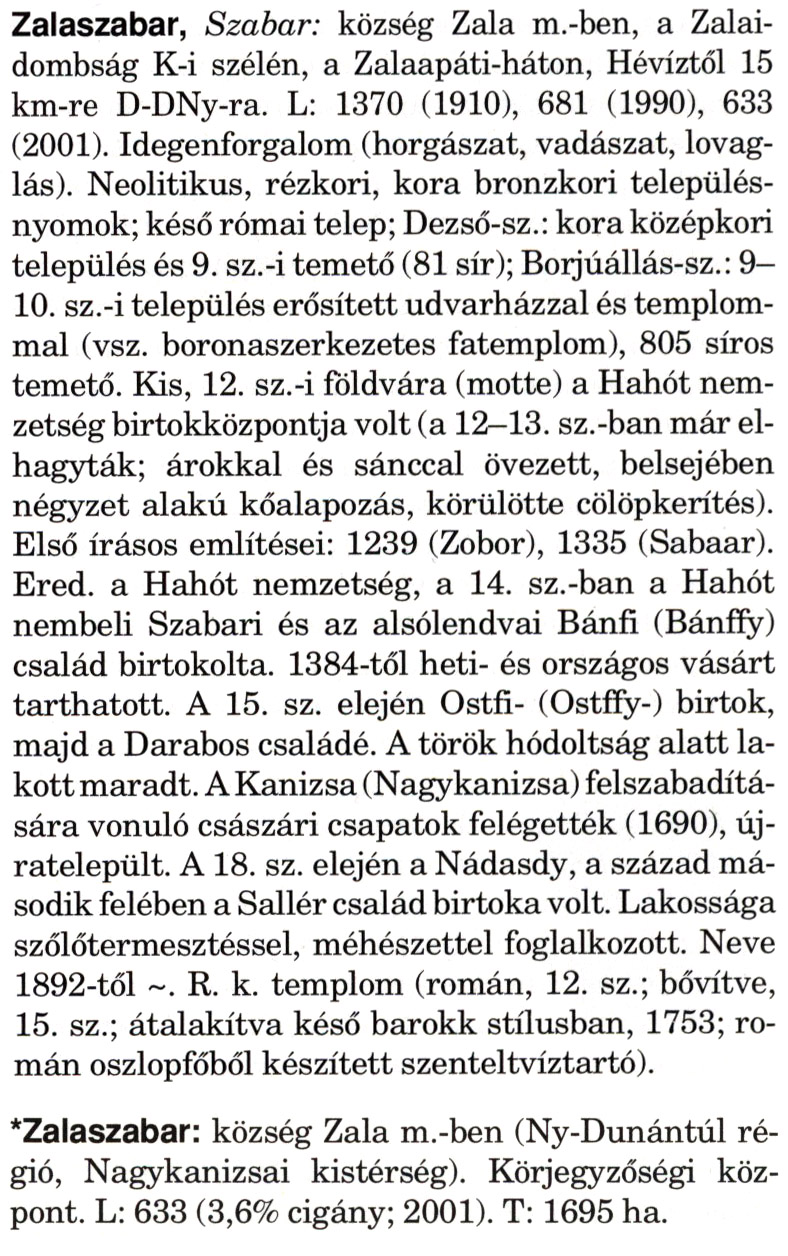 Nyilvános 2215 | 5756 | Rövid leírás | Teljes leírás (3.32 KB) | A szócikkek felismertetett szövege: (A csillag után a kiegészítő kötetből származó szöveg következik) Zalaszabar, Szabar: község Zala m.-ben, a Zalai-dombság K-i szélén, a Zalaapáti-háton, Hévíztől 15 km-re D-DNy-ra. L: 1370 (1910), 681 (1990), 633 (2001). Idegenforgalom (horgászat, vadászat, lovaglás). Neolitikus, rézkori, kora bronzkori településnyomok; késő római telep; Dezső-sz.: kora középkori település és 9. sz.-i temető (81 sír); Borjúállás-sz.: 9— 10. sz.-i település erősített udvarházzal és templommal (vsz. boronaszerkezetes fatemplom), 805 síros temető. Kis, 12. sz.-i földvára (motte) a Hahót nemzetség birtokközpontja volt (a 12—13. sz.-ban már elhagyták; árokkal és sánccal övezett, belsejében négyzet alakú kőalapozás, körülötte cölöpkerítés). Első írásos említései: 1239 (Zobor), 1335 (Sabaar). Ered. a Hahót nemzetség, a 14. sz.-ban a Hahót nembeli Szabari és az alsólendvai Bánfi (Bánffy) család birtokolta. 1384-től heti- és országos vásárt tarthatott. A 15. sz. elején Ostfi- (Ostffy-) birtok, majd a Darabos családé. A török hódoltság alatt lakott maradt. A Kanizsa (Nagykanizsa) felszabadítására vonuló császári csapatok felégették (1690), újratelepült. A 18. sz. elején a Nádasdy, a század második felében a Sallér család birtoka volt. Lakossága szőlőtermesztéssel, méhészettel foglalkozott. Neve 1892-től ~. R. k. templom (román, 12. sz.; bővítve, 15. sz.; átalakítva késő barokk stílusban, 1753; román oszlopfőből készített szenteltvíztartó). *Zalaszabar: község Zala m.-ben (Ny-Dunántúl régió, Nagykanizsai kistérség). Körjegyzőségi központ. L: 633 (3,6% cigány; 2001). T: 1695 ha. A szócikkek a következő lexikonból származnak: Cím: Magyar nagylexikon Közreműködő: Élesztős László (1949) (szerk.) ; Barabás Éva (1943) (szerk.) ; Berényi Gábor (1946) (szerk.) ; Bárány Lászlóné (szerk.) ; Adelmann-né Kertész Judit (1945) (közrem.) ; Froemel Károlyné Jáky Éva (1936) (közrem.) ; Akadémiai Kiadó és Nyomda Vállala Szerz. közl.: [... Élesztős László főszerk.] ; [szerk. Barabás Éva et al.] ; [bibliogr. Adelmanné Kertész Judit] ; [kész. az Akadémiai Kiadó Magyar Nagylexikon Szerkesztőségében] Kiadás: Budapest : Akad. K., 1993- Kötetei: 1. köt., A - Anc 2. köt., And - Bag 3. köt., Bah - Bij 4. köt., Bik - Bz 5. köt., C - Csem 6. köt., Csen - Ec 7. köt., Ed - Fe 8. köt., Ff - Gyep 9. köt., Gyer - Iq 10. köt., Ir - Kip 11. köt., Kir - Lem 12. köt., Len - Mep 13. köt., Mer - Nyk 14. köt., Nyl - Pom 15. köt., Pon - Sek 16. köt., Sel - Szö 17. köt., Szp - Ung 18. köt., Unh - Z 19. köt., Kiegészítő kötet, A - Z ETO jelzet: 030=945.11 Szakjelzet: 030 Cutter: M 14 ISBN: 963-05-6611-7 [!ISBN 963-05-6615-X] Nyelv: magyar Megjegyzés: Az 5. kötettől kiad. a Magyar Nagylexikon Kiadó ; A 6. kötettől főszerk. Berényi Gábor ; A 6. kötettől szakszerk. Bárány Lászlóné et al. ; A 6. kötettől bibliogr. Froemel Károlyné ; Bibliogr. a szócikkek végén |