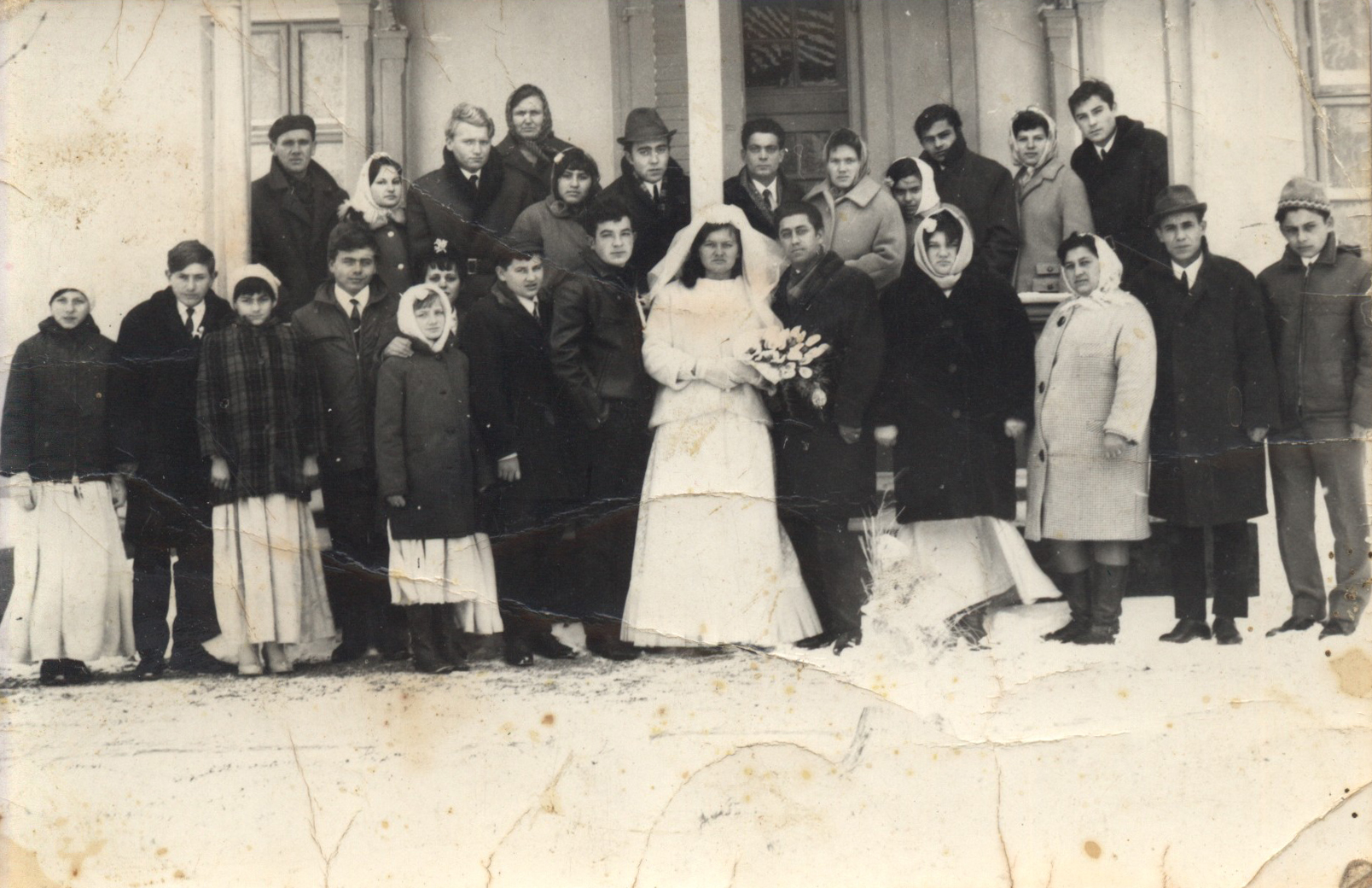 Nyilvános 1629 | 3954 | 1970-75 körül Baranyai Ibolya és Baranyai József esküvője - hátsó sor 3. Baranyai József 6. Csizmadia József, utolsó Horváth József. Első sor, a férjtől jobbra Horváth Rózsa, Horváth Istvánné, Horváth István és Horváth József. A kép a Kiskomáromi templom előtt készült. | |