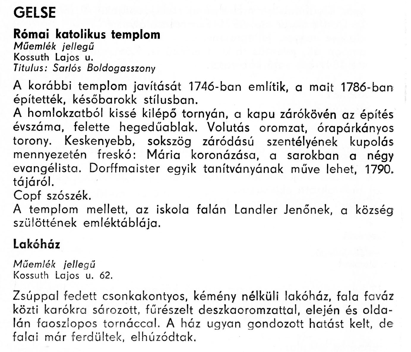 Nyilvános 1758 | 3942 | Gelse - Zala megye műemlékei 1977 058old | A részlet szövege: GELSE Római katolikus templom Műemlék jellegű Kossuth Lajos u. Titulus: Sarlós Boldogasszony A korábbi templom javítását 1746-ban említik, a mait 1786-ban építették, későbarokk stílusban. A homlokzatból kissé kilépő tornyán, a kapu zárókövén az építés évszáma, felette hegedűablak. Volutás oromzat, órapárkányos torony. Keskenyebb, sokszög záródású szentélyének kupolás mennyezetén freskó: Mária koronázása, a sarokban a négy evangélista. Dorffmaister egyik tanítványának műve lehet, 1790. tájáról. Copf szószék. A templom mellett, az iskola falán Landler Jenőnek, a község szülöttének emléktáblája. Lakóház Műemlék jellegű Kossuth Lajos u. 62. Zsúppal fedett csonkakontyos, kémény nélküli lakóház, fala faváz közti karókra sározott, fűrészelt deszkaoromzattal, elején és oldalán faoszlopos tornáccal. A ház ugyan gondozott hatást kelt, de falai már ferdültek, elhúzódtak. A részlet a következő könyvből származik: Cím: Zala megye műemlékei Szerző: Németh József (1928) Közreműködő: Lantos Miklós (fotó) Szerz. közl.: Németh József ; [fotók... Lantos Miklós] Kiadás: Zalaegerszeg : Zalai Ny., 1977 ETO jelzet: 72(439.121) ; 7.025.3/.4 ; 908.439.121 Tárgyszó: Zala megye Szakjelzet: 908 Cutter: N 53 Nyelv: magyar Oldalszám: 109 p. |