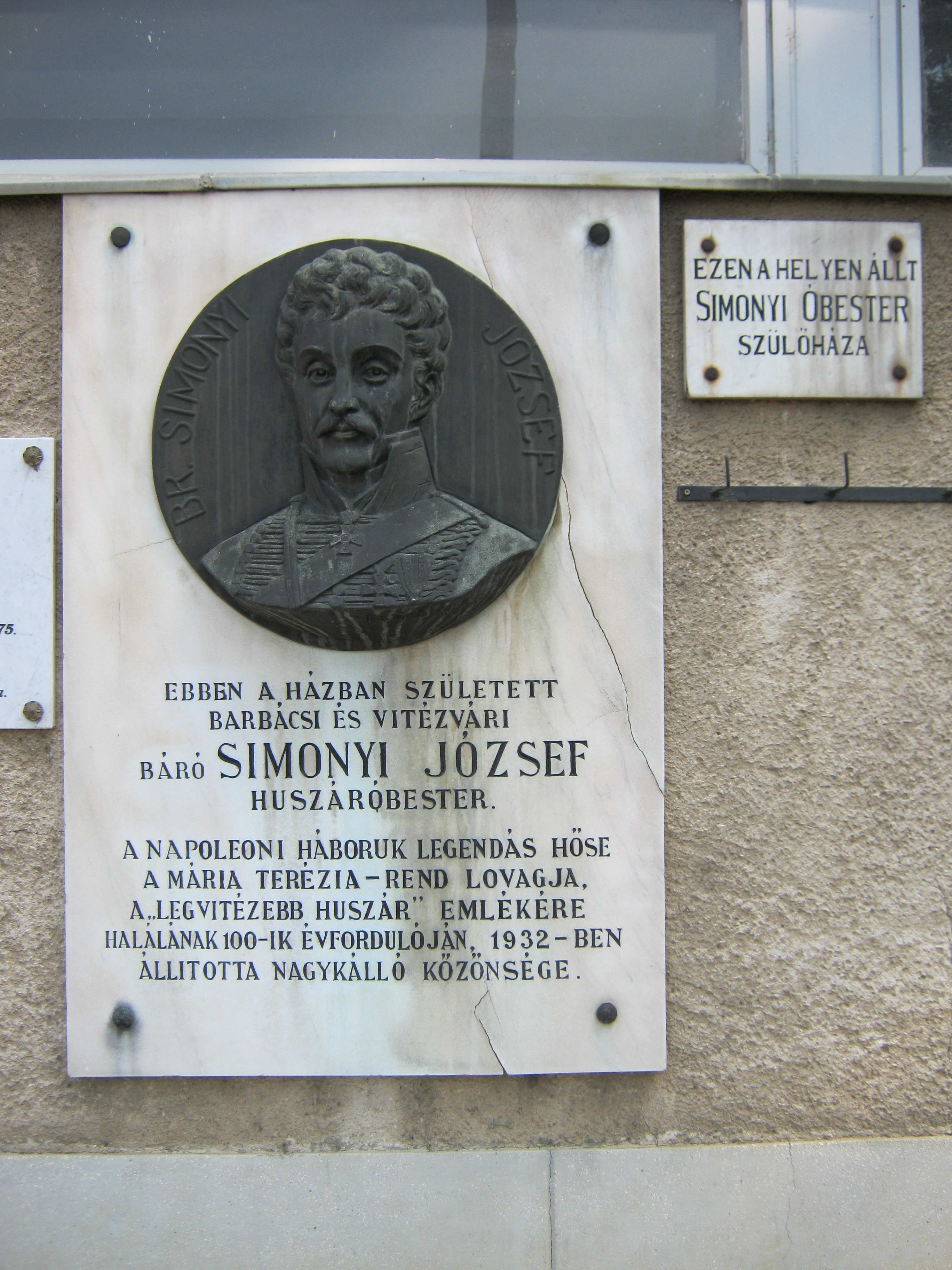 Nyilvános 1301 | 2768 | Nagykálló, Bátori út 2. | Egykor ezen a helyen állott a legendás Simonyi óbester szülőháza. Barbácsi és vitézvári báró Simonyi József (1771. március 18. – 1832. augusztus 23.), legendás hírű huszártiszt volt, kortársai "a legvitézebb huszár" kitüntető címmel illették. A panelházon szerencsére legalább látható az eredeti épületen 1932-ben elhelyezett emléktábla, egy új márványtáblán pedig megörökítették a szülőház képét. A fénykép 2010 augusztus elején készült. |
