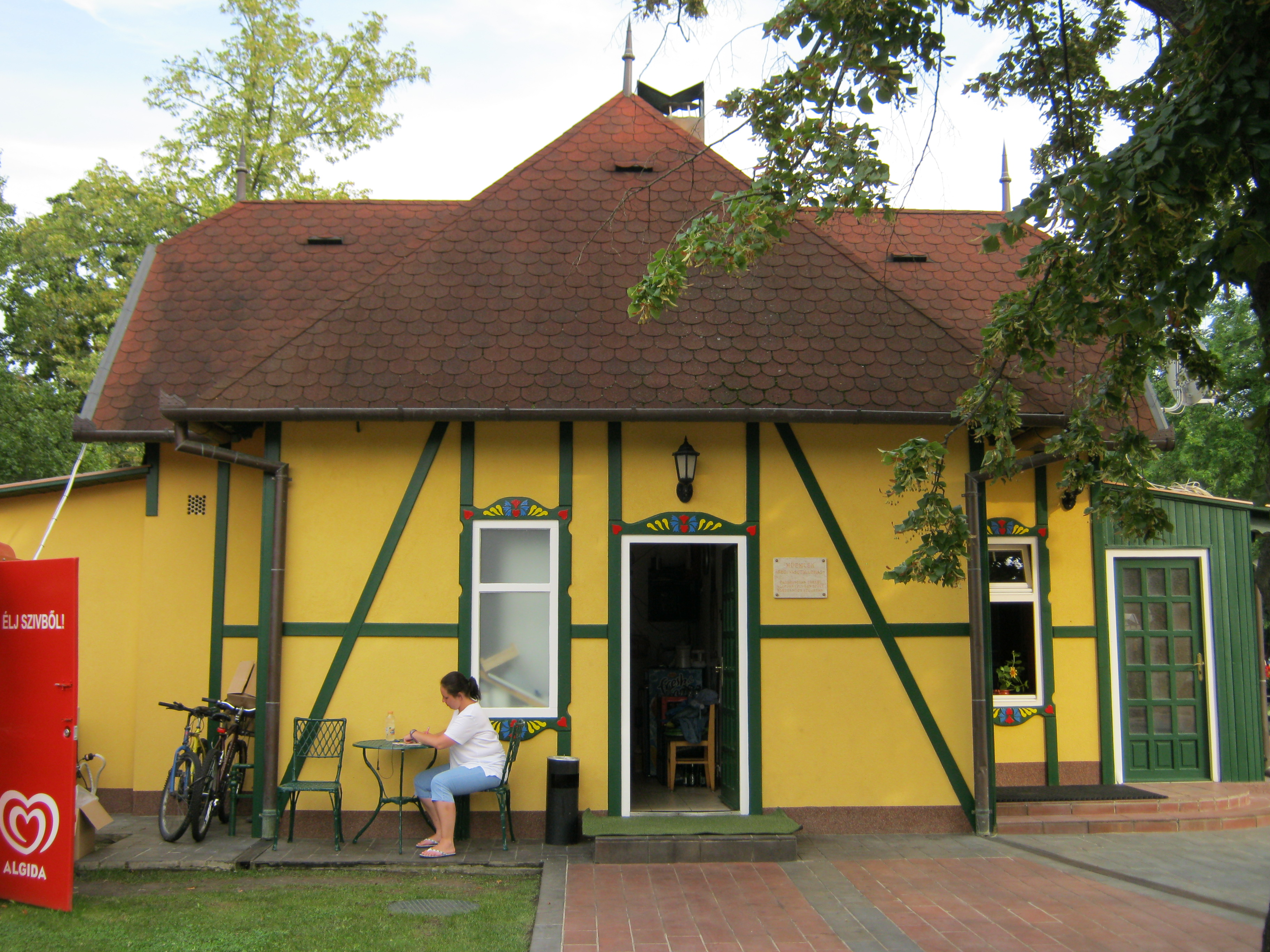 Nyilvános 1009 | 1774 | Nyíregyháza-Sóstó, Vasútállomás | Sóstófürdő központjában ma étteremként üzemel a régi vasútállomás műemlékké nyilvánított épülete. 1911-ben ezt is Pazár István tervezte, eklektikus stílusban. Közelében egy régi mozdony is látható. A fénykép 2010 augusztus elején készült |