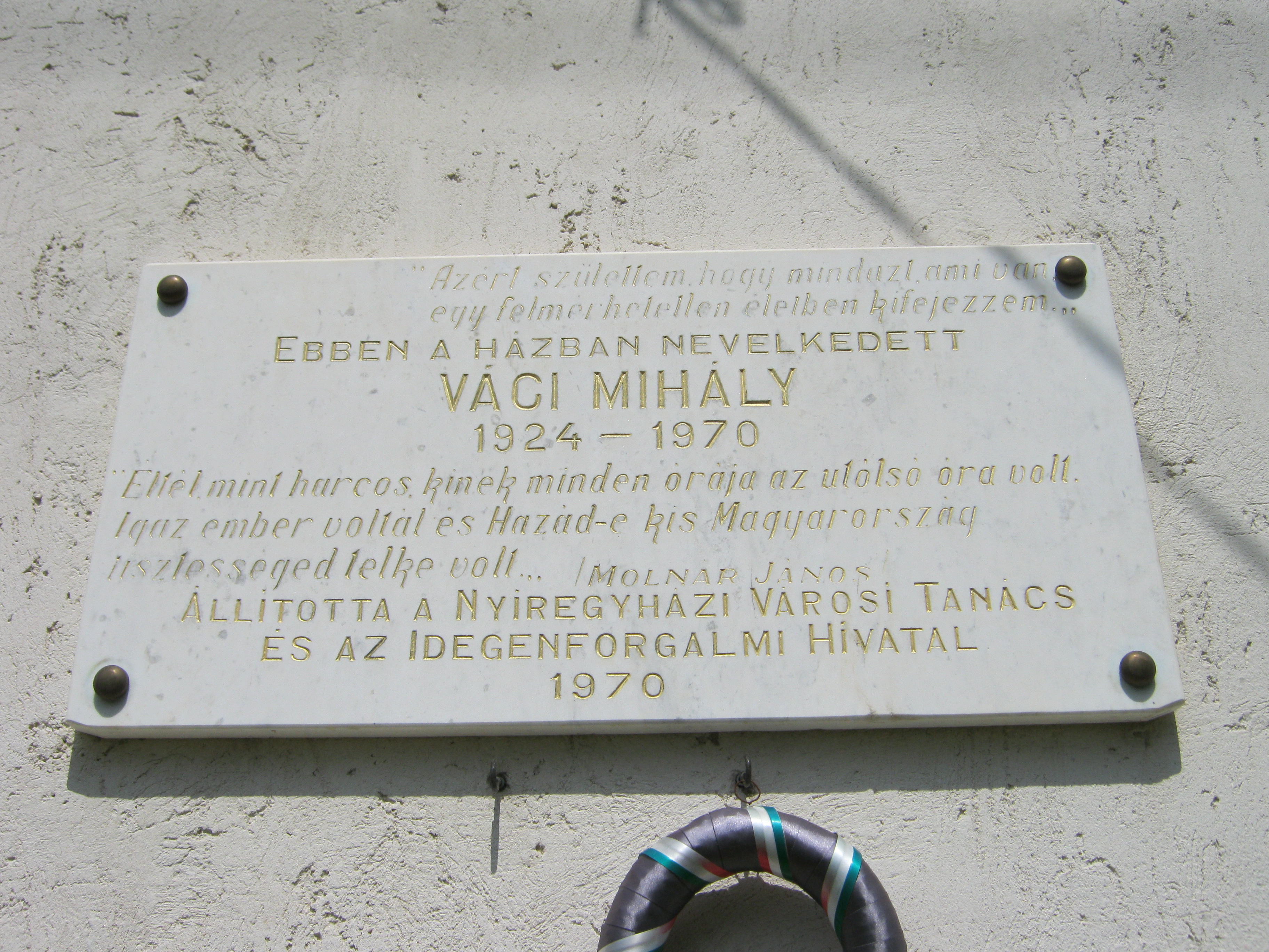 Nyilvános 971 | 1318 | Nyíregyháza, Bartók Béla utca 32. | Mielőtt a Debrecen felé vezető műút átszelné a vasútvonalat, Nyíregyháza központjától távol, a Bartók Béla utcában ma is álló családi házon emléktáblát találunk: "Ebben a házban nevelkedett Váci Mihály". A Szeder utca 59. alatt egykor álló zsúptetős cselédházban született (oda sajnos nem jutottam el, a mai épületet ott is emléktábla jelöli). Életrajzírója, Kovács Sándor Iván így jellemzi gyermekkori környezetét: "Nincs még egy költőnk Illyés Gyula óta, akinek indulását oly meghatározó erővel befolyásolná szülőföld és családi környezet, mint Váci Mihályét. Szülőföldjéről egyszerre hozta magával a nyírségi tájak és a szociális nyomorúság élményét; a tébécé halálos fenyegetésén kívül egyedül ezt jussolta 'névtelen kis cseléd' őseitől, s költészetének és prózájának mindvégig éltető közege ez a kettős inspiráció." A költő 15 éves koráig lakott egy szobában csont-tuberkulózisban szenvedő nagyanyjával. Hat testvére közül csak egy maradt életben. Ebből a közegből származva végezte el a tanítóképzőt (lásd: Nyíregyháza, Széchenyi u. 6.), majd pályáját tanyasi tanítóként kezdte. Váci Mihály nyíregyházi emlékhelyeiről kiváló összefoglalás található itt (2010. 08. 29.): www.vacimihalykor.hu/siremlekek/nyiregyhaza.htm Felh. irod.: Kovács Sándor Iván: Váci Mihály. Bp. Akadémiai Kiadó, 1972 A fénykép 2010 augusztus elején készült. |