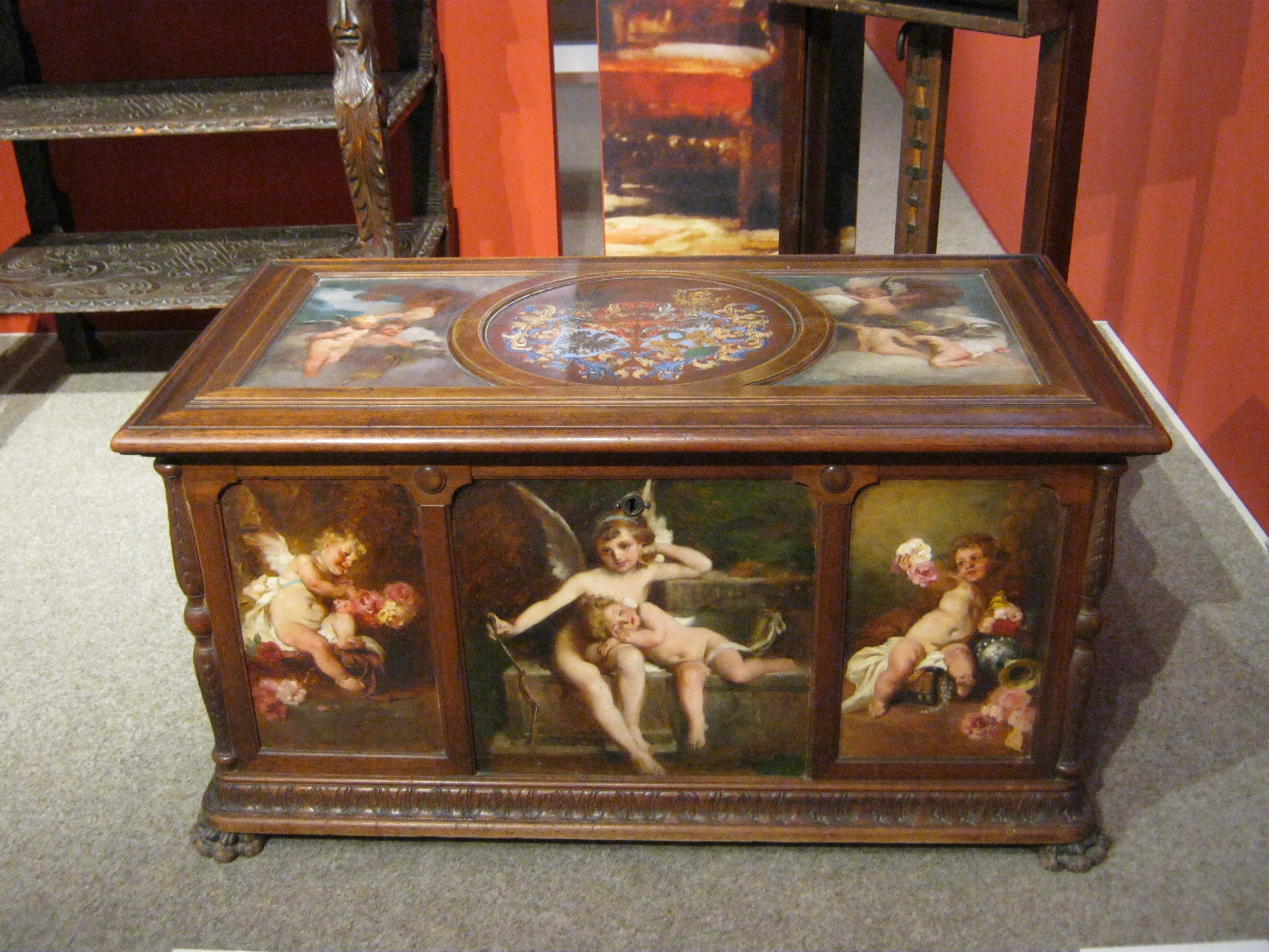 Nyilvános 994 | 1454 | Nyíregyháza, Benczúr tér 21. Jósa András Múzeum | Magyarország egyik legrégibb múzeumát Dr. Jósa András alapította 1868-ban, akinek ma nevét viseli. A képen Benczúr Gyula emlékszobájának részlete. A nagy magyar festőművész 1844-ben Nyíregyházán született (lásd: Nyíregyháza, Kossuth tér 8.), apja gyógyszerész volt. A Benczúr-emlékszobában alkotásai mellett eredeti bútorok, s a festőművész több használati tárgya is megtekinthető, mint például ez a díszes láda, amelyet ő maga díszített festményekkel. Felh. irod.: Látnivalók Szabolcs-Szatmár-Bereg megyében. Miskolc, Well-PRess, 1999 http://jam.nyirbone.hu A fénykép 2010 augusztus elején készült. |