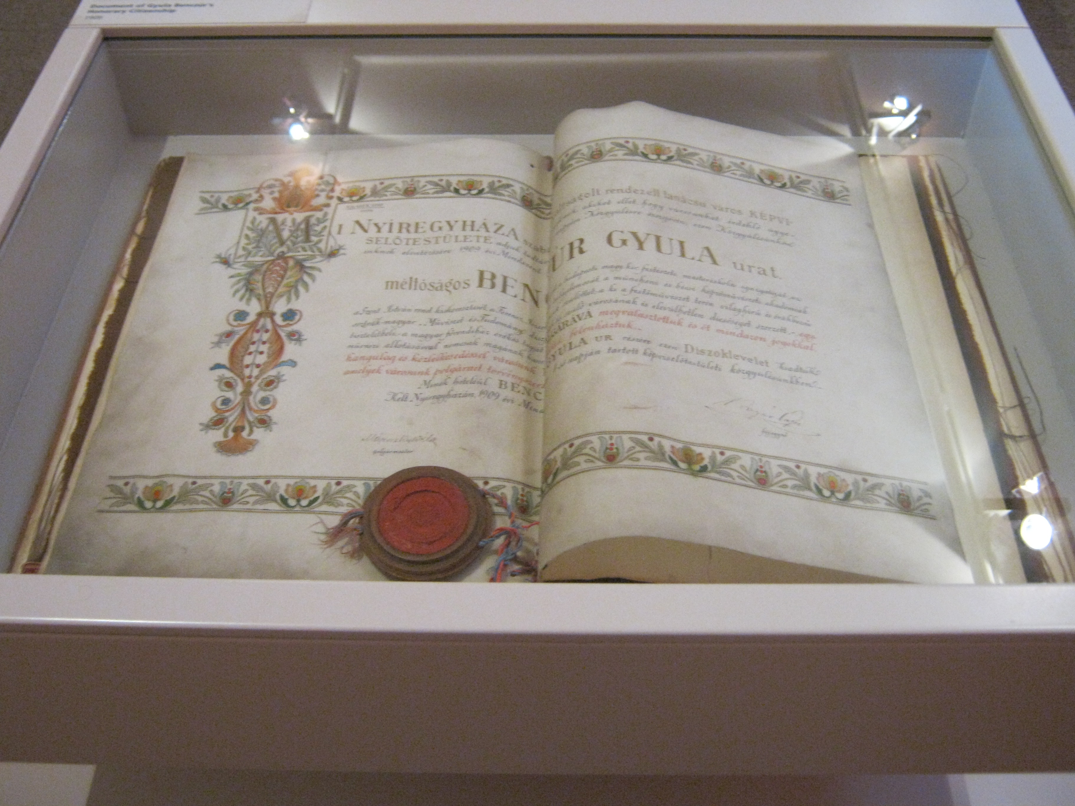 Nyilvános 1011 | 1488 | Nyíregyháza, Benczúr tér 21. Jósa András Múzeum | Magyarország egyik legrégibb múzeumát Dr. Jósa András alapította 1868-ban, akinek ma nevét viseli. A képen Benczúr Gyula emlékszobájának részlete. A nagy magyar festőművész 1844-ben Nyíregyházán született (lásd: Nyíregyháza, Kossuth tér 8.), apja gyógyszerész volt. A Benczúr-emlékszobában alkotásai mellett eredeti bútorok, s a festőművész több használati tárgya is megtekinthető. A képen Benczúr 1909-ből származó díszpolgári oklevele. Felh. irod.: Látnivalók Szabolcs-Szatmár-Bereg megyében. Miskolc, Well-PRess, 1999 http://jam.nyirbone.hu A fénykép 2010 augusztus elején készült. |