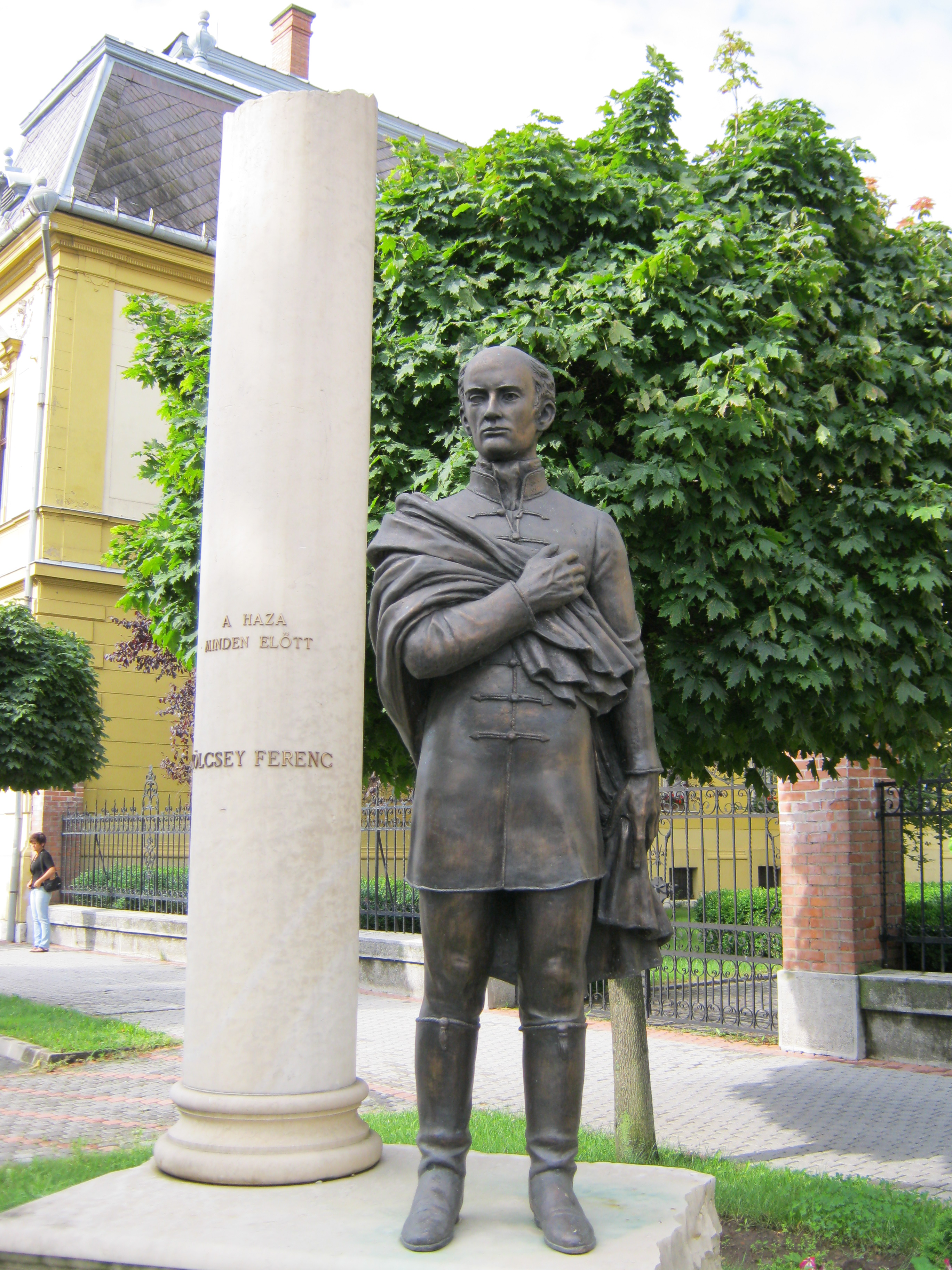 Nyilvános 1019 | 1453 | Nyíregyháza, Hősök tere 5. Megyeháza | Az eklektikus stílusú megyeháza 1891-1892-ben, Alpár Ignác tervei szerint épült. Homlokzatát Szabolcs vezér és az államalapító István király szobrai díszítik. Az épületplasztikák és díszítmények Verán József munkái. Nyíregyháza 1876-ban lett megyeszékhely, korábban Nagykálló töltötte be ezt a szerepet. Az épület előtt 2008-ban állították fel Bíró Lajos Kölcsey Ferencet megjelenítő szoborkompozícióját. A költőt szívre tett kézzel ábrázoló köztéri alkotást a Himnusz születésének 185. és Kölcsey halálának 170. évfordulójára emlékezve emelték. Az oszlop felirata: A haza minden előtt. Kölcsey Szatmár vármegye főjegyzője és országgyűlési követe volt. Szabadelvű politikusként a nemzeti függetlenségért, a polgári és emberi jogokért, a jobbágyfelszabadításért, a nemzeti egységért, a vallási egyenjogúságért és türelemért, a magyar nyelv hivatalossá tételéért dolgozott. Tiltakozásul a vármegye felszólítására, hogy az örökváltság ellen szavazzon, képes volt lemondani politikai karrierjéről. Felh. irod.: Látnivalók Szabolcs-Szatmár-Bereg megyében. Miskolc, Well-PRess, 1999 www.szoborlap.hu A fénykép 2010 augusztus elején készült. |