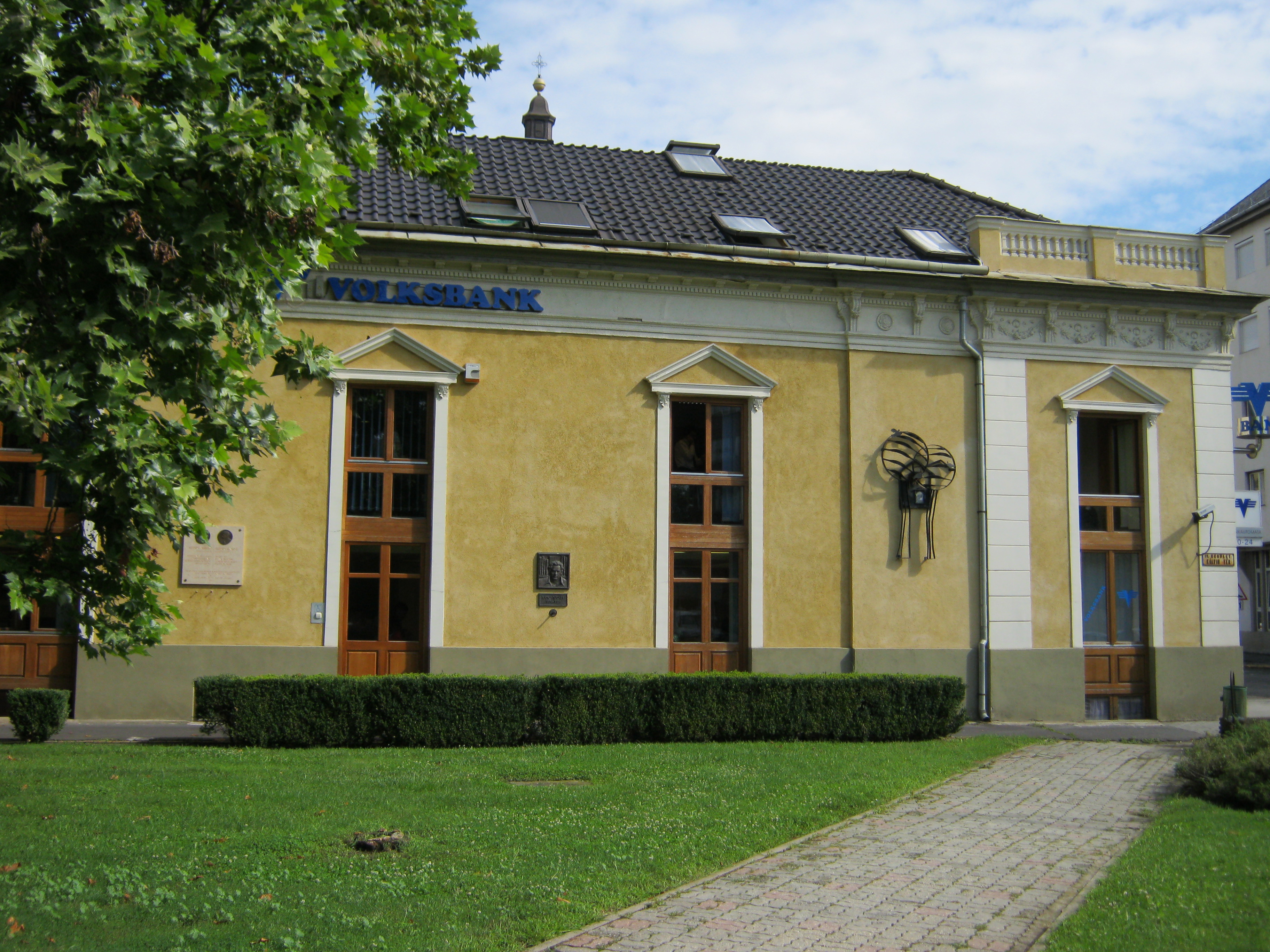 Nyilvános 990 | 1610 | Nyíregyháza, Kálvin tér - Bercsényi utca sarok | Az épületn két emléktábla látható. Az egyik Barzó Mihálynak (1857-1909) és fiának, Barzó Endrének (1898-1953) állít emléket. Ez lehetett a családi házuk - vagy ennek helyén állt, pontosabb információkat nem találtam és tábla feliratából sem derül ki teljesen. Barzó Mihály nyíregyházi építőmester volt. Az Operaház munkálatainál építésvezetői beosztásban is dolgozott. Barzó Endre festőművész élete nagy sikerét a Barcelonában rendezett világkiállításon érte el, aranyérmet kapott. Az emléktáblát 2003. augusztus 25.-én, Barzó Mihály halálának 50. évfordulóján helyezték el. A fénykép 2010 augusztus elején készült. Felh. irod.: www.szoborlap.hu Szatmári Gizella: Barzó Endre. = Szabolcs-Szatmár-Beregi Szemle 2006, február |