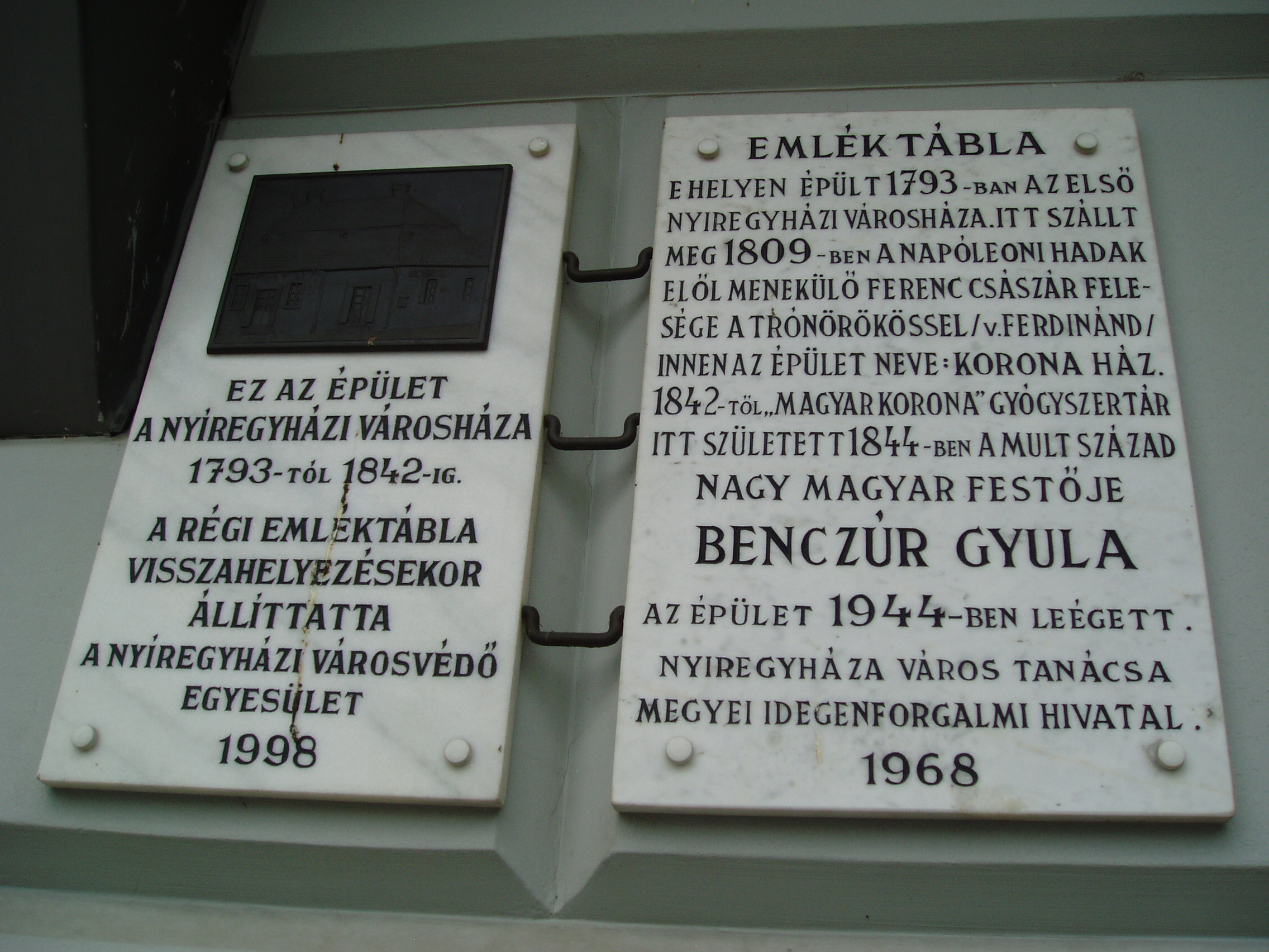 Nyilvános 1024 | 1497 | Nyíregyháza, Kossuth tér 8. | A Kossuth tér déli részét ma a modern Metropol üzletház uralja. Valaha itt állt az 1793-ban felépült városháza, amelyben - a napóleoni hadak elől menekülve - 1809-ben megszállt Ferenc császár felesége a trónörökössel, a leendő V. Ferdinánddal, s állítólag magával hurcolta a koronát is. Később itt működött Benczúr gyógyszerész "Magyar Korona" nevű gyógyszertára, s ebben az épületben született 1844-ben fia, Benczúr Gyula festőművész. Felh. irod.: Látnivalók Szabolcs-Szatmár-Bereg megyében. Miskolc, Well-PRess, 1999 A fénykép 2010 augusztus elején készült. |