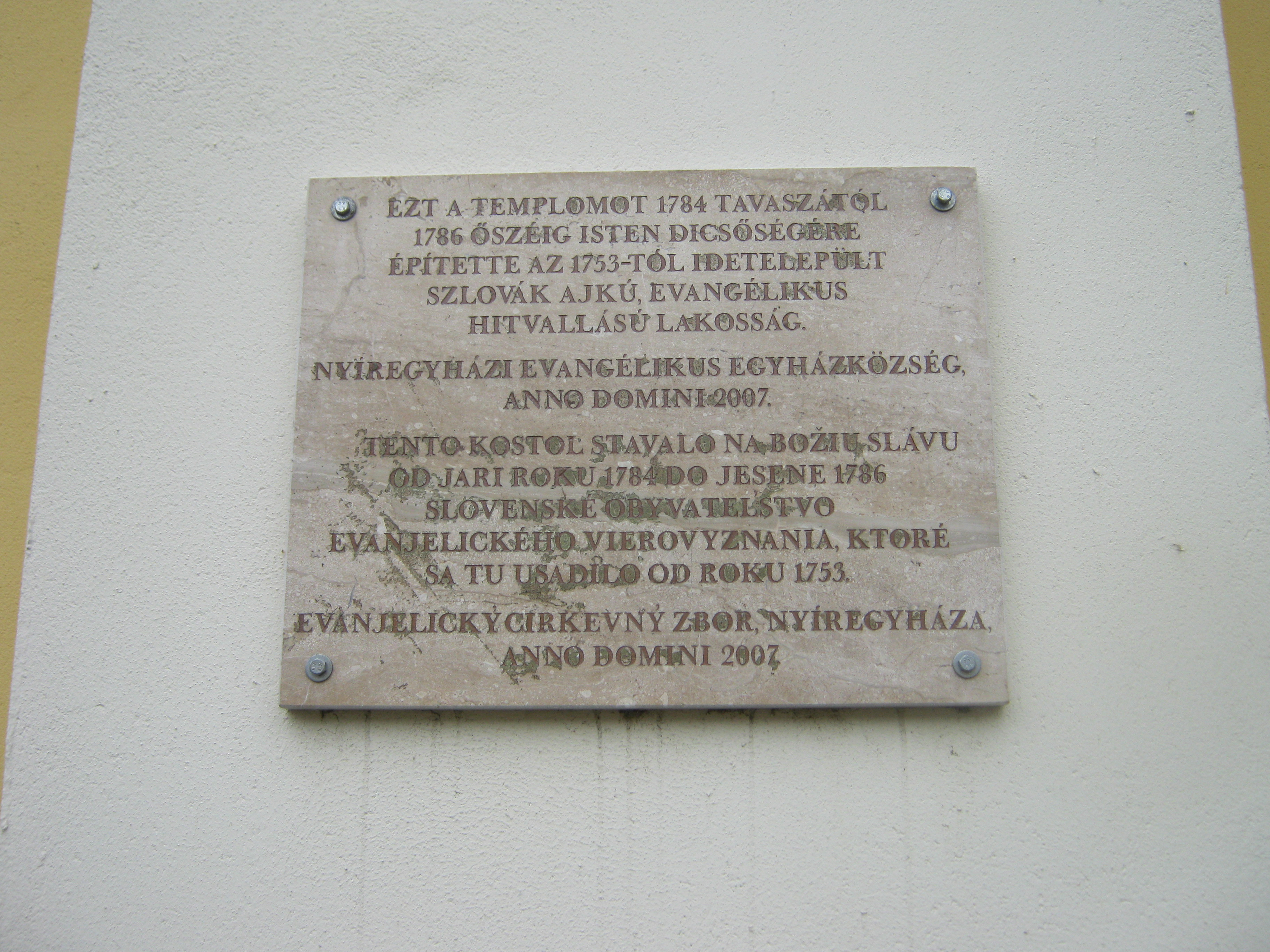 Nyilvános 961 | 1296 | Nyíregyháza, Luther tér 1. Evangélikus templom | A késő barokk épület tervezője Giuseppe Aprilis volt, alapkövét 1784-ben rakták le, s két év múlva fel is szentelhették. Építtetője az 1750-es évek közepétől Nyíregyházára települt szlovák ajkú, evangélikus hitvallású lakosság volt. Belső díszítőfestése a nyíregyházi Benczúr Gyula tervei alapján készült. 1910-ből származó orgonája Rieger Ottó műve. Az 1928-ban készült harangjáték a Luther Márton által írt "Jövel Szentlélek Úristen" kezdetű ének első két sorát játssza. A fénykép 2010 augusztus elején készült. Felh. irod.: Látnivalók Szabolcs-Szatmár-Bereg megyében. Miskolc, Well-PRess, 1999 |
