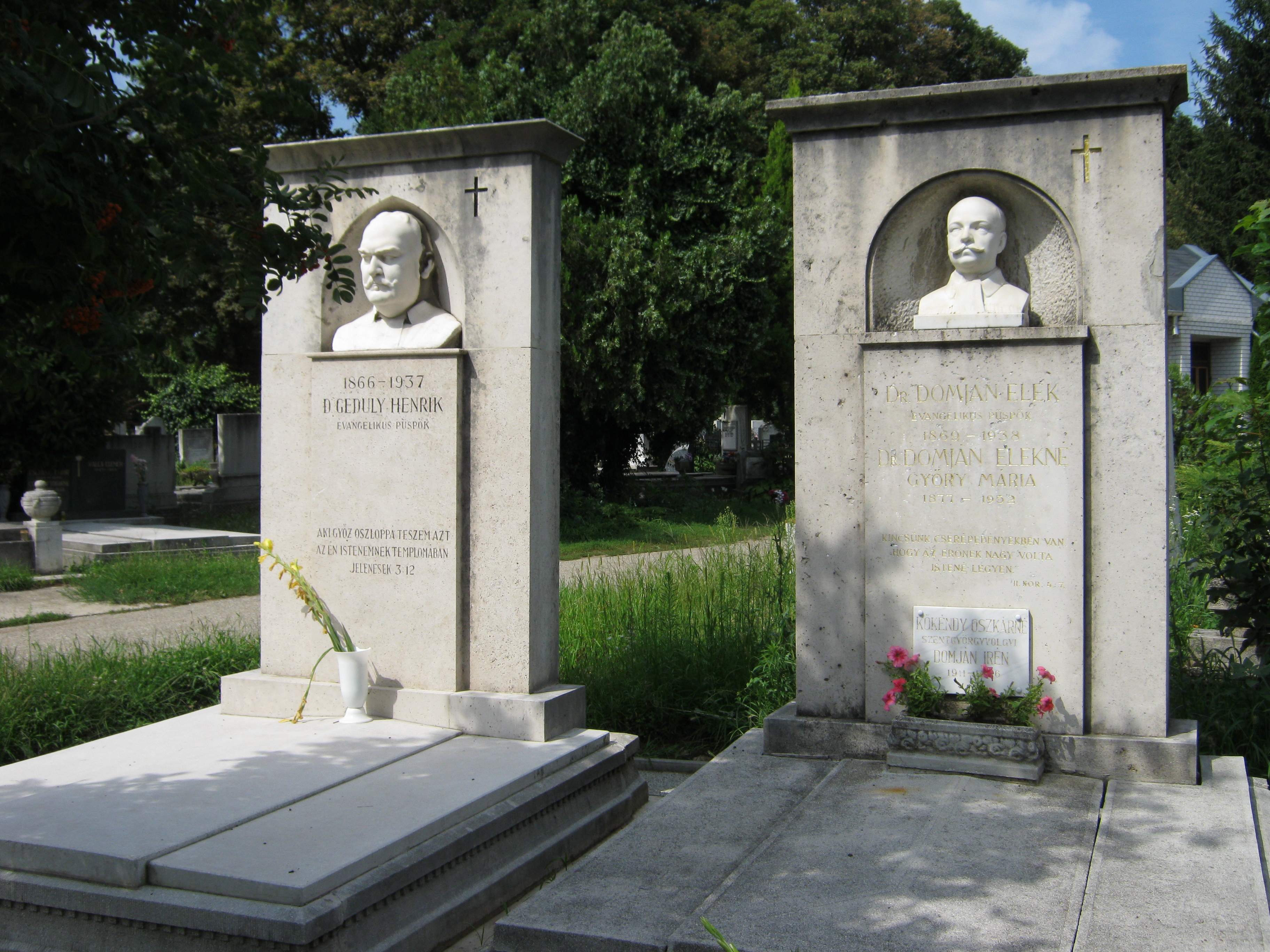 Nyilvános 1046 | 3034 | Nyíregyháza, Pazonyi tér, Északi temető: Geduly Henrik és Domján Elek | A Dózsa György út vezet Nyíregyháza Északi temetőjébe. A ravatalozó mögötti díszsírhelyen nyugszik Nyíregyháza két kiváló személyisége, evangélikus püspöke, dr. Geduly Henrik (1866-1937) és dr. Domján Elek (1869-1928). Felh. irod.: Fazekas Árpád - Szekrényes András: Nyíregyháza temetői. Nyíregyháza, 1990 A fénykép 2010 augusztus elején készült |