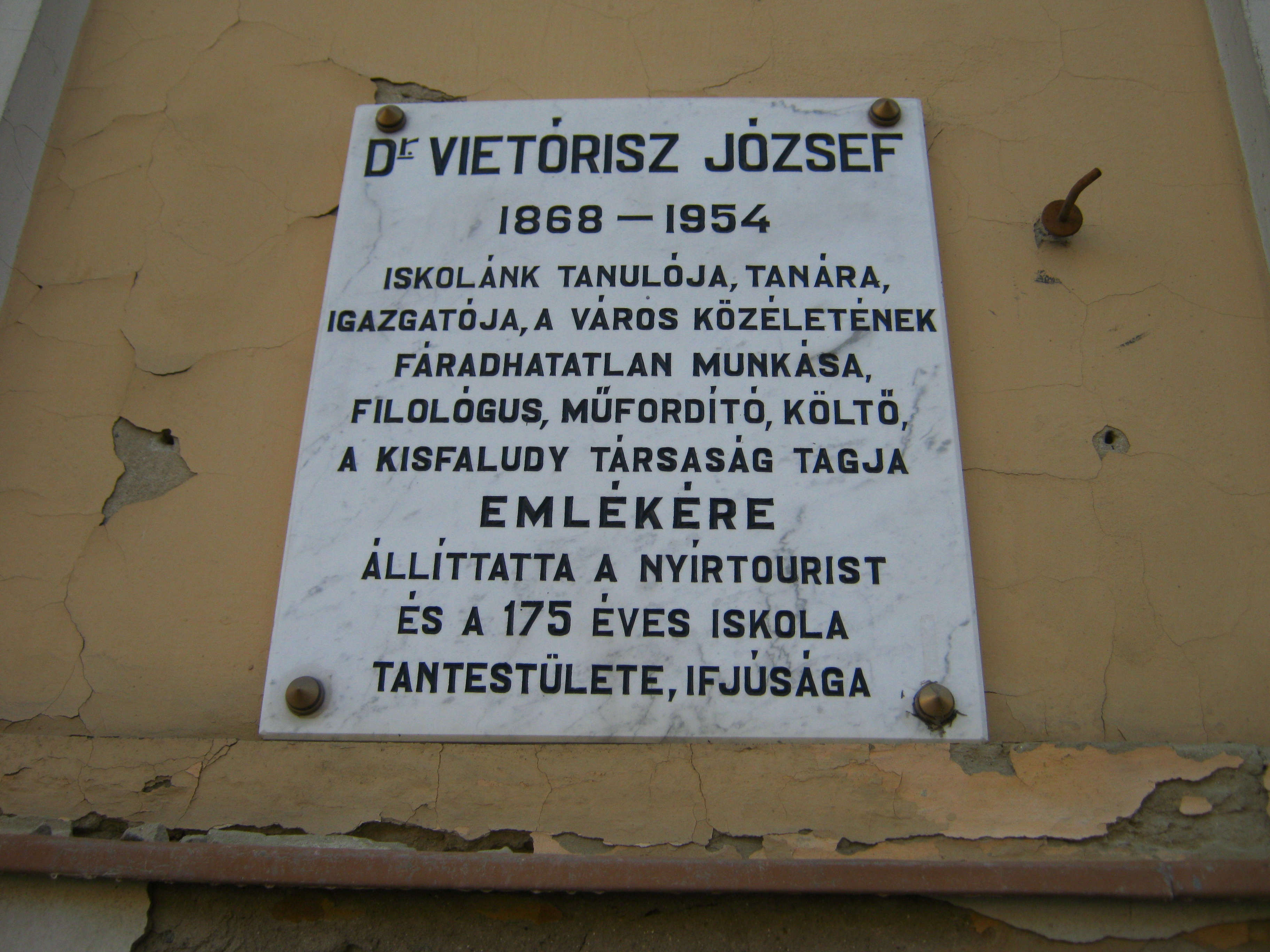 Nyilvános 956 | 1341 | Nyíregyháza, Szent István utca 19. Evangélikus Kossuth Lajos Gimnázium | A megye legrégibb középiskolája. 1808-ban alapították mint evangélikus professzori iskolát (lásd: Nyíregyháza, Luther utca 5.). Nyolc osztályos gimnáziummá 1888-ra fejlesztették fel. Mai épületét ekkoriban, 1887-ben emelték Bobula János tervei szerint. Kossuth Lajos nevét 1921-ben vette fel. Az 1948-ban államosított iskolát 1992-ben kapta vissza az evangélikus egyház. Homlokzatán számos márványtábla emlékezik kiváló diákjaira, tanáraira. Dr. Vietórisz József az iskola tanulója, majd tanára és igazgatója volt. A jeles tanár és költő fordította le a tirpákok népszerű énekeskönyvének, a Tranoscius-nak szövegeit. A Bessenyei kör kiemelkedő alakja, a Kisfaludy Társaság rendes tagja is volt. Felh. irod.: www.eklg.hu A fénykép 2010 augusztus elején készült |