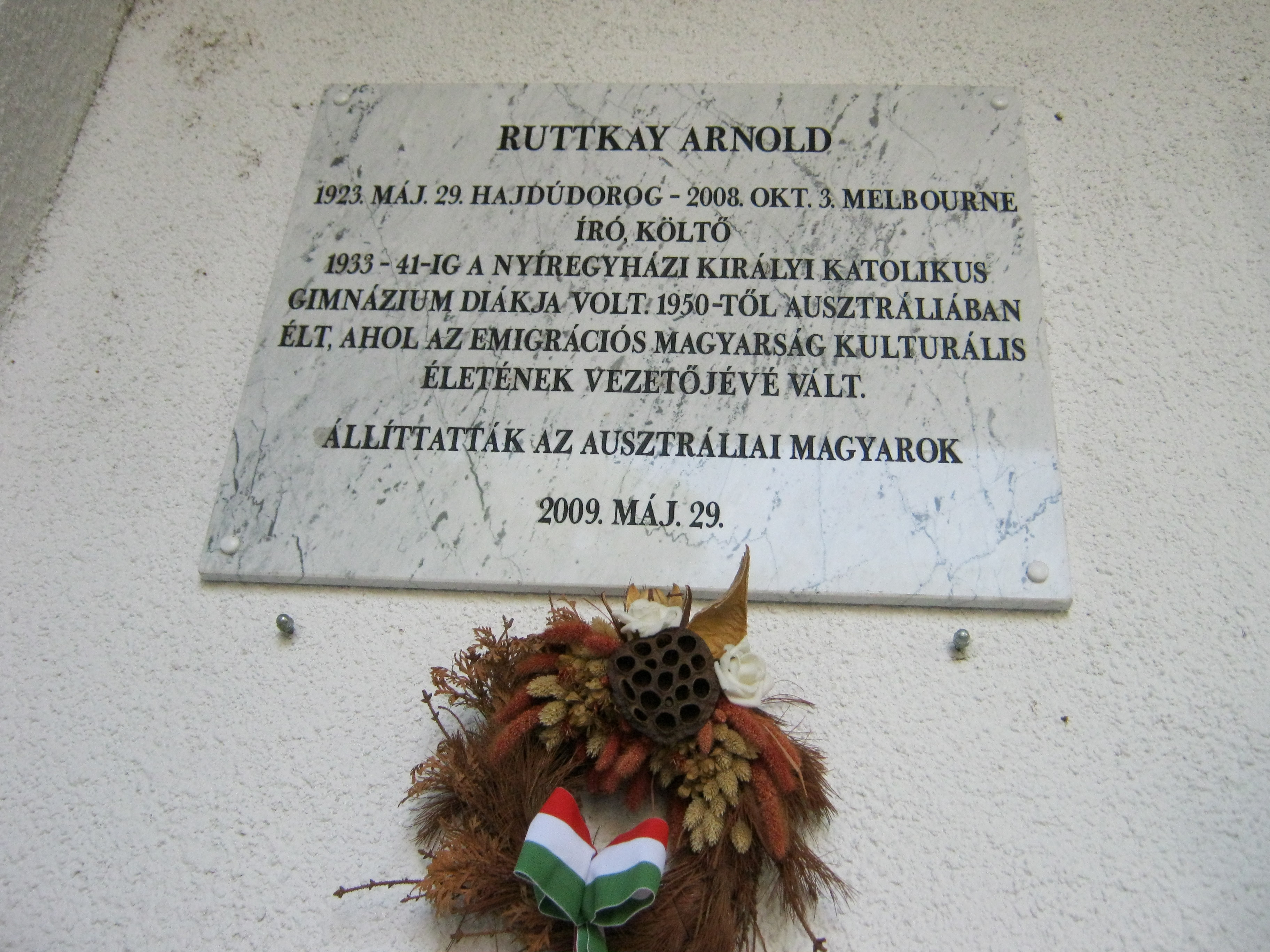 Nyilvános 1026 | 1610 | Nyíregyháza, Ungvár sétány 19. Szent Imre Katolikus Gimnázium | Az iskola előde az 1921-ben létrehozott Királyi Katolikus Főgimnázium, amely a mai Vásárhelyi Pál Szakközépiskola helyén működött. Jelenlegi helyére, az egykori Jósa András Általános Iskola épületébe az 1990-es évek első felében költözött, miután a rendszerváltás után visszakapta az egyház. Az egykori főgimnáziumba több, később országos hírnevet szerzett diák is járt. Közülük kettő emlékét őrzi márványtábla az iskola mai épületének homlokzatán. A képen Ruttkay Arnold (1923-2008) író, költő emléktáblája látható. A fénykép 2010 augusztus elején készült |
