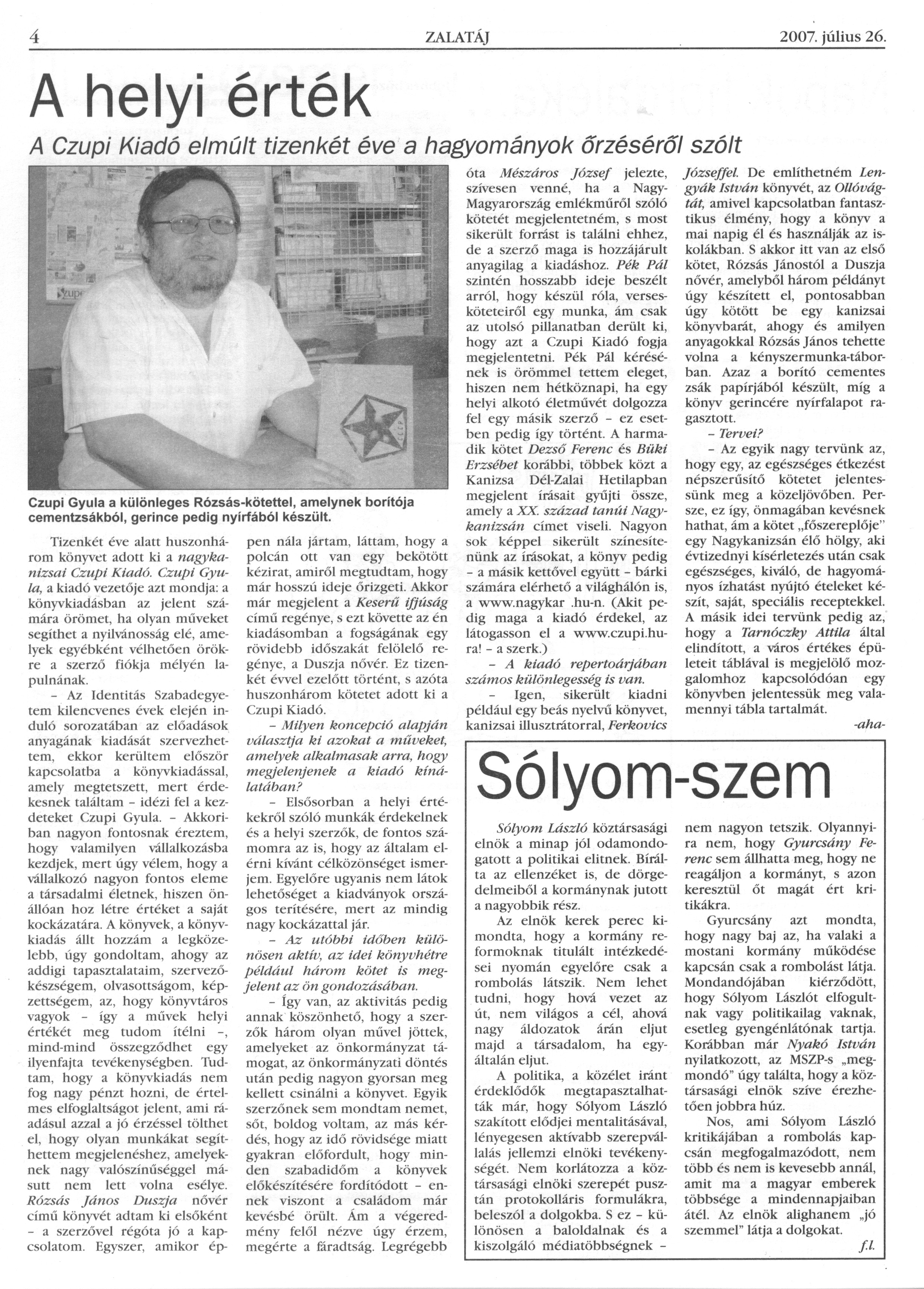 Nyilvános 1278 | 2717 | Zalatáj 2007. július 26. 650. szám 4. oldal | A helyi érték A Czupi Kiadó elmúlt tizenkét éve a hagyományok őrzéséről szólt Czupi Gyula a különleges Rózsás-kötettel, amelynek borítója cementzsákból, gerince pedig nyírfából készült. Tizenkét éve alatt huszonhárom könyvet adott ki a nagykanizsai Czupi Kiadó. Czupi Gyula, a kiadó vezetője azt mondja: a könyvkiadásban az jelent számára örömet, ha olyan műveket segíthet a nyilvánosság elé, amelyek egyébként vélhetően örökre a szerző fiókja mélyén lapulnának. – Az Identitás Szabadegyetem kilencvenes évek elején induló sorozatában az előadások anyagának kiadását szervezhettem, ekkor kerültem először kapcsolatba a könyvkiadással, amely megtetszett, mert érdekesnek találtam – idézi fel a kezdeteket Czupi Gyula. – Akkoriban nagyon fontosnak éreztem, hogy valamilyen vállalkozásba kezdjek, mert úgy vélem, hogy a vállalkozó nagyon fontos eleme a társadalmi életnek, hiszen önállóan hoz létre értéket a saját kockázatára. A könyvek, a könyvkiadás állt hozzám a legközelebb, úgy gondoltam, ahogy az addigi tapasztalataim, szervezőkészségem, olvasottságom, képzettségem, az, hogy könyvtáros vagyok – így a művek helyi értékét meg tudom ítélni –, mind-mind összegződhet egy ilyenfajta tevékenységben. Tudtam, hogy a könyvkiadás nem fog nagy pénzt hozni, de értelmes elfoglaltságot jelent, ami ráadásul azzal a jó érzéssel tölthet el, hogy olyan munkákat segíthettem megjelenéshez, amelyeknek nagy valószínűséggel másutt nem lett volna esélye. Rózsás János Duszja nővér című könyvét adtam ki elsőként – a szerzővel régóta jó a kapcsolatom. Egyszer, amikor éppen nála jártam, láttam, hogy a polcán ott van egy bekötött kézirat, amiről megtudtam, hogy már hosszú ideje őrizgeti. Akkor már megjelent a Keserű ifjúság című regénye, s ezt követte az én kiadásomban a fogságának egy rövidebb időszakát felölelő regénye, a Duszja nővér. Ez tizenkét évvel ezelőtt történt, s azóta huszonhárom kötetet adott ki a Czupi Kiadó. – Milyen koncepció alapján választja ki azokat a műveket, amelyek alkalmasak arra, hogy megjelenjenek a kiadó kínálatában? – Elsősorban a helyi értékekről szóló munkák érdekelnek és a helyi szerzők, de fontos számomra az is, hogy az általam elérni kívánt célközönséget ismerjem. Egyelőre ugyanis nem látok lehetőséget a kiadványok országos terítésére, mert az mindig nagy kockázattal jár. – Az utóbbi időben különösen aktív, az idei könyvhétre például három kötet is megjelent az ön gondozásában. – Így van, az aktivitás pedig annak köszönhető, hogy a szerzők három olyan művel jöttek, amelyeket az önkormányzat támogat, az önkormányzati döntés után pedig nagyon gyorsan meg kellett csinálni a könyvet. Egyik szerzőnek sem mondtam nemet, sőt, boldog voltam, az más kérdés, hogy az idő rövidsége miatt gyakran előfordult, hogy minden szabadidőm a könyvek előkészítésére fordítódott – ennek viszont a családom már kevésbé örült. Ám a végeredmény felől nézve úgy érzem, megérte a fáradtság. Legrégebb óta Mészáros József jelezte, szívesen venné, ha a Nagy-Magyarország emlékműről szóló kötetét megjelentetném, s most sikerült forrást is találni ehhez, de a szerző maga is hozzájárult anyagilag a kiadáshoz. Pék Pál szintén hosszabb ideje beszélt arról, hogy készül róla, versesköteteiről egy munka, ám csak az utolsó pillanatban derült ki, hogy azt a Czupi Kiadó fogja megjelentetni. Pék Pál kérésének is örömmel tettem eleget, hiszen nem hétköznapi, ha egy helyi alkotó életművét dolgozza fel egy másik szerző – ez esetben pedig így történt. A harmadik kötet Dezső Ferenc és Büki Erzsébet korábbi, többek közt a Kanizsa Dél-Zalai Hetilapban megjelent írásait gyűjti össze, amely a XX. század tanúi Nagykanizsán címet viseli. Nagyon sok képpel sikerült színesítenünk az írásokat, a könyv pedig – a másik kettővel együtt – bárki számára elérhető a világhálón is, a www.nagykar.hu-n. (Akit pedig maga a kiadó érdekel, az látogasson el a www.czupi.hu-ra! – a szerk.) – A kiadó repertoárjában számos különlegesség is van. – Igen, sikerült kiadni például egy beás nyelvű könyvet, kanizsai illusztrátorral, Ferkovics Józseffel. De említhetném Lengyák István könyvét, az Ollóvágtát, amivel kapcsolatban fantasztikus élmény, hogy a könyv a mai napig él és használják az iskolákban. S akkor itt van az első kötet, Rózsás Jánostól a Duszja nővér, amelyből három példányt úgy készített el, pontosabban úgy kötött be egy kanizsai könyvbarát, ahogy és amilyen anyagokkal Rózsás János tehette volna a kényszermunka-táborban. Azaz a borító cementes zsák papírjából készült, míg a könyv gerincére nyírfalapot ragasztott. – Tervei? – Az egyik nagy tervünk az, hogy egy, az egészséges étkezést népszerűsítő kötetet jelentessünk meg a közeljövőben. Persze, ez így, önmagában kevésnek hathat, ám a kötet „főszereplője” egy Nagykanizsán élő hölgy, aki évtizednyi kísérletezés után csak egészséges, kiváló, de hagyományos ízhatást nyújtó ételeket készít, saját, speciális receptekkel. A másik idei tervünk pedig az, hogy a Tarnóczky Attila által elindított, a város értékes épületeit táblával is megjelölő mozgalomhoz kapcsolódóan egy könyvben jelentessük meg valamennyi tábla tartalmát. -aha- |