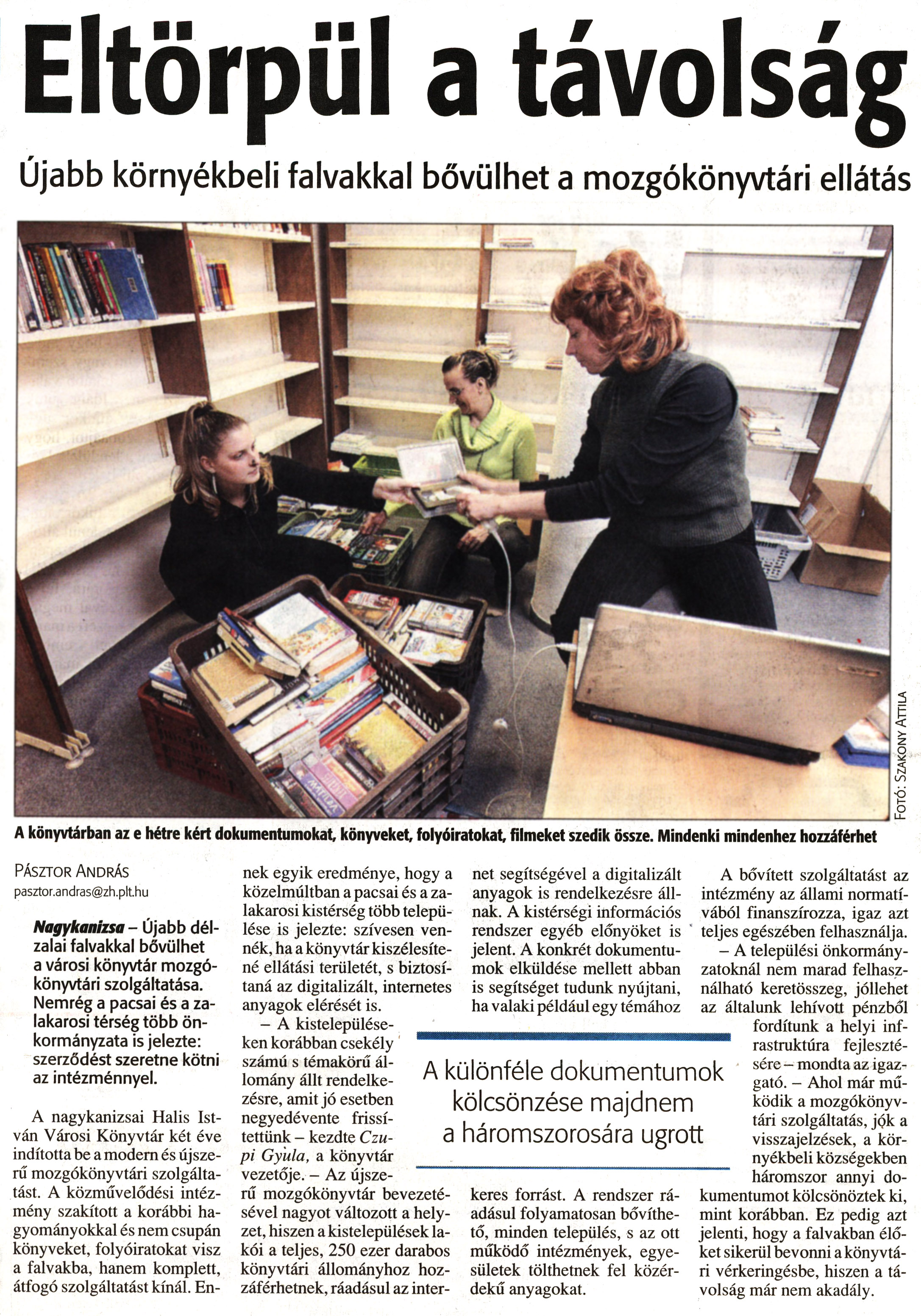 Nyilvános 1590 | 3173 | Zalai Hírlap 2008 02 05 030sz 14old - Eltörpül a távolság | A következő szöveg a cikkből keletkezett automata szövegfelismertetés segítségével: Eltörpül a távolság Újabb környékbeli falvakkal bővülhet a mozgókönyvtári ellátás •o A könyvtárban az e hétre kért dokumentumokat könyveket, folyóiratokat filmeket szedik össze. Mindenki mindenhez hozzáférhet A különféle dokumentumok kölcsönzése majdnem a háromszorosára ugrott PÁSZTOR ANDRÁS pasztor.andras@zh.plt.hu Nagykanizsa - Újabb délzalai falvakkal bővülhet a városi könyvtár mozgókönyvtári szolgáltatása. Nemrég a pacsai és a za-lakarosi térség több önkormányzata is jelezte: szerződést szeretne kötni az intézménnyel. A nagykanizsai Halis István Városi Könyvtár két éve indította be a modern és újszerű mozgókönyvtári szolgáltatást. A közművelődési intézmény szakított a korábbi hagyományokkal és nem csupán könyveket, folyóiratokat visz a falvakba, hanem komplett, átfogó szolgáltatást kínál. En- nek egyik eredménye, hogy a közelmúltban a pacsai és a za-lakarosi kistérség több települése is jelezte: szívesen vennék, ha a könyvtár kiszélesítené ellátási területét, s biztosítaná az digitalizált, internetes anyagok elérését is. - A kistelepülése- ___ ken korábban csekély számú s témakörű állomány állt rendelkezésre, amit jó esetben negyedévente frissítettünk - kezdte Czu-pi Gyula, a könyvtár vezetője. - Az újsze-rű mozgókönyvtár bevezetésével nagyot változott a helyzet, hiszen a kistelepülések lakói a teljes, 250 ezer darabos könyvtári állományhoz hozzáférhetnek, ráadásul az inter- net segítségével a digitalizált anyagok is rendelkezésre állnak. A kistérségi információs rendszer egyéb előnyöket is jelent. A konkrét dokumentumok elküldése mellett abban is segítséget tudunk nyújtani, ha valaki például egy témához keres forrást. A rendszer ráadásul folyamatosan bővíthető, minden település, s az ott működő intézmények, egyesületek tölthetnek fel közérdekű anyagokat. A bővített szolgáltatást az intézmény az állami normatívából finanszírozza, igaz azt teljes egészében felhasználja. - A települési önkormányzatoknál nem marad felhasználható keretösszeg, jóllehet az általunk lehívott pénzből ^^ fordítunk a helyi infrastruktúra fejlesztésére — mondta az igazgató. - Ahol már működik a mozgókönyvtári szolgáltatás, jpk a visszajelzések, a környékbeli községekben háromszor annyi dokumentumot kölcsönöztek ki, mint korábban. Ez pedig azt jelenti, hogy a falvakban élőket sikerül bevonni a könyvtári vérkeringésbe, hiszen a távolság már nem akadály. |